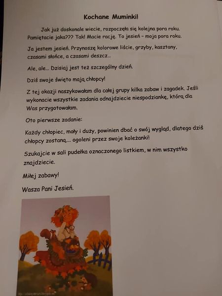 Dziś Muminki otrzymały list od Pani Jesieni, która przygotowała dla Nich zabawy i zagadki z okazji Dnia Chłopaka.
