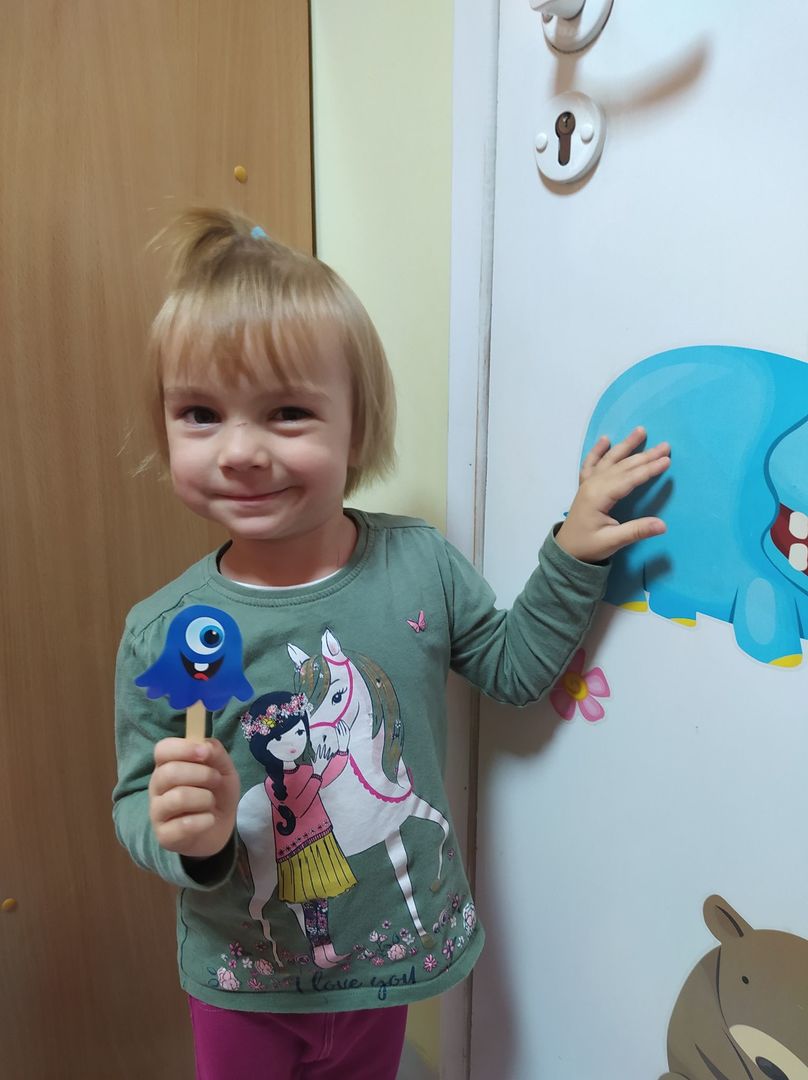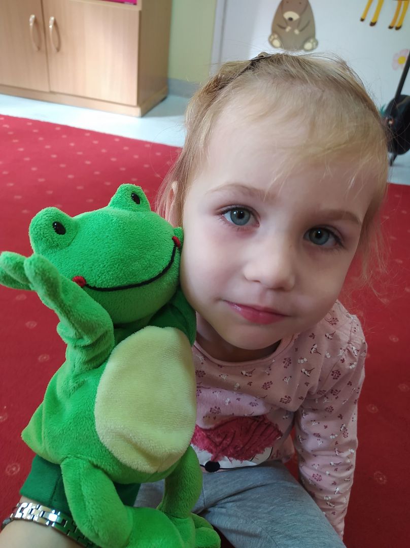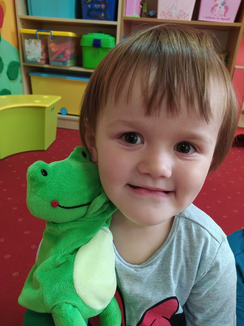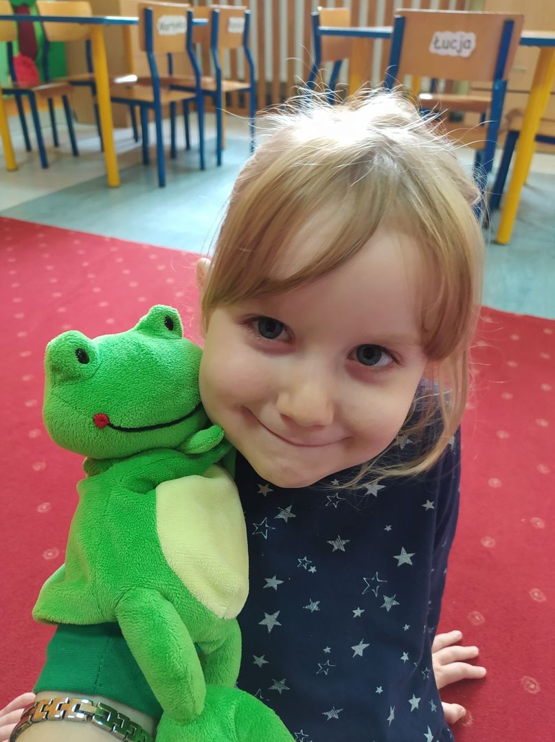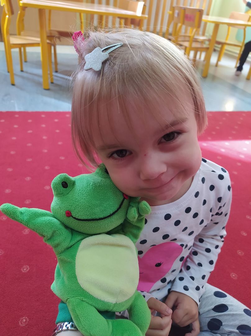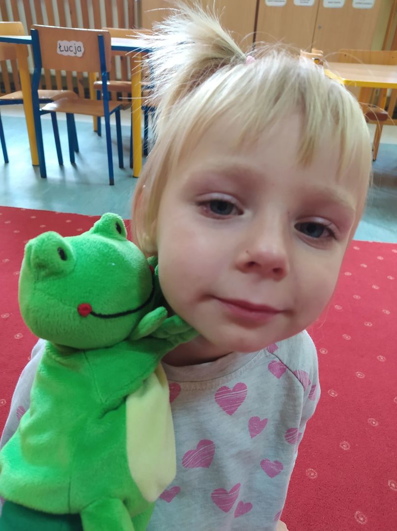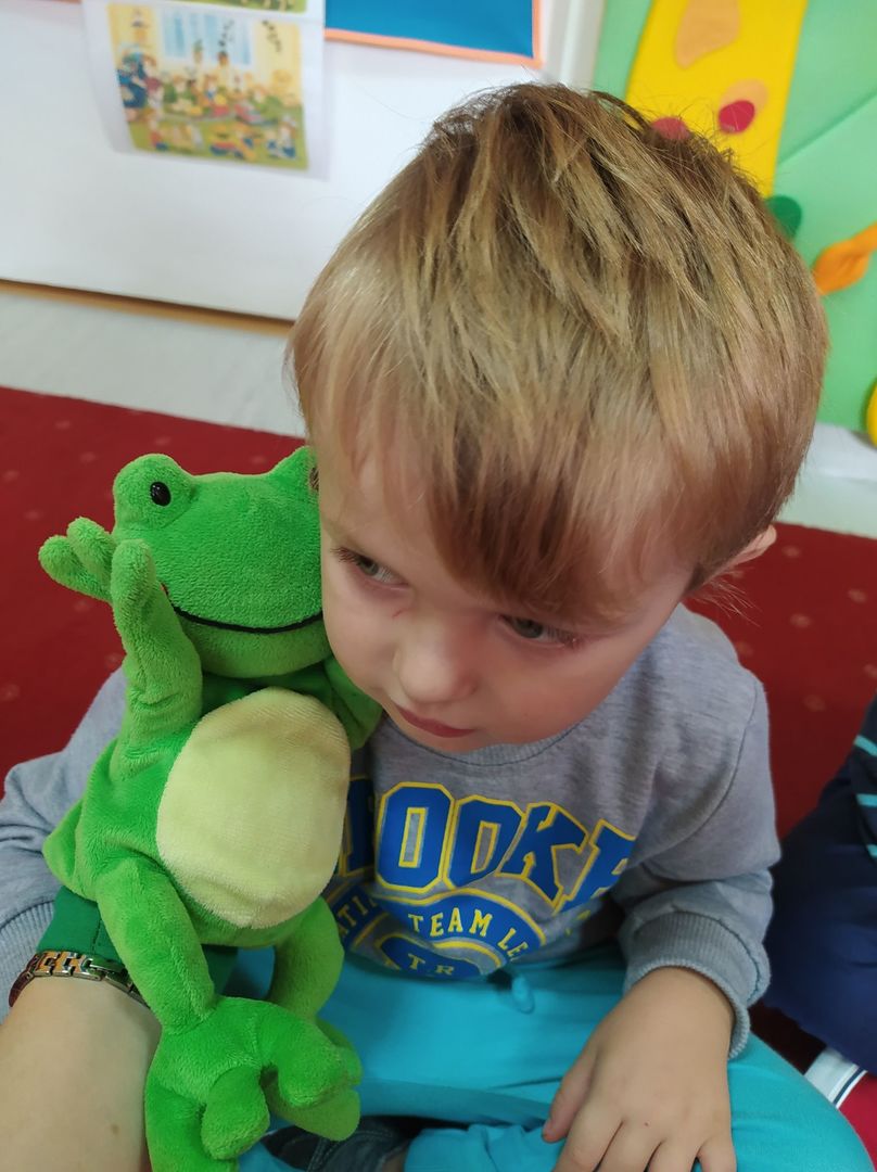 Nowa podstawa programowa wychowania przedszkolnego nakłada na przedszkola obowiązek włączenia zajęć z języka obcego w ramy dnia przedszkolnego. W naszej grupie w świat języka angielskiego dzieci zabiera pacynka żabki Polly. Żabka w każdym miesiącu, zaznajamiać będzie Smerfy z różnymi zwrotami, piosenkami, wyliczankami, zabawami w języku angielskim. Mieszka ona w naszej sali, a dzieci kiedy tylko chcą mogą zaprosić ją do wspólnej zabawy. W miesiącu październiku Polly nauczyła nasze maluszki witać się i żegnać, zaprezentowała im znaczenie kilku czasowników (wstać, siąść, bić brawo, tupać, obracać się, uśmiechać się, przybijać piątkę) lecz przede wszystkim zaprosiła je do świata kolorów.