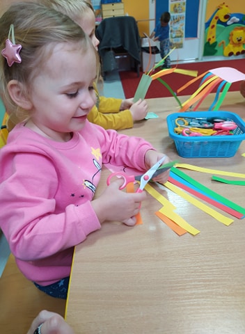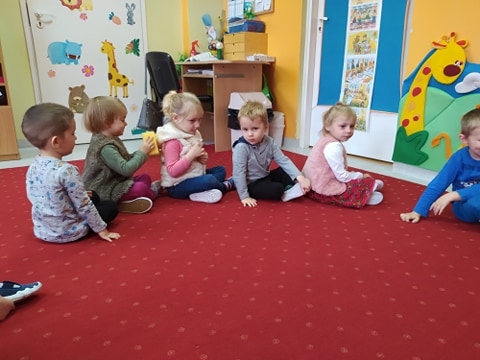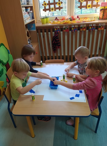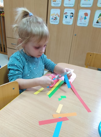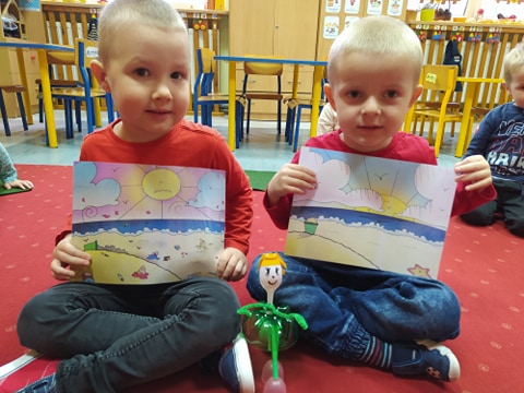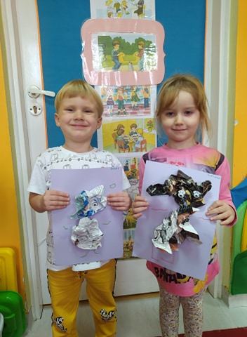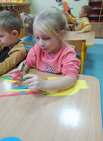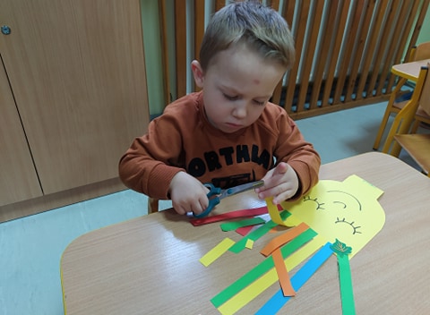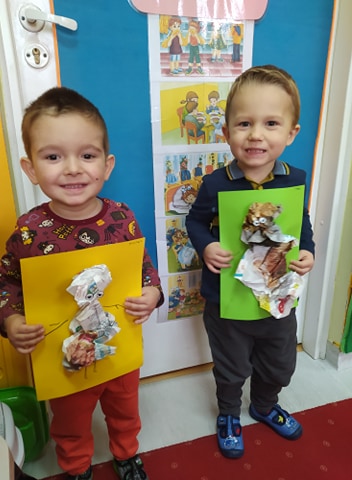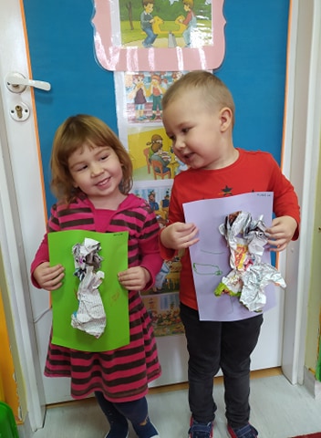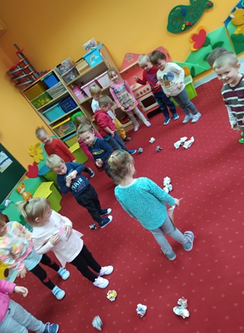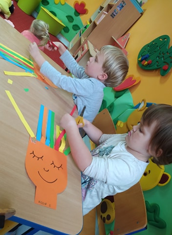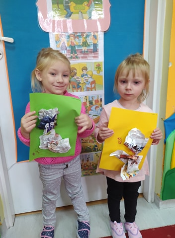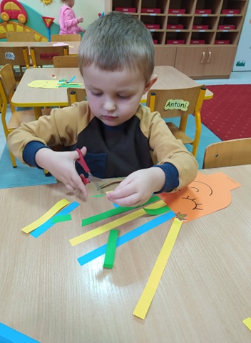 Najpierw obejrzeliśmy ekologiczną bajkę na podstawie której dzieci określały, gdzie jest milej odpoczywać (na zaśmieconej czy czystej plaży, na zaśmieconej czy czystej łące) . Potem poznaliśmy gazetowe zabawy (formowanie i podrzucanie kul, gra na gazetach, darcie gazet) i wykonaliśmy podobizny Ekoludka. Jakby tego było mało poznaliśmy również nowe narzędzie jakim są nożyczki. W tych pierwszych próbach cięcia nimi pomogły nam narysowane na kciukach sylwetki księżniczek i rycerzy. To dzięki nim powstały tak fantazyjne fryzury Pani Jesieni.