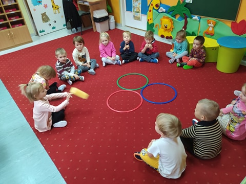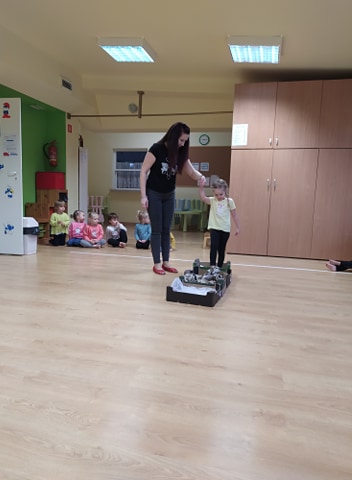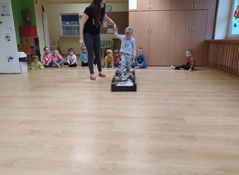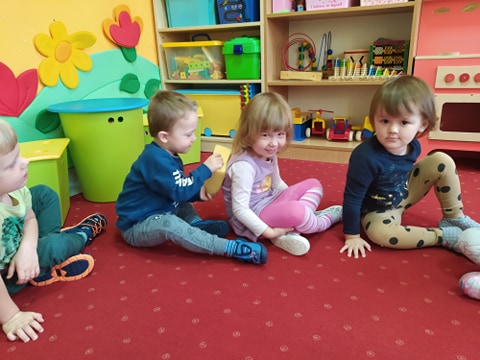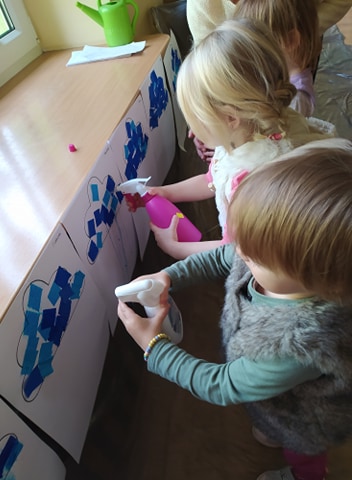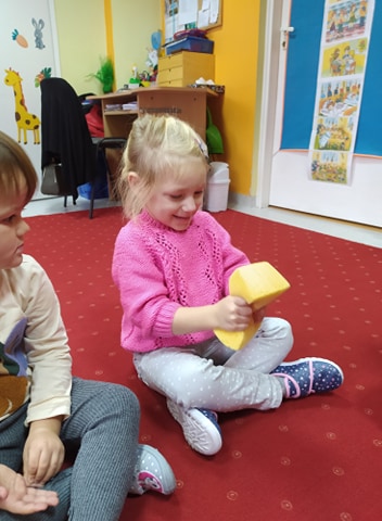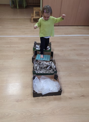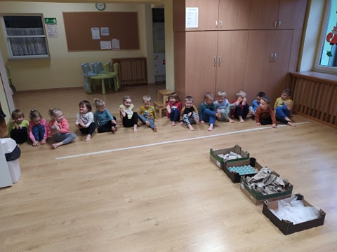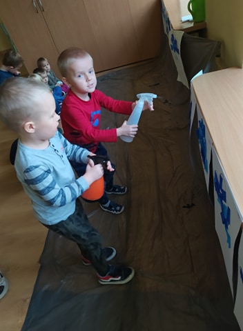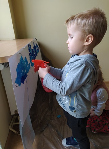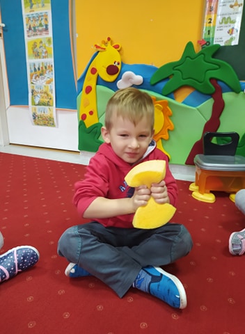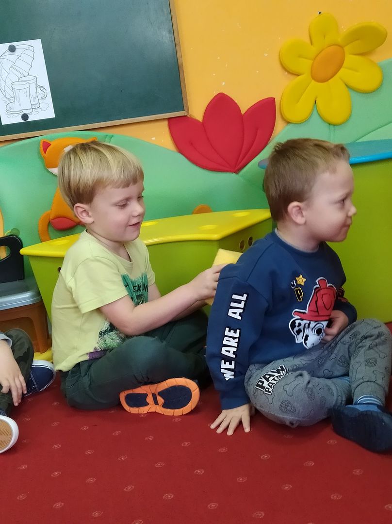 Następnie wybraliśmy się na spacer po ekologicznej ścieżce sensorycznej, nauczyliśmy się gry w domino oraz sami wyczarowaliśmy deszcz, lecz chyba najwięcej uśmiechów wywołały zabawy z gąbką (rzut do celu i masaż pleców).