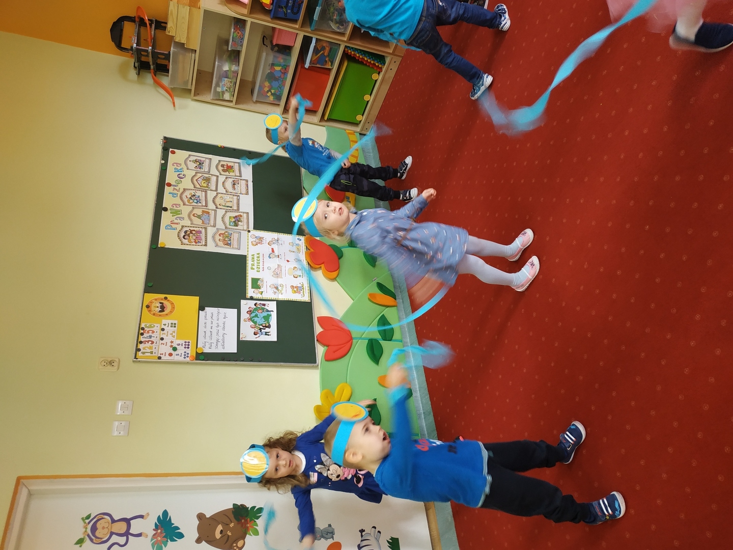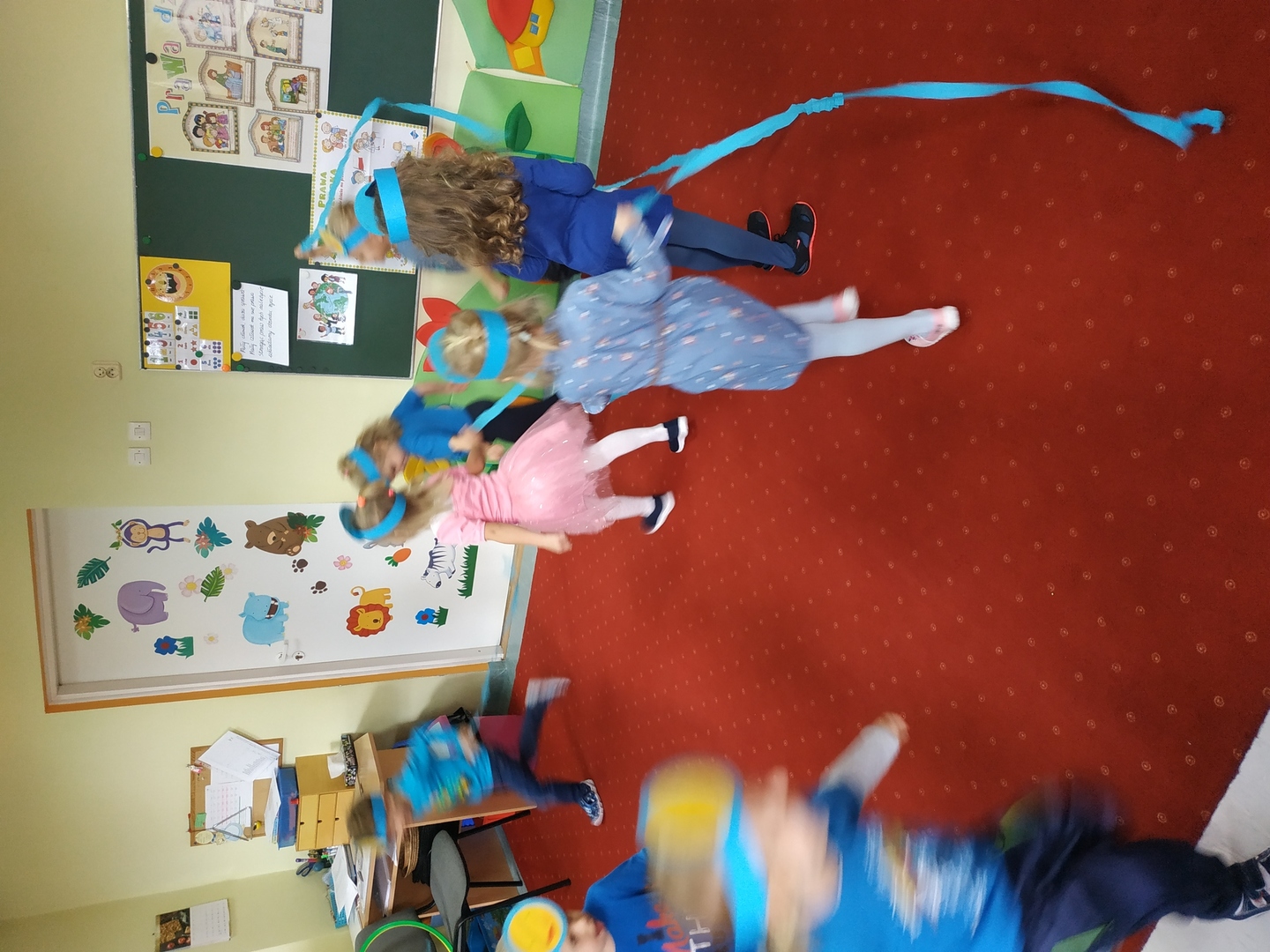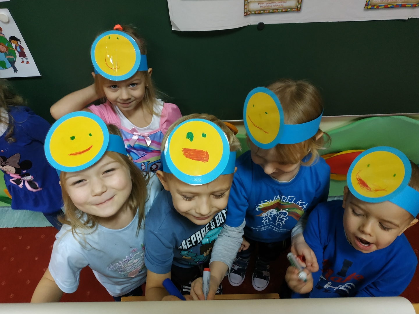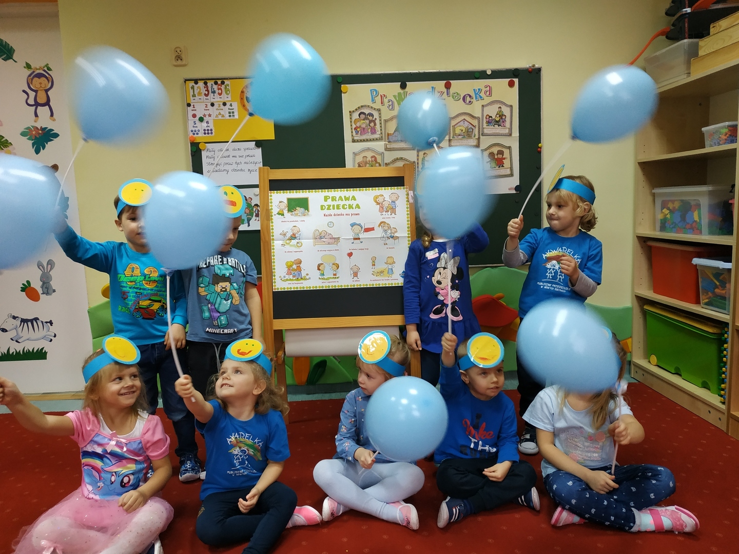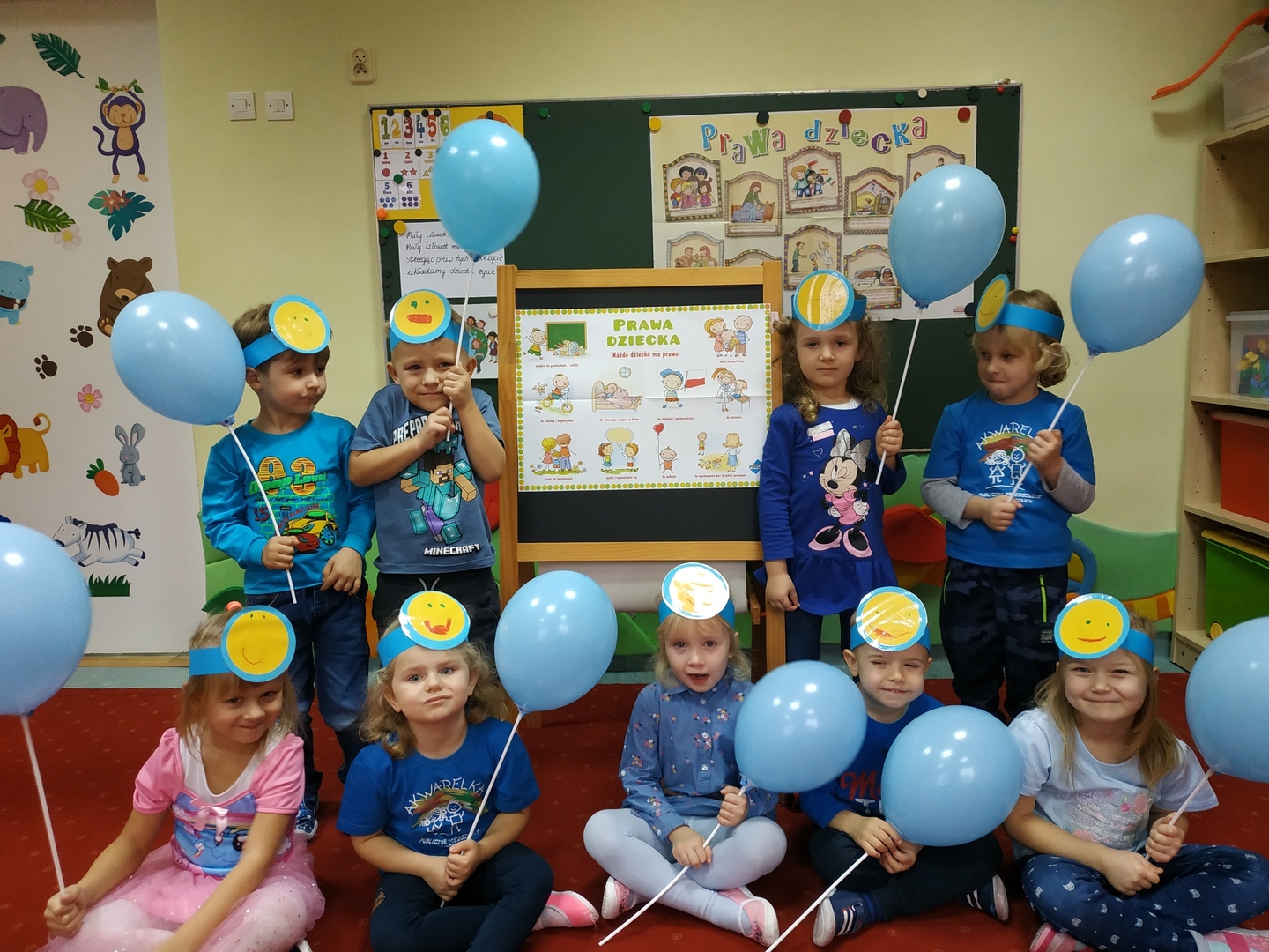 20 listopada przedszkolaki z grupy Gumisiów, wyrażając solidarność ze wszystkimi dziećmi na świecie, przyszły do przedszkola ubrane na niebiesko. Podczas zajęć uczyły się o tym, jakie mają prawa, a także rozpoznawały i nazywały emocje, budząc tym samym swoją wrażliwość na krzywdę drugiego człowieka. Wszystkie dzieci zgodnie stwierdziły, że „najfajniej jest być wesołym” :-) i jednomyślnie udekorowały swoje opaski własnoręcznie narysowanymi buźkami. Tego dnia zabawom i pląsom towarzyszył kolor niebieski nawiązujący do organizacji UNICEF, która jest pomysłodawcą wielu inicjatyw na rzecz dzieci na całym świecie.