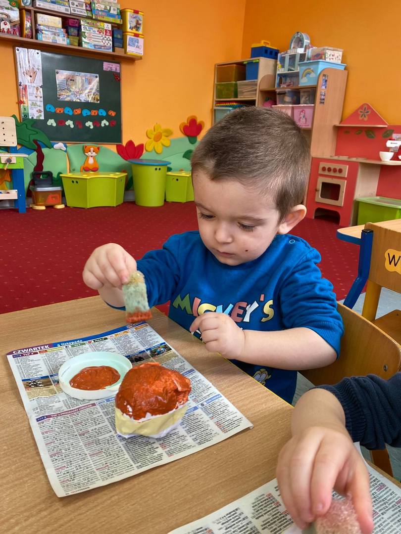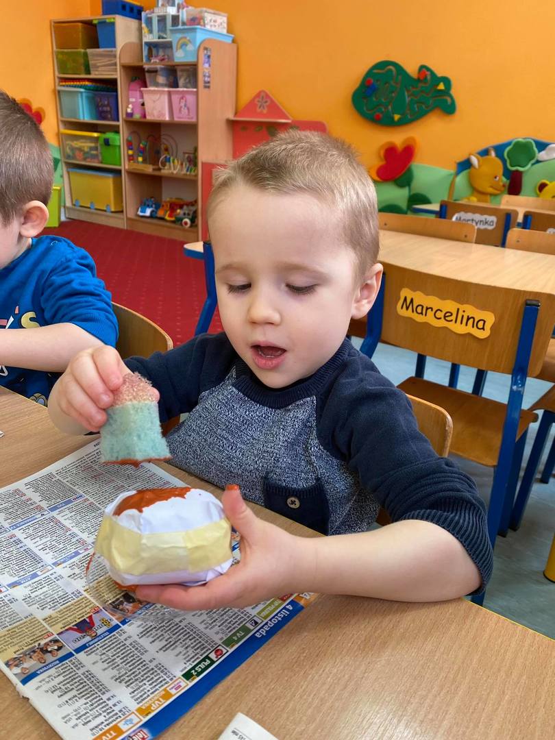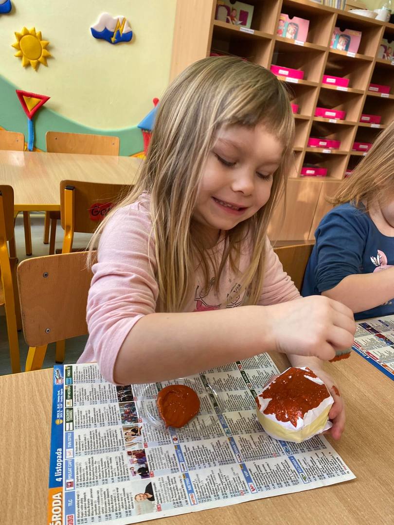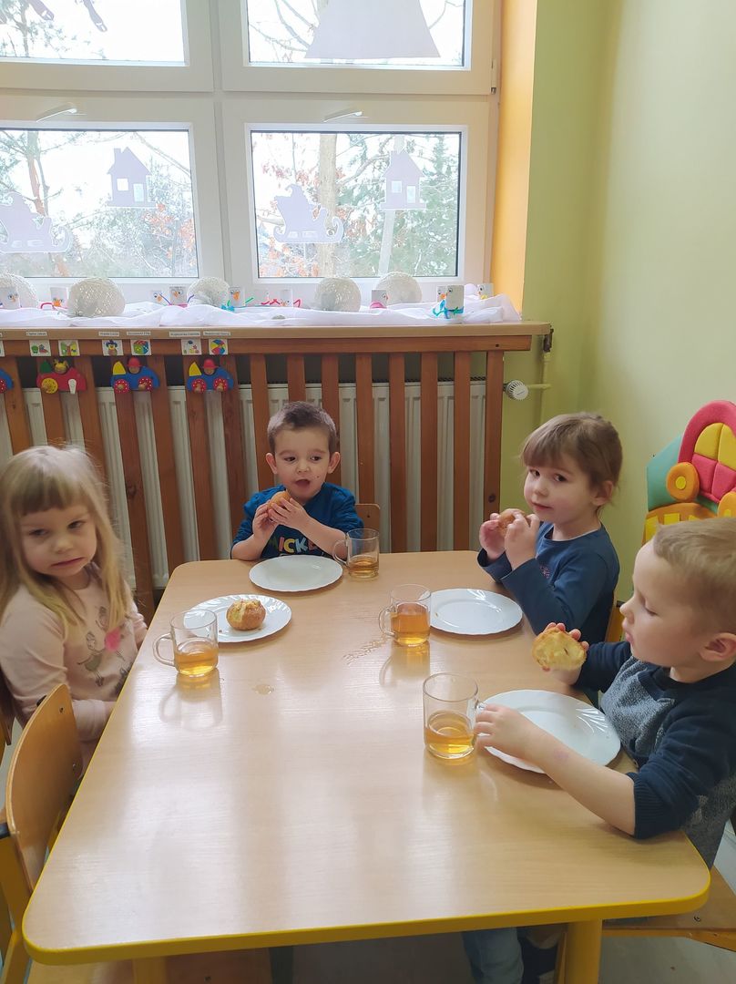 Tak też zrobiły dzieci z grupy Smerfy. Uśmiechy towarzyszyły im przez cały dzień. I nawet mała frekwencja nie przeszkodziła w świetnej zabawie. Dzieci poznały różne rodzaje pączków, odwzorowywały pączkowe rytmy, a także własnoręcznie wykonały piękne pączki. Na koniec dnia odbyła się słodka uczta, której bohaterem był oczywiście lukrowany, pudrowany, nadziewany pączek. Przedszkolaki z ogromną radością spałaszowały pyszne pączki z dżemem.