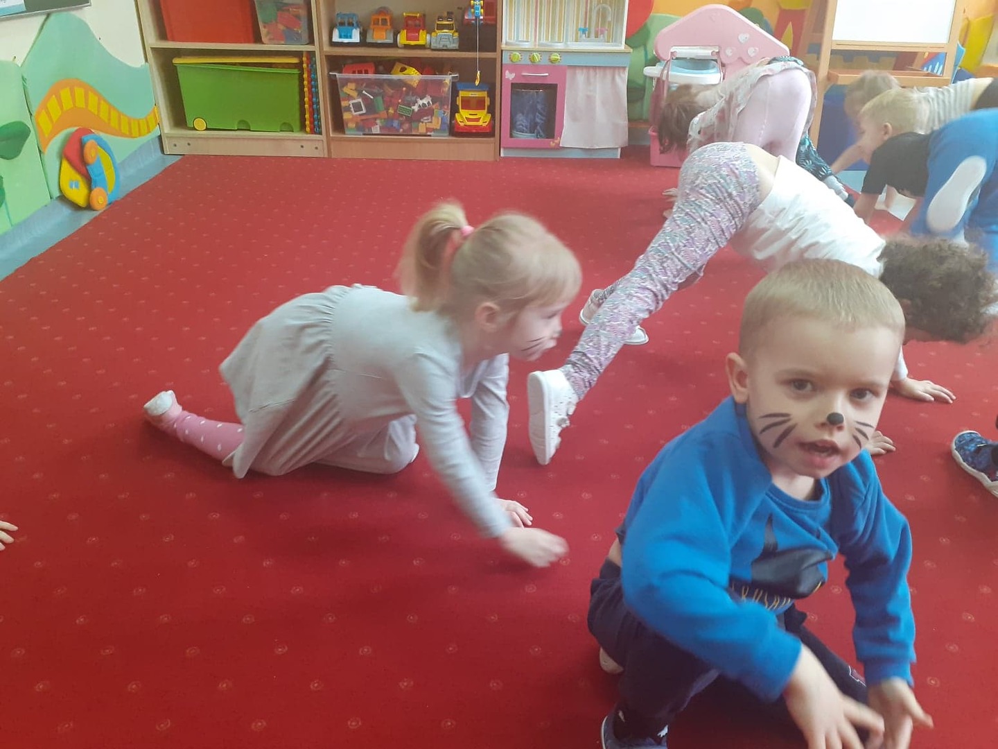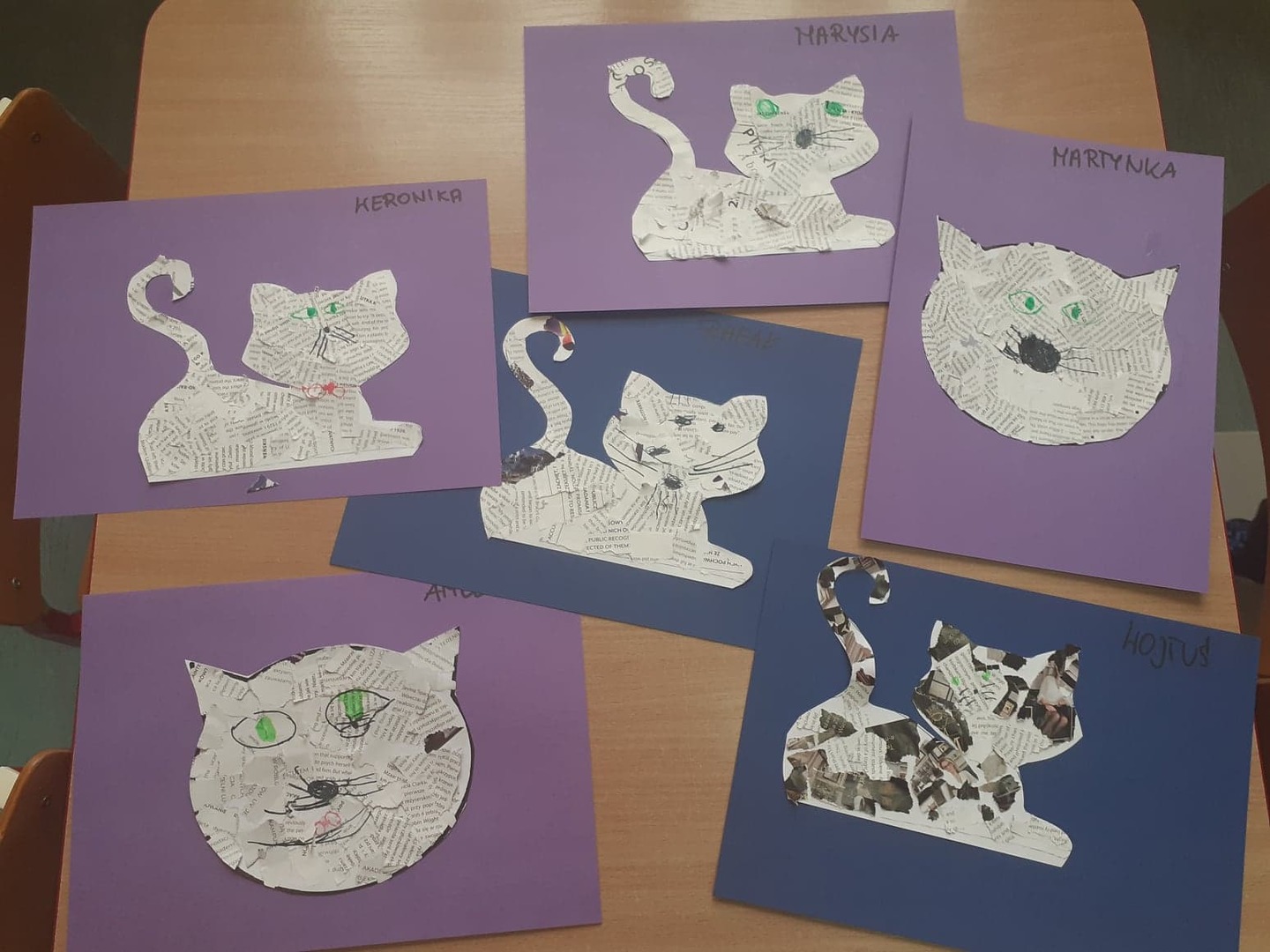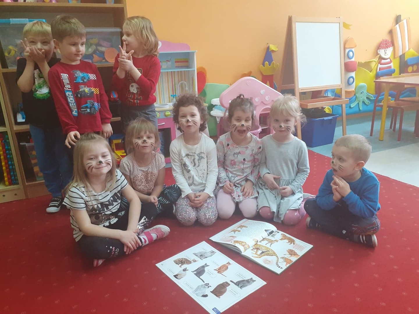 Przedszkolaki zamieniły się tego dnia w kociaki i wzięły udział w kocich zabawach. Z zainteresowaniem oglądały ilustracje różnych kotów, rozwiązywały zagadki, słuchały bajki ” Kot w butach”, aktywnie uczestniczyły w zabawie w formie opowieści ruchowej miaucząc, robiąc koci grzbiet, mrucząc i chlipiąc mleczko, a także wykonały piękne prace plastyczne. Wspólnie poznawaliśmy ciekawostki o kotach, jak również opowiadaliśmy o swoich domowych kocich przyjaciołach.