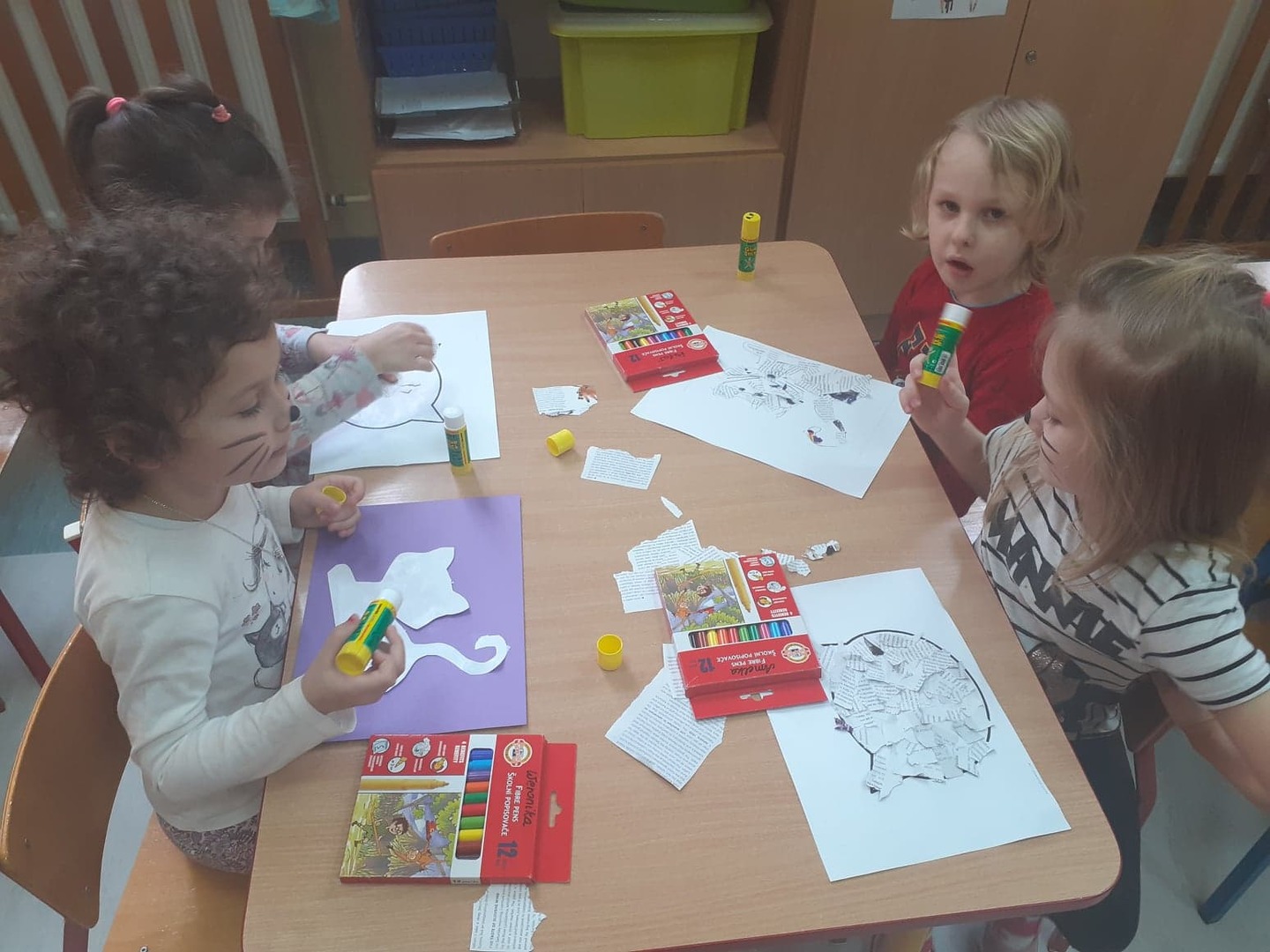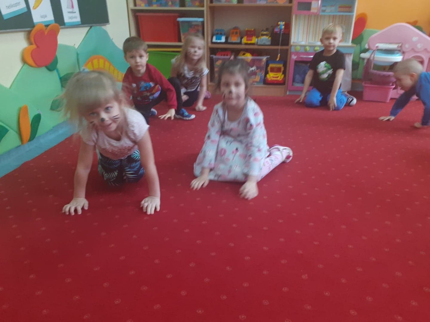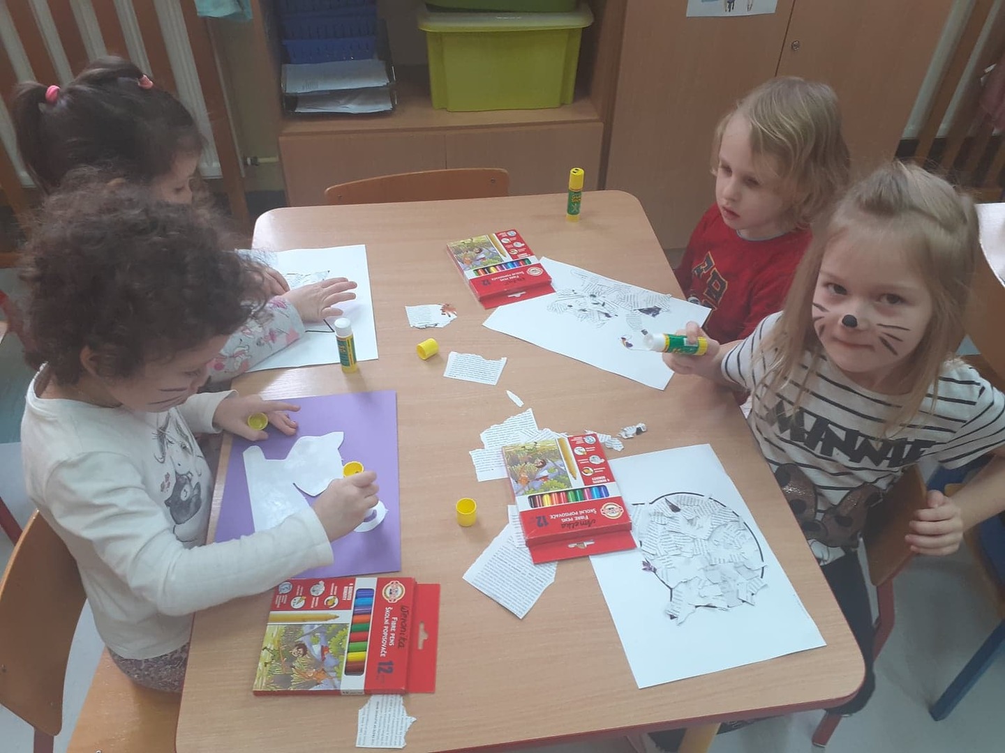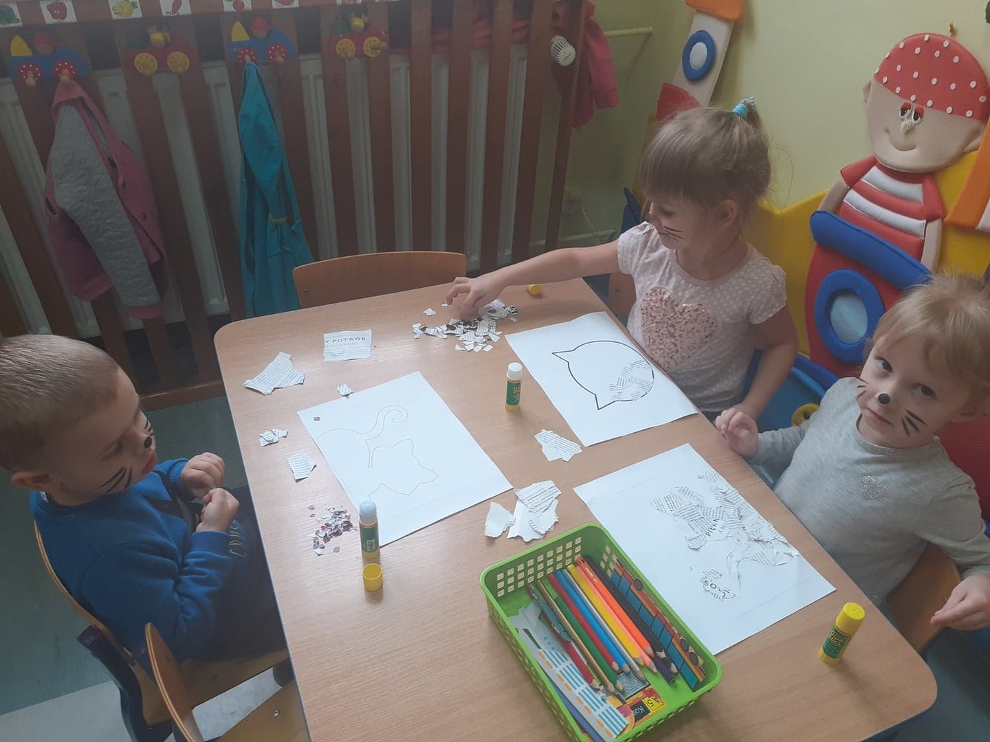Przedszkolaki zamieniły się tego dnia w kociaki i wzięły udział w kocich zabawach. Z zainteresowaniem oglądały ilustracje różnych kotów, rozwiązywały zagadki, słuchały bajki ” Kot w butach”, aktywnie uczestniczyły w zabawie w formie opowieści ruchowej miaucząc, robiąc koci grzbiet, mrucząc i chlipiąc mleczko, a także wykonały piękne prace plastyczne. Wspólnie poznawaliśmy ciekawostki o kotach, jak również opowiadaliśmy o swoich domowych kocich przyjaciołach.