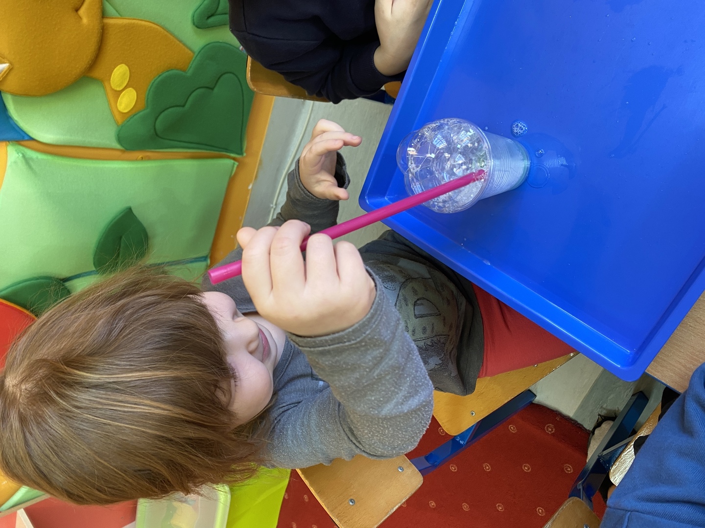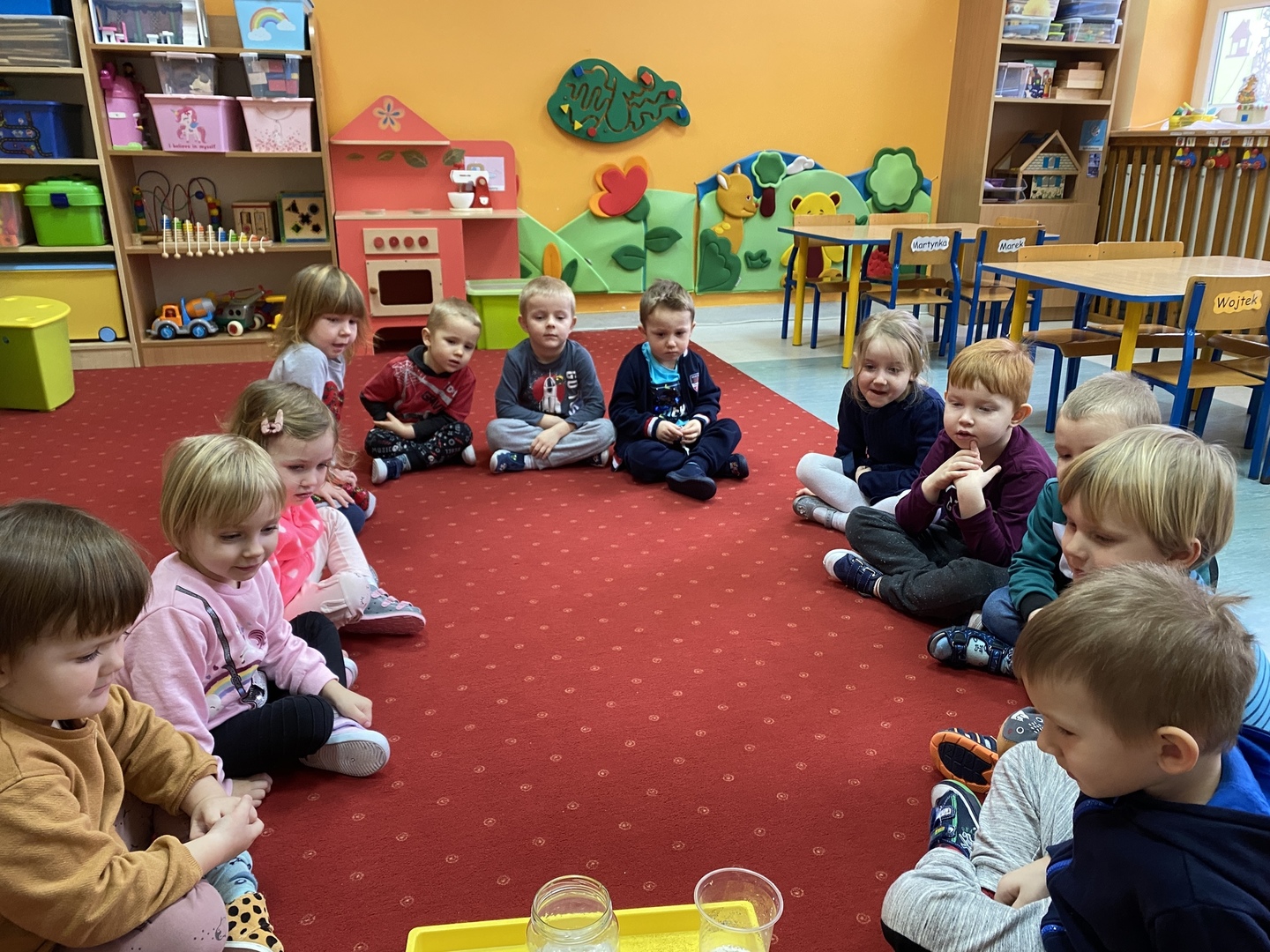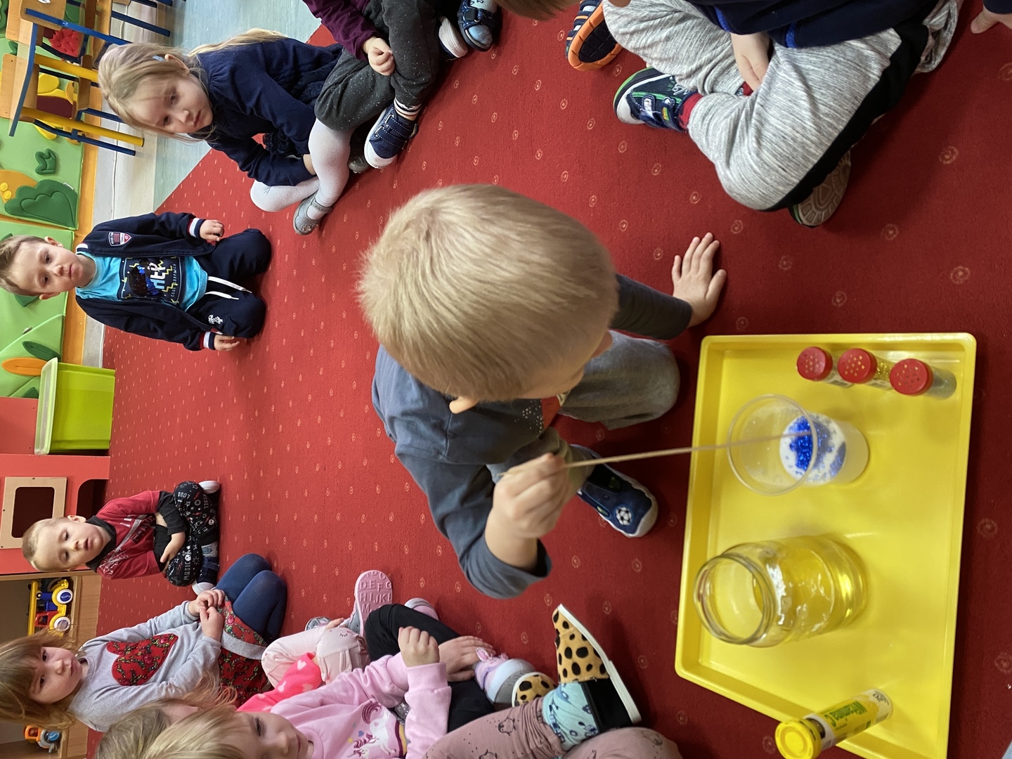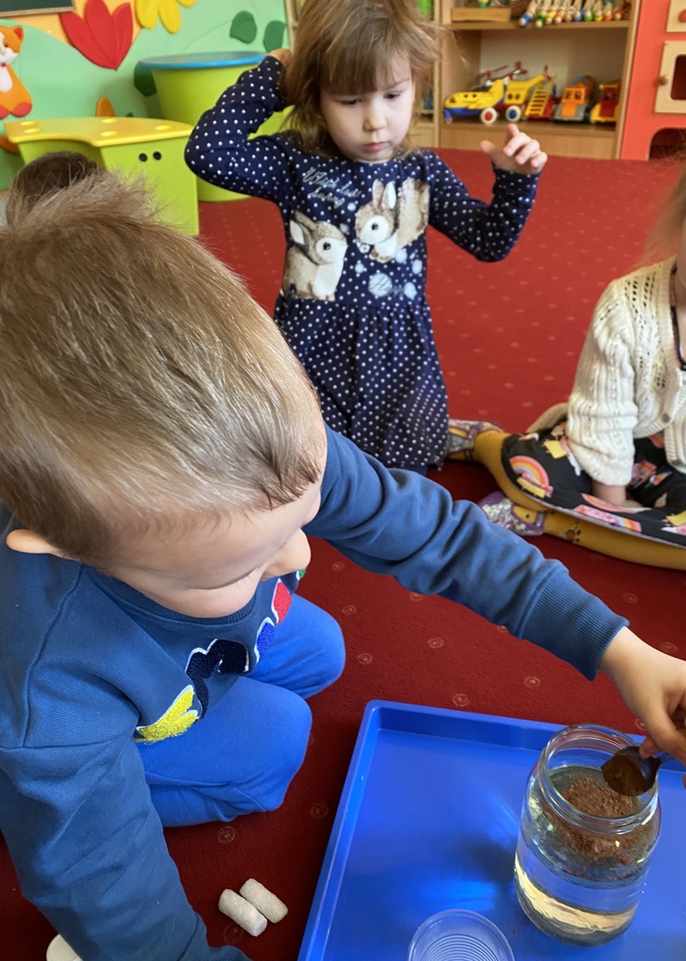 Dzieci z grupy Smerfy poznały cztery żywioły, do których należy: ziemia, woda, ogień, powietrze. W jak najlepszym zrozumieniu ich znaczenia oraz właściwości pomogły im liczne eksperymenty („Siła wiatru”, „Wędrująca woda”, „Świeca też potrzebuje powietrza”, „Czary mary octu i sody”, „Burza, wichura, tornado”, „Jak zobaczyć powietrze?”, „Woda”), oglądanie książeczek o żywiołach, zabawy tematyczne (rozdmuchiwanie bibuły i piórek, rysowanie wodą i opalonym drewnem, puszczanie i robienie baniek mydlanych, gra „Żywioły”- memory, układanie rytmów, puszczanie łódek na wodzie, łowienie rybek, poznanie instrumentów muzycznych połączone z łączeniem skojarzeń usłyszanych dźwięków z żywiołami). Wprowadzone zostały plansze do kodowania rozwijające umiejętność rozumienia i posługiwania się pojęciami: na górze, na dole, nad, obok, pod. Dzieci miały możliwość obejrzenia różnych rodzajów świec i świeczek. Zapoznania z zasadami bezpieczeństwa w przypadku zagrożeń związanych z żywiołami. Smerfy poznały również nowe techniki plastyczne, rozwijając w ten sposób sprawność manualną oraz wyobraźnie. Wykonały prace pt. „Żywioły” poprzez rozdmuchiwanie słomką farby i samodzielne tworzenie stworków. Dużą radość sprawiła dzieciom możliwość wykonania butelek sensorycznych, wypełnionych wodą, brokatem i cekinami.