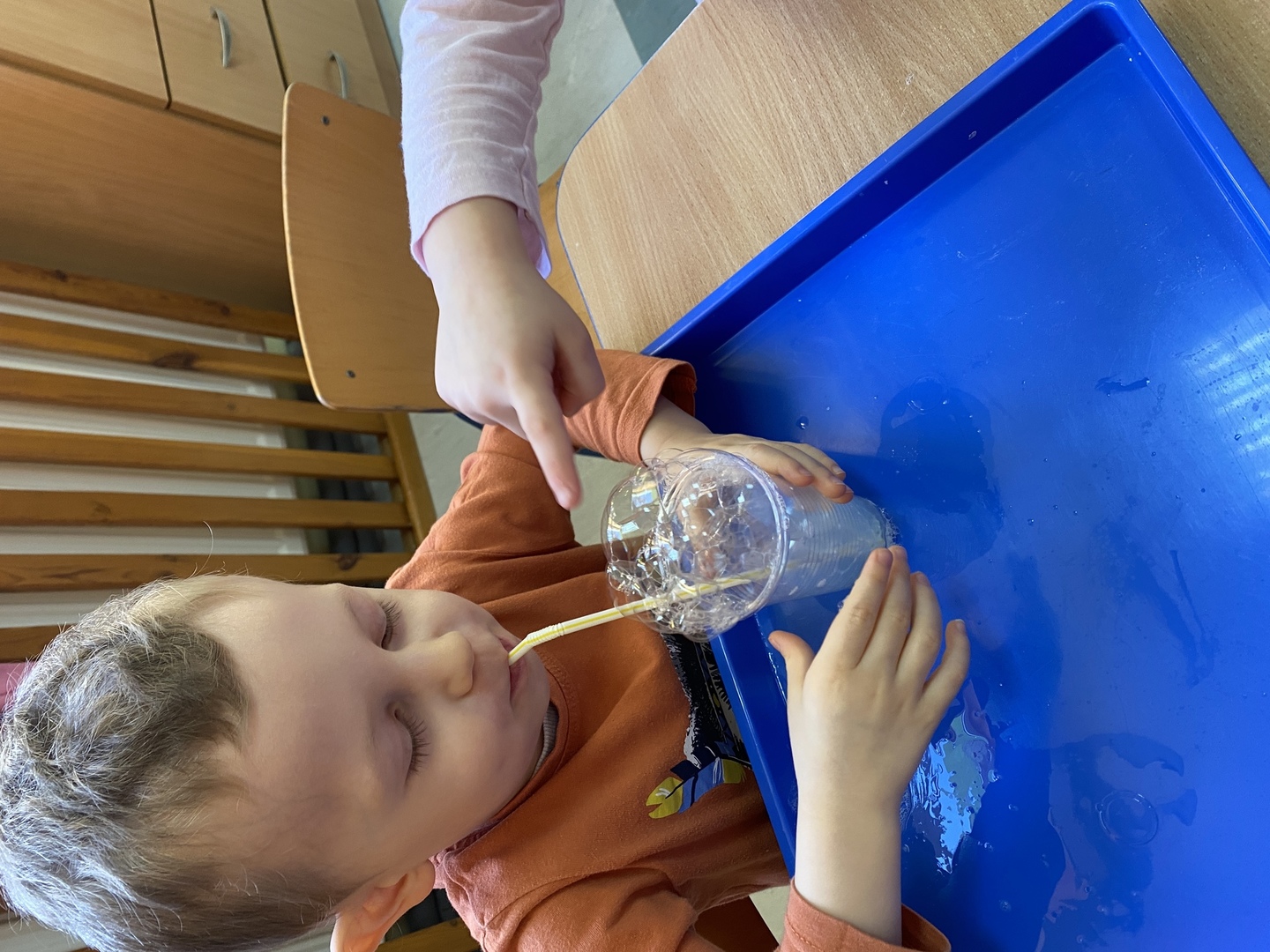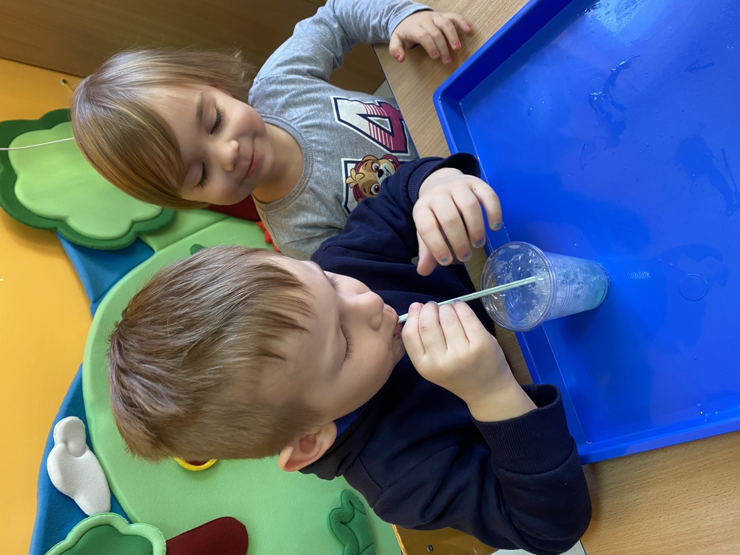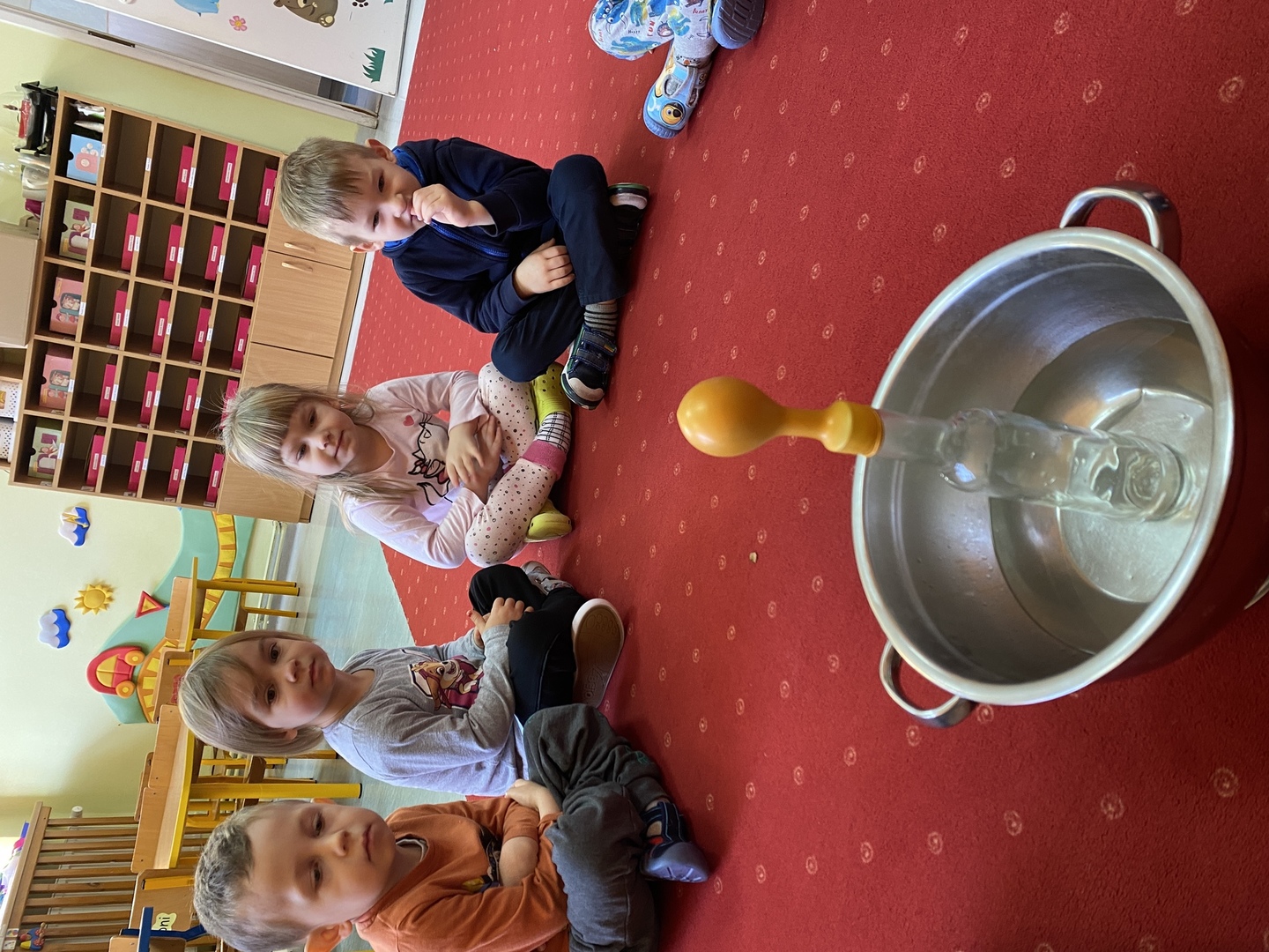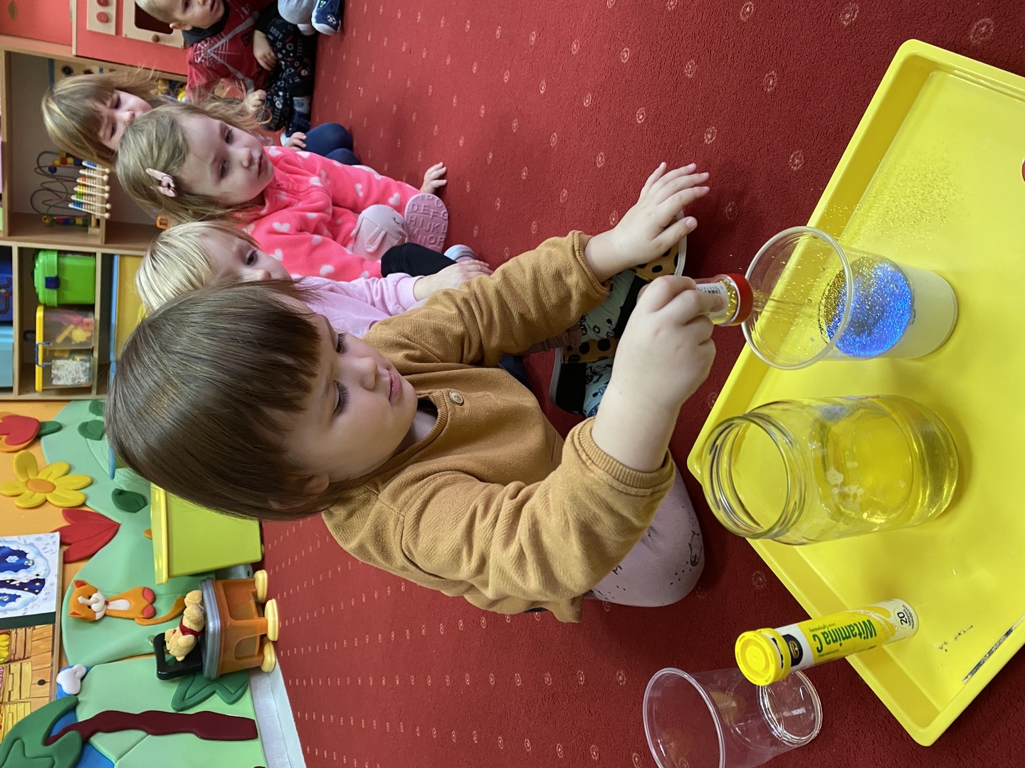 Dzieci z grupy Smerfy poznały cztery żywioły, do których należy: ziemia, woda, ogień, powietrze. W jak najlepszym zrozumieniu ich znaczenia oraz właściwości pomogły im liczne eksperymenty („Siła wiatru”, „Wędrująca woda”, „Świeca też potrzebuje powietrza”, „Czary mary octu i sody”, „Burza, wichura, tornado”, „Jak zobaczyć powietrze?”, „Woda”), oglądanie książeczek o żywiołach, zabawy tematyczne (rozdmuchiwanie bibuły i piórek, rysowanie wodą i opalonym drewnem, puszczanie i robienie baniek mydlanych, gra „Żywioły”- memory, układanie rytmów, puszczanie łódek na wodzie, łowienie rybek, poznanie instrumentów muzycznych połączone z łączeniem skojarzeń usłyszanych dźwięków z żywiołami). Wprowadzone zostały plansze do kodowania rozwijające umiejętność rozumienia i posługiwania się pojęciami: na górze, na dole, nad, obok, pod. Dzieci miały możliwość obejrzenia różnych rodzajów świec i świeczek. Zapoznania z zasadami bezpieczeństwa w przypadku zagrożeń związanych z żywiołami. Smerfy poznały również nowe techniki plastyczne, rozwijając w ten sposób sprawność manualną oraz wyobraźnie. Wykonały prace pt. „Żywioły” poprzez rozdmuchiwanie słomką farby i samodzielne tworzenie stworków. Dużą radość sprawiła dzieciom możliwość wykonania butelek sensorycznych, wypełnionych wodą, brokatem i cekinami.