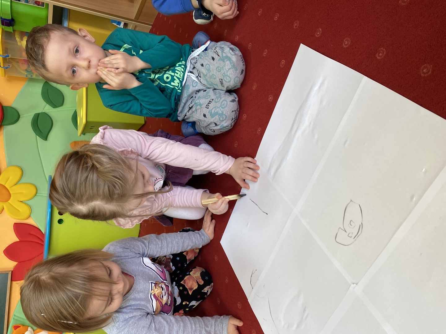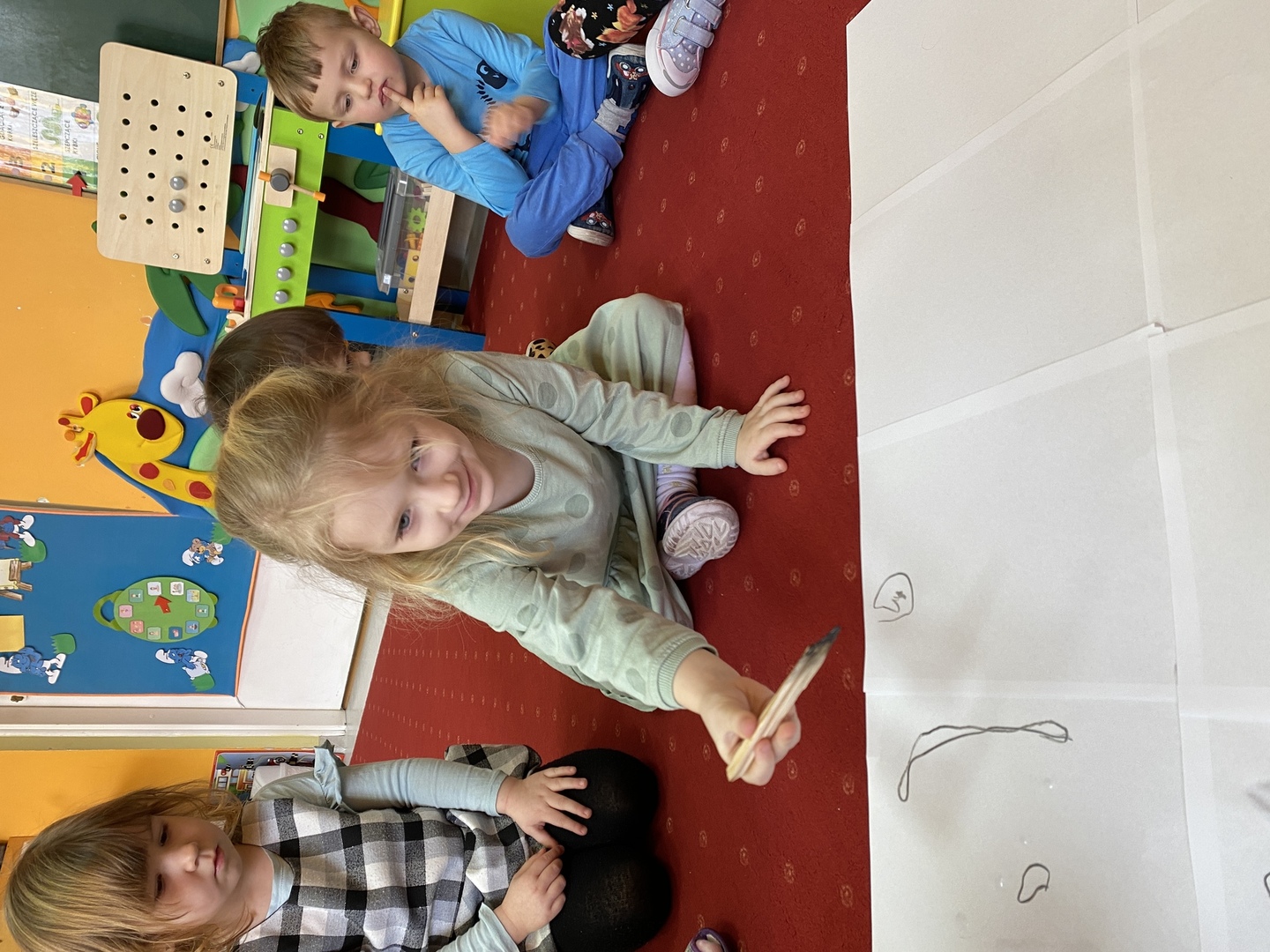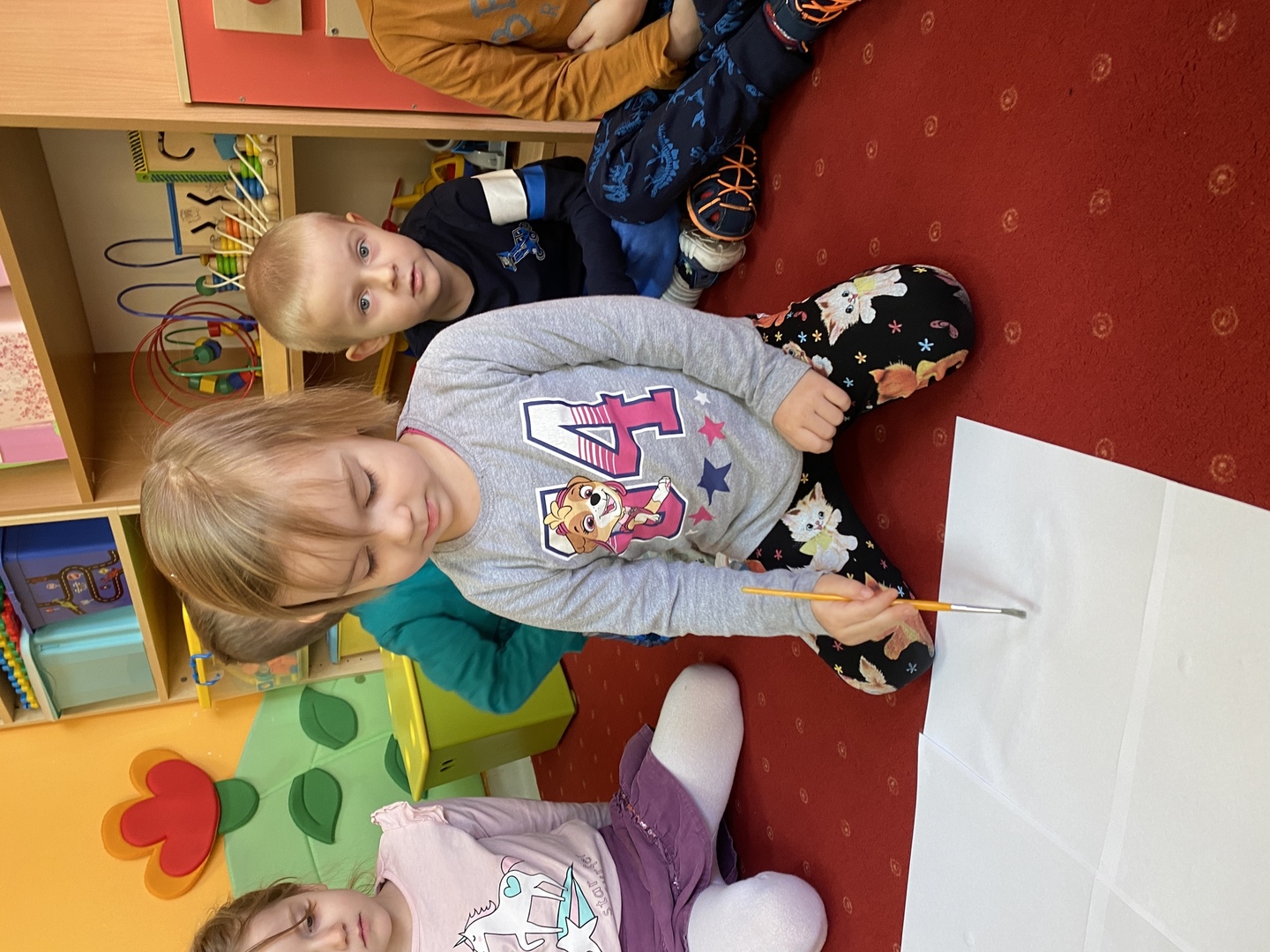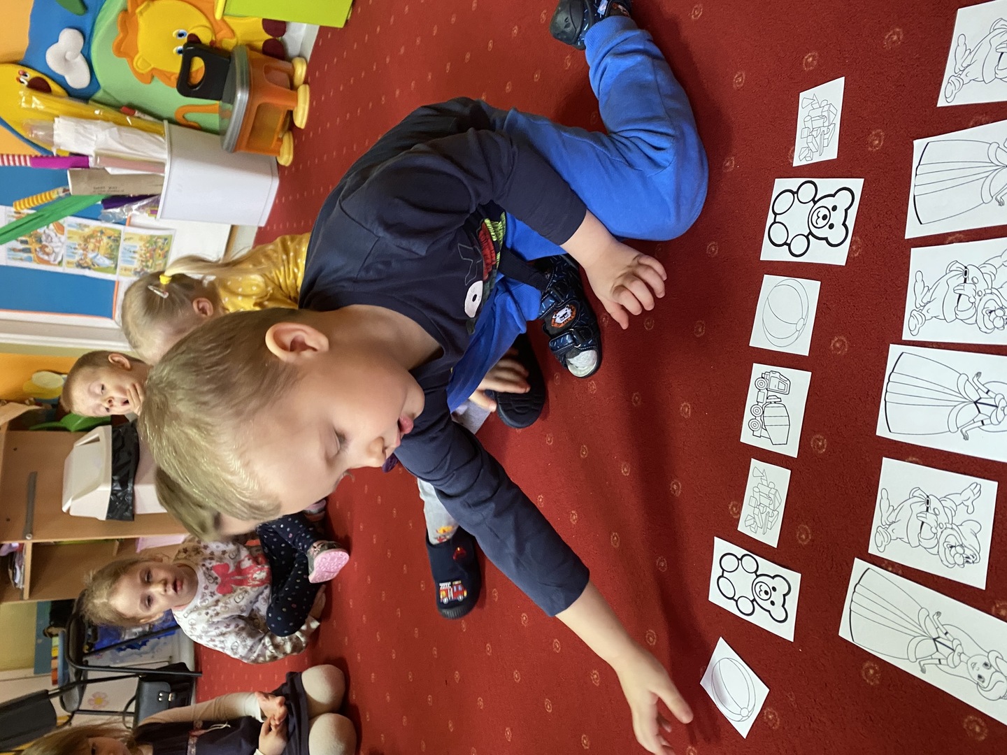 Nie obyło się również bez tak potrzebnych w wieku przedszkolnym zabaw ruchowych i gimnastycznych. Maluchy miały możliwość wcielić się w strażaków gaszących „ogień”. Brały udział w zabawach: w kole, z chustą animacyjną oraz muzyczno-ruchowych do znanych piosenek dziecięcych. Poruszały się po ścieżce sensorycznej stymulującej zmysł dotyku. Ćwiczyły z woreczkami wypełnionymi ziarenkami rozwijającymi skoczność, zwinność i równowagę.