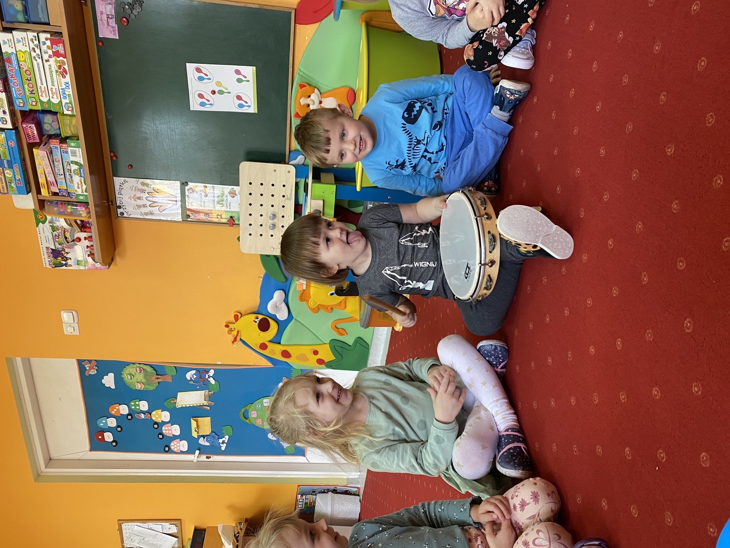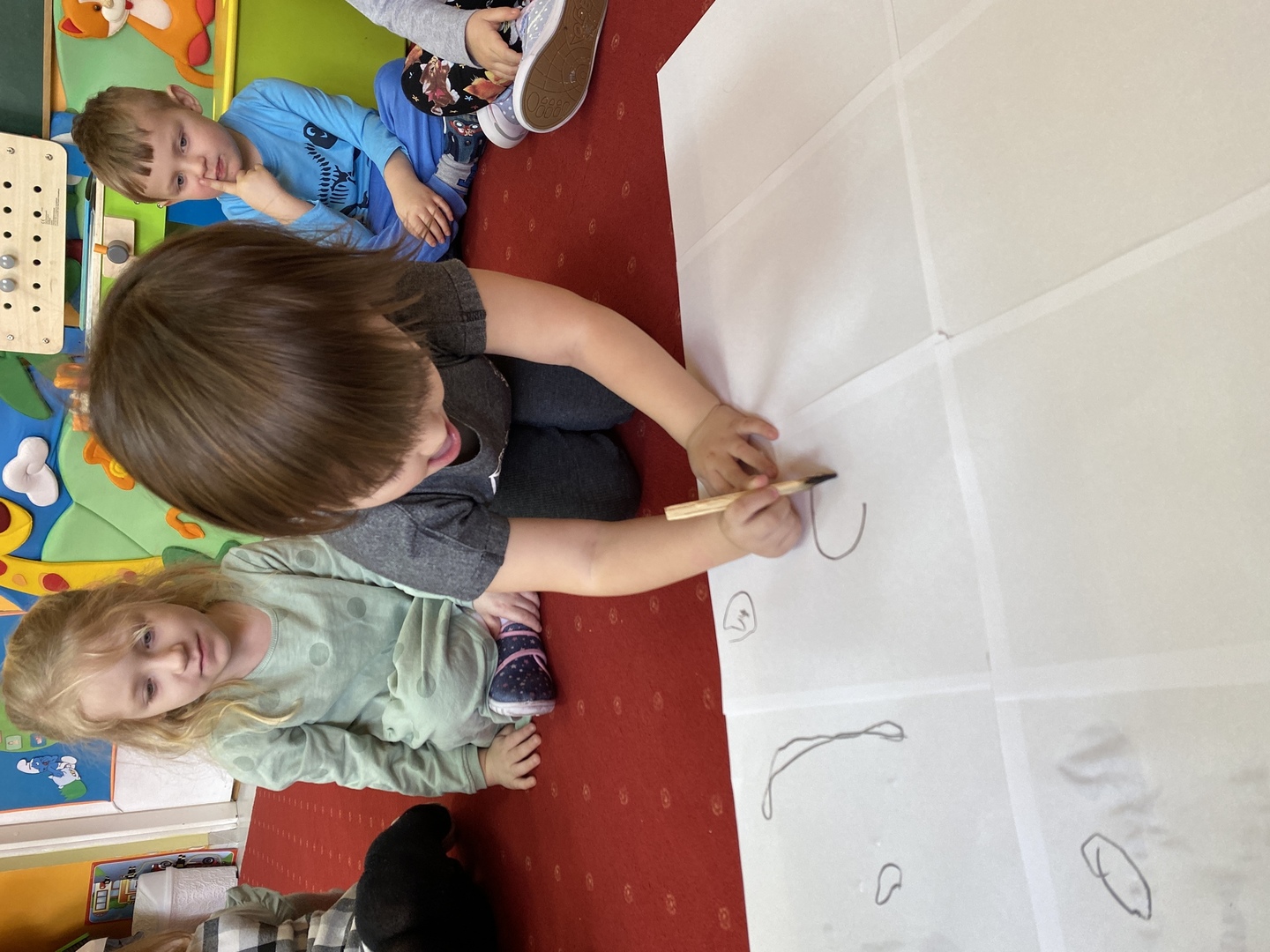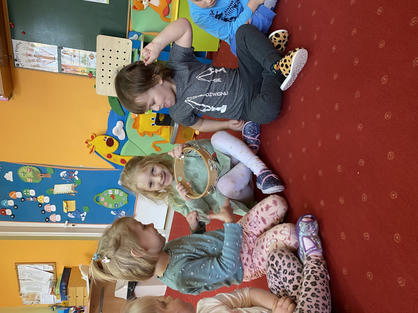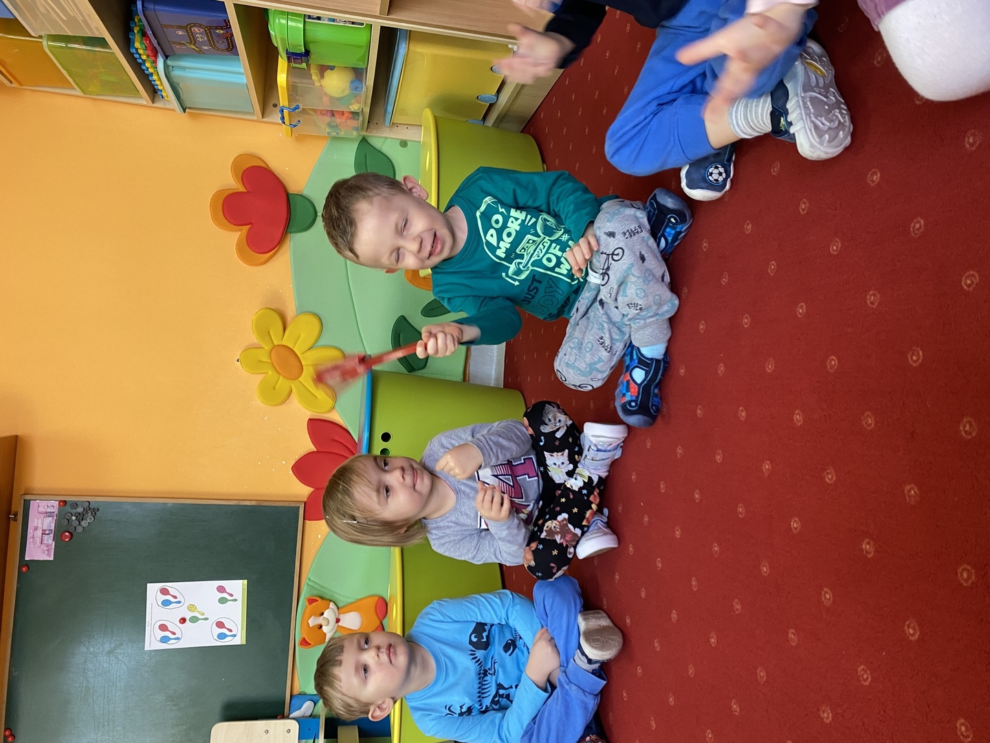Nie obyło się również bez tak potrzebnych w wieku przedszkolnym zabaw ruchowych i gimnastycznych. Maluchy miały możliwość wcielić się w strażaków gaszących „ogień”. Brały udział w zabawach: w kole, z chustą animacyjną oraz muzyczno-ruchowych do znanych piosenek dziecięcych. Poruszały się po ścieżce sensorycznej stymulującej zmysł dotyku. Ćwiczyły z woreczkami wypełnionymi ziarenkami rozwijającymi skoczność, zwinność i równowagę.