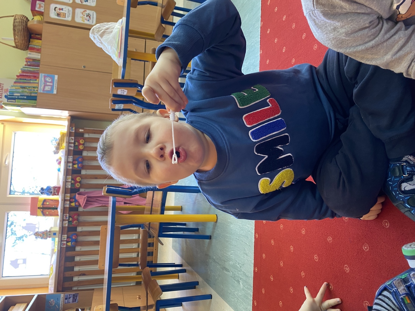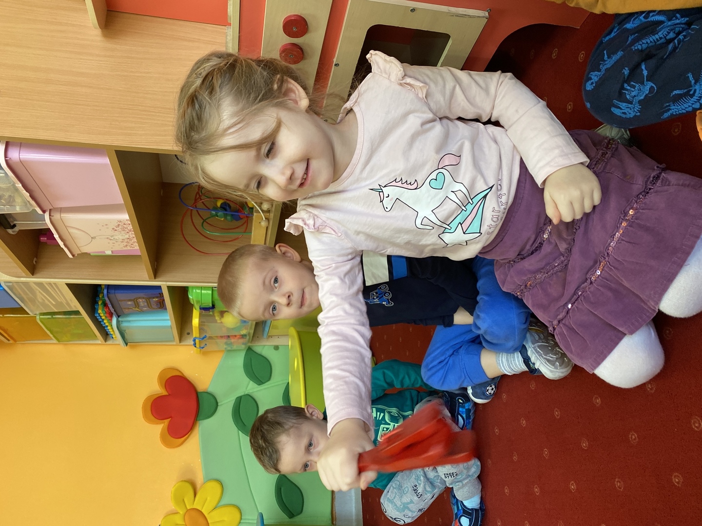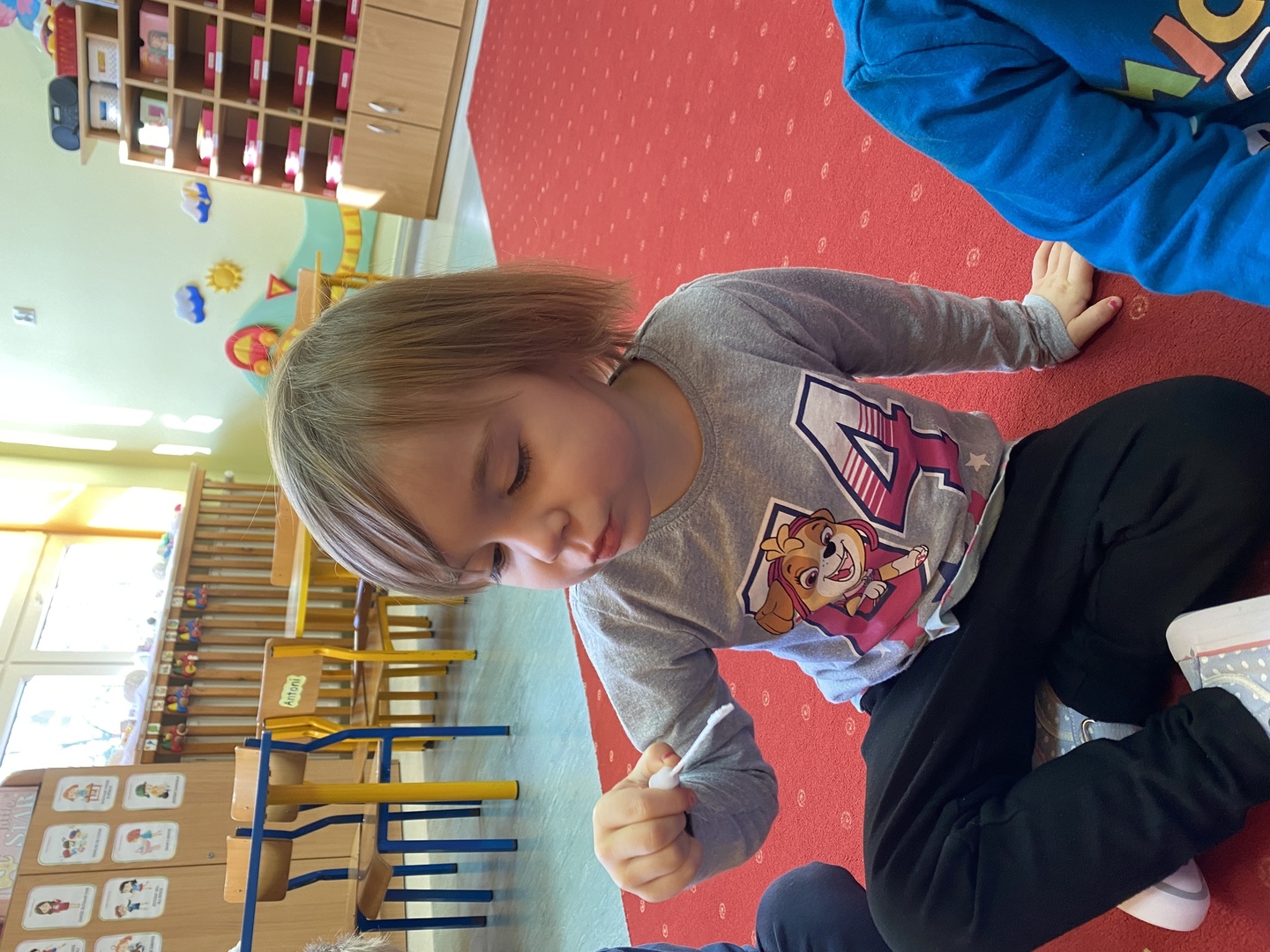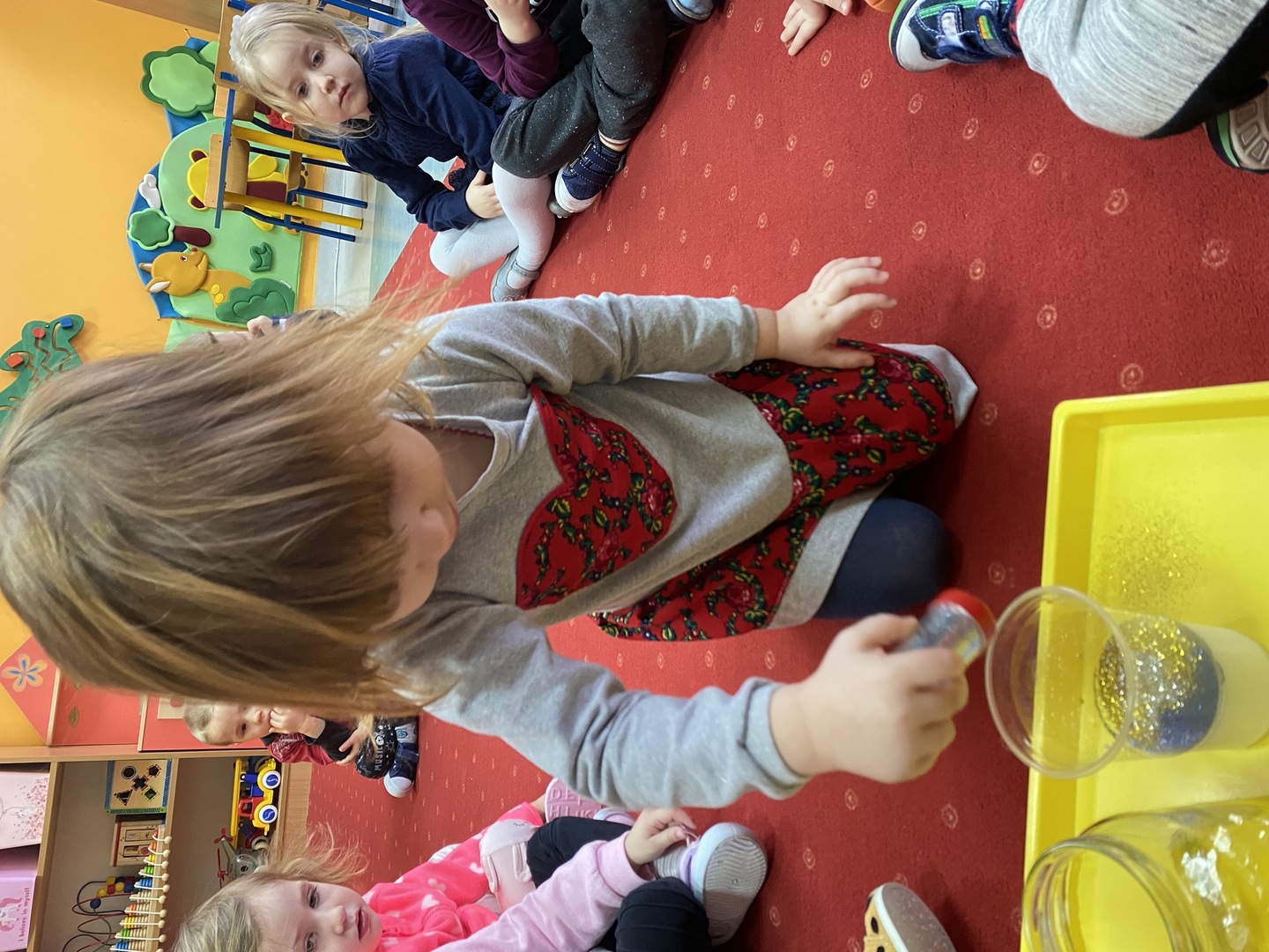 Nie obyło się również bez tak potrzebnych w wieku przedszkolnym zabaw ruchowych i gimnastycznych. Maluchy miały możliwość wcielić się w strażaków gaszących „ogień”. Brały udział w zabawach: w kole, z chustą animacyjną oraz muzyczno-ruchowych do znanych piosenek dziecięcych. Poruszały się po ścieżce sensorycznej stymulującej zmysł dotyku. Ćwiczyły z woreczkami wypełnionymi ziarenkami rozwijającymi skoczność, zwinność i równowagę.