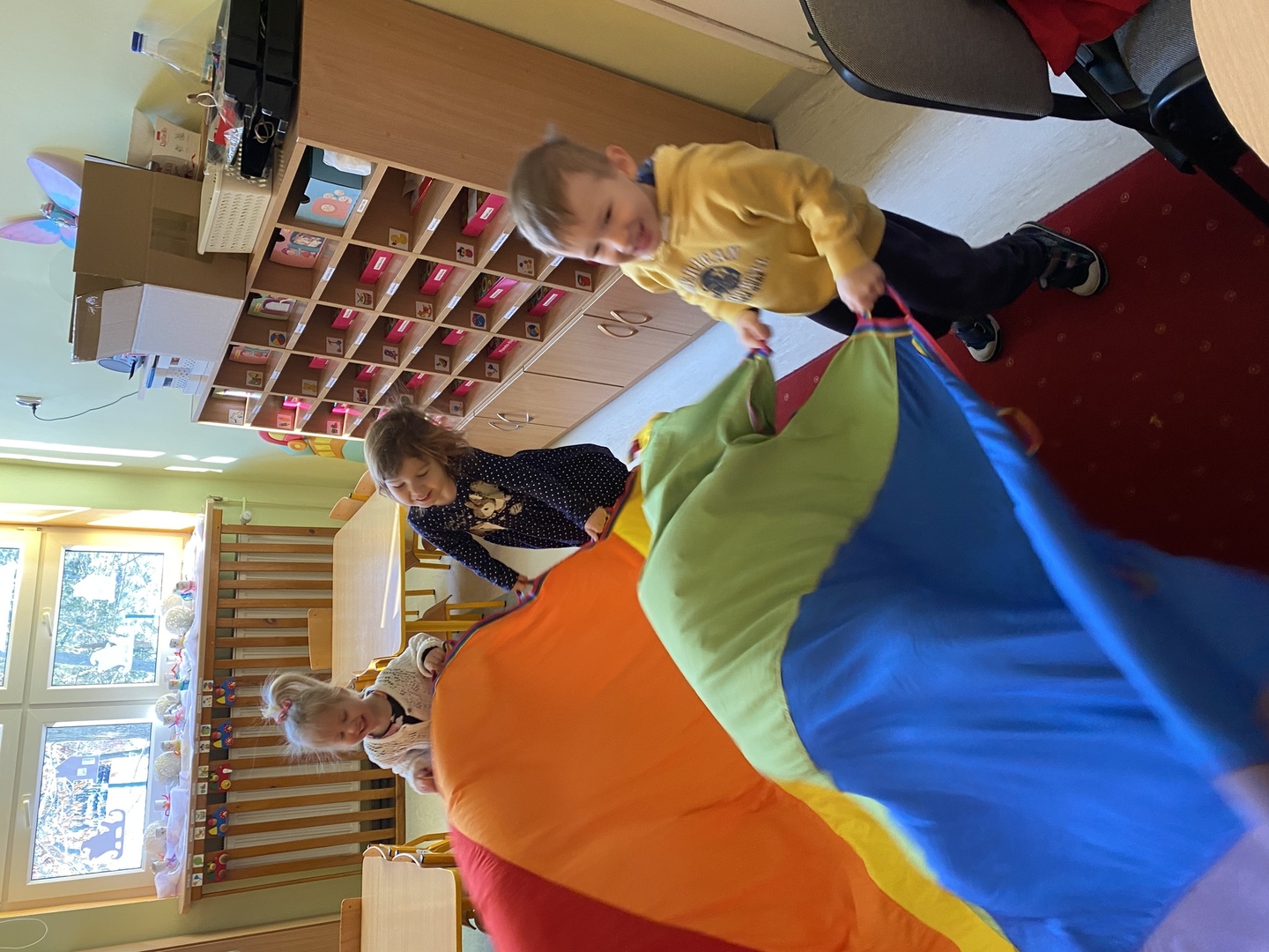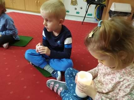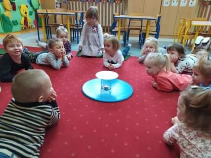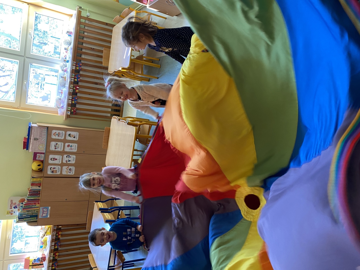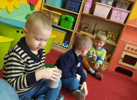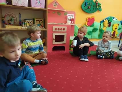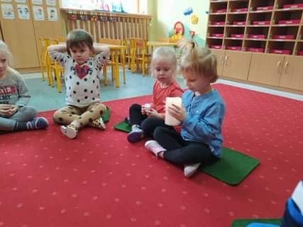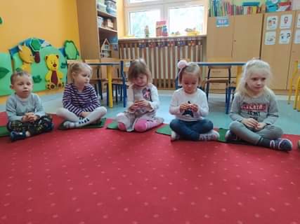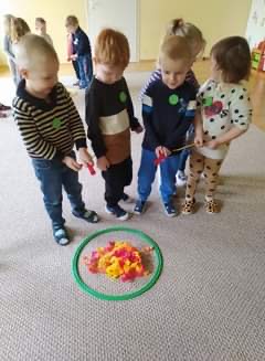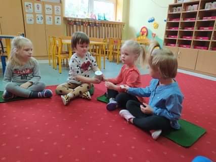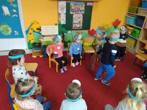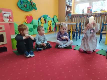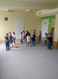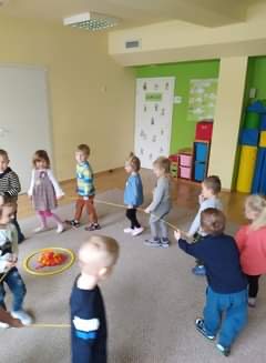 Nie obyło się również bez tak potrzebnych w wieku przedszkolnym zabaw ruchowych i gimnastycznych. Maluchy miały możliwość wcielić się w strażaków gaszących „ogień”. Brały udział w zabawach: w kole, z chustą animacyjną oraz muzyczno-ruchowych do znanych piosenek dziecięcych. Poruszały się po ścieżce sensorycznej stymulującej zmysł dotyku. Ćwiczyły z woreczkami wypełnionymi ziarenkami rozwijającymi skoczność, zwinność i równowagę.