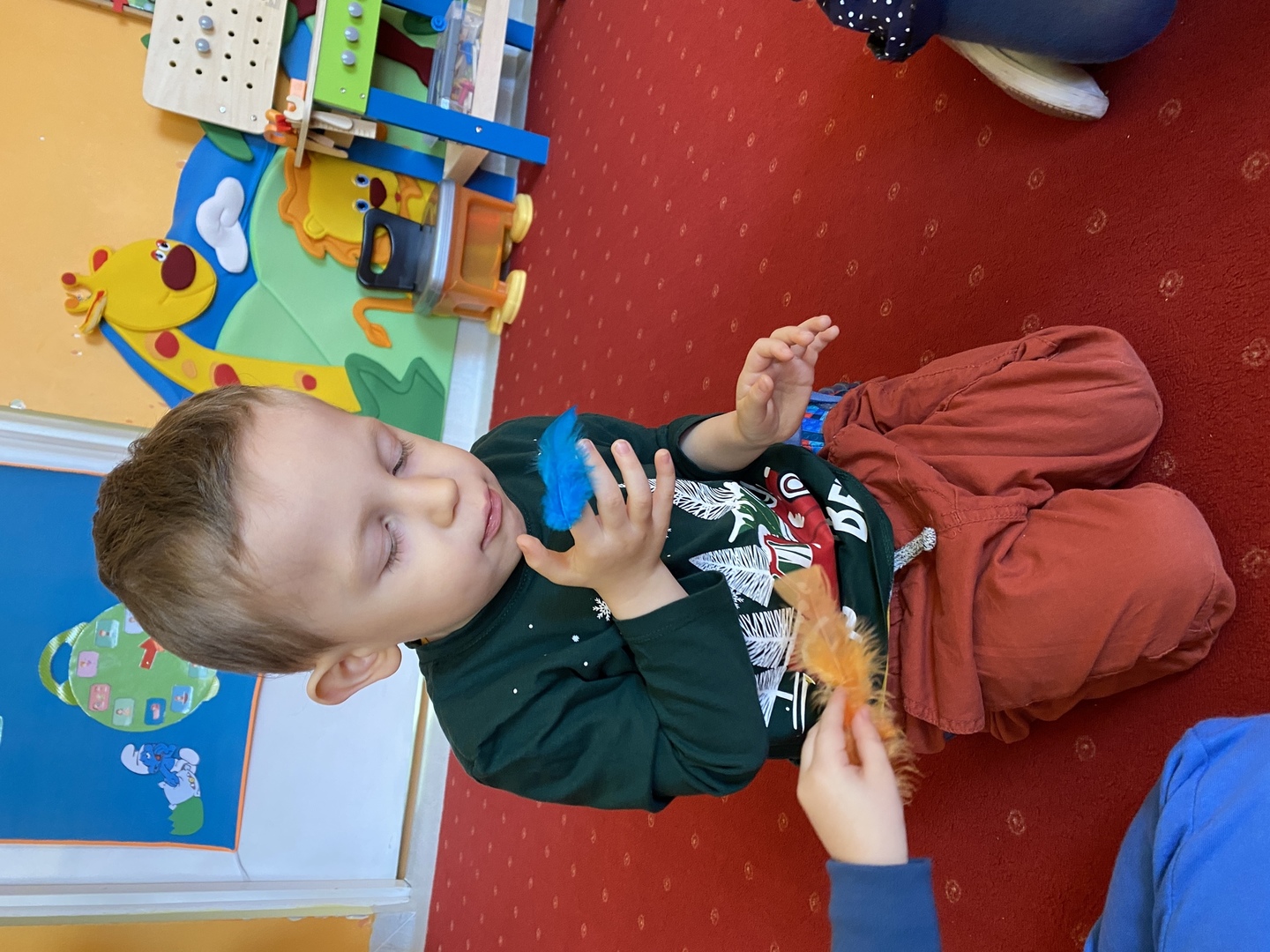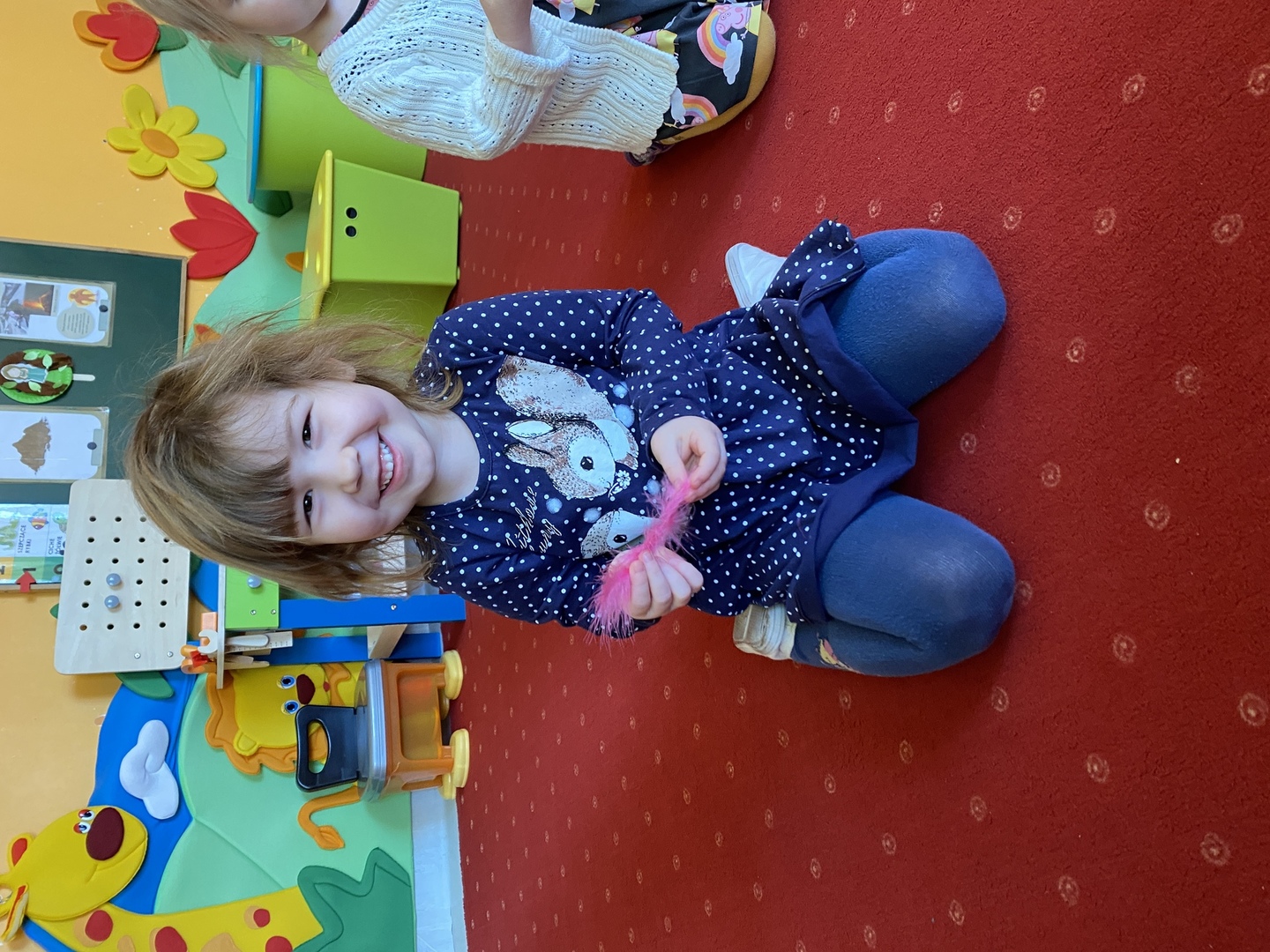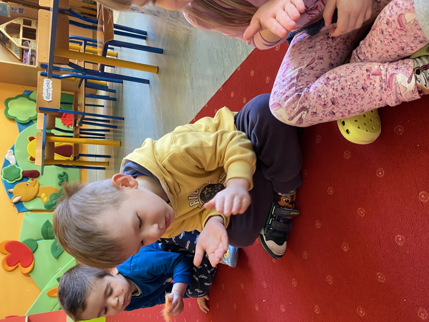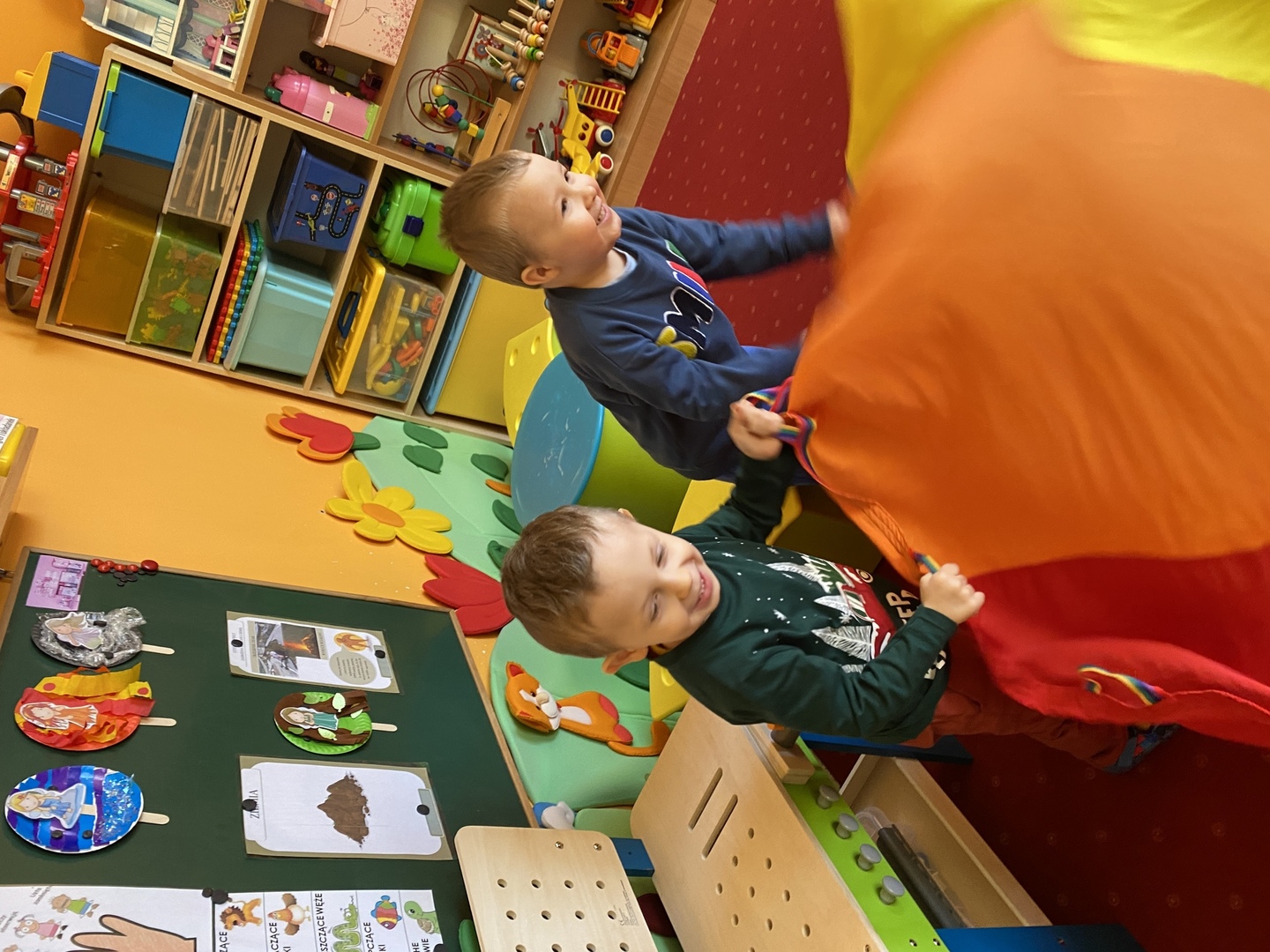 Nie obyło się również bez tak potrzebnych w wieku przedszkolnym zabaw ruchowych i gimnastycznych. Maluchy miały możliwość wcielić się w strażaków gaszących „ogień”. Brały udział w zabawach: w kole, z chustą animacyjną oraz muzyczno-ruchowych do znanych piosenek dziecięcych. Poruszały się po ścieżce sensorycznej stymulującej zmysł dotyku. Ćwiczyły z woreczkami wypełnionymi ziarenkami rozwijającymi skoczność, zwinność i równowagę.