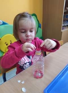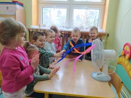 Dzieci z grupy Smerfy poznały cztery żywioły, do których należy: ziemia, woda, ogień, powietrze. W jak najlepszym zrozumieniu ich znaczenia oraz właściwości pomogły im liczne eksperymenty („Siła wiatru”, „Wędrująca woda”, „Świeca też potrzebuje powietrza”, „Czary mary octu i sody”, „Burza, wichura, tornado”, „Jak zobaczyć powietrze?”, „Woda”), oglądanie książeczek o żywiołach, zabawy tematyczne (rozdmuchiwanie bibuły i piórek, rysowanie wodą i opalonym drewnem, puszczanie i robienie baniek mydlanych, gra „Żywioły”- memory, układanie rytmów, puszczanie łódek na wodzie, łowienie rybek, poznanie instrumentów muzycznych połączone z łączeniem skojarzeń usłyszanych dźwięków z żywiołami). Wprowadzone zostały plansze do kodowania rozwijające umiejętność rozumienia i posługiwania się pojęciami: na górze, na dole, nad, obok, pod. Dzieci miały możliwość obejrzenia różnych rodzajów świec i świeczek. Zapoznania z zasadami bezpieczeństwa w przypadku zagrożeń związanych z żywiołami. Smerfy poznały również nowe techniki plastyczne, rozwijając w ten sposób sprawność manualną oraz wyobraźnie. Wykonały prace pt. „Żywioły” poprzez rozdmuchiwanie słomką farby i samodzielne tworzenie stworków. Dużą radość sprawiła dzieciom możliwość wykonania butelek sensorycznych, wypełnionych wodą, brokatem i cekinami.