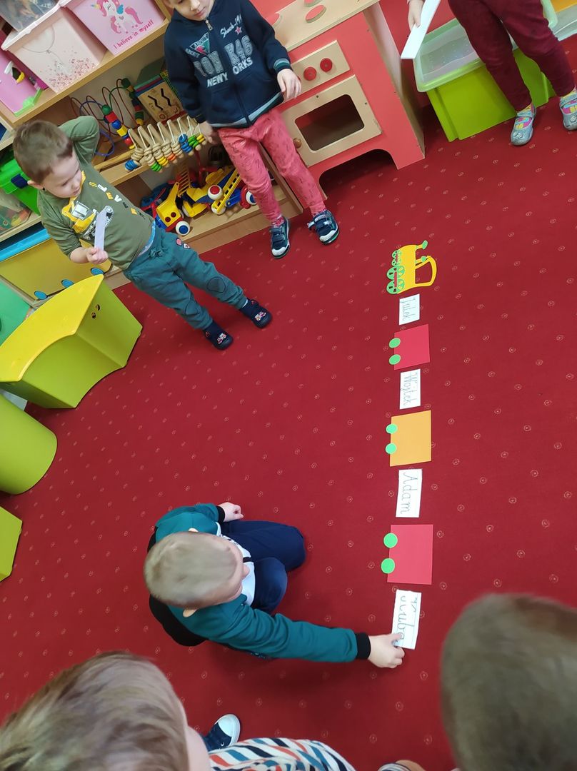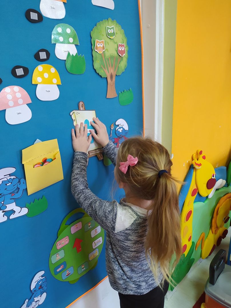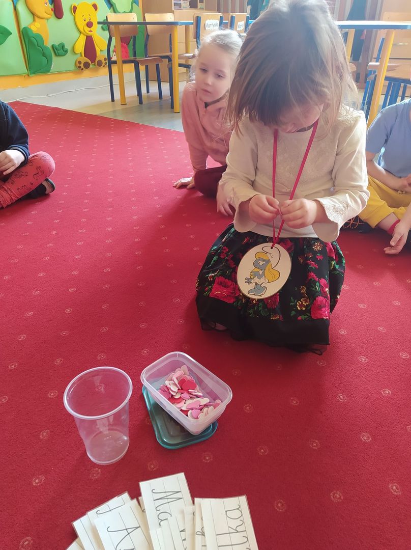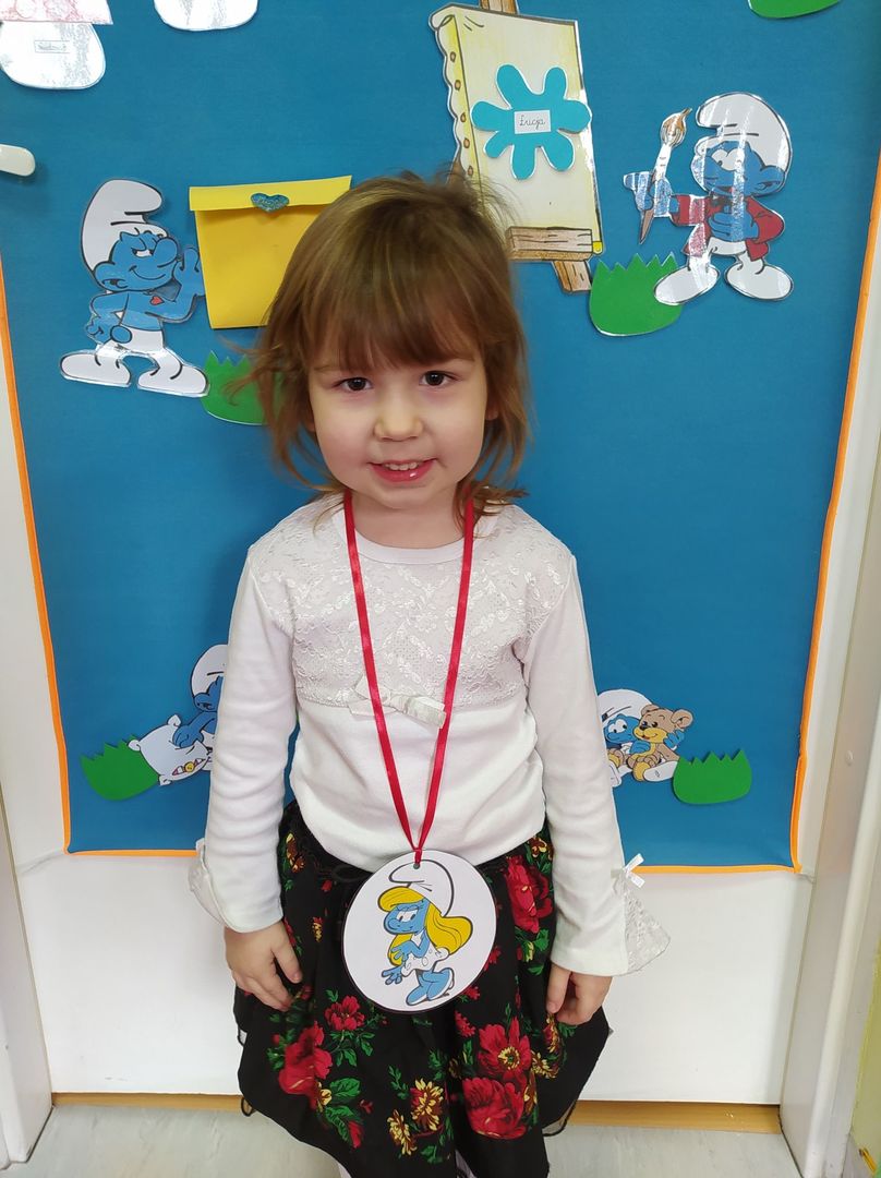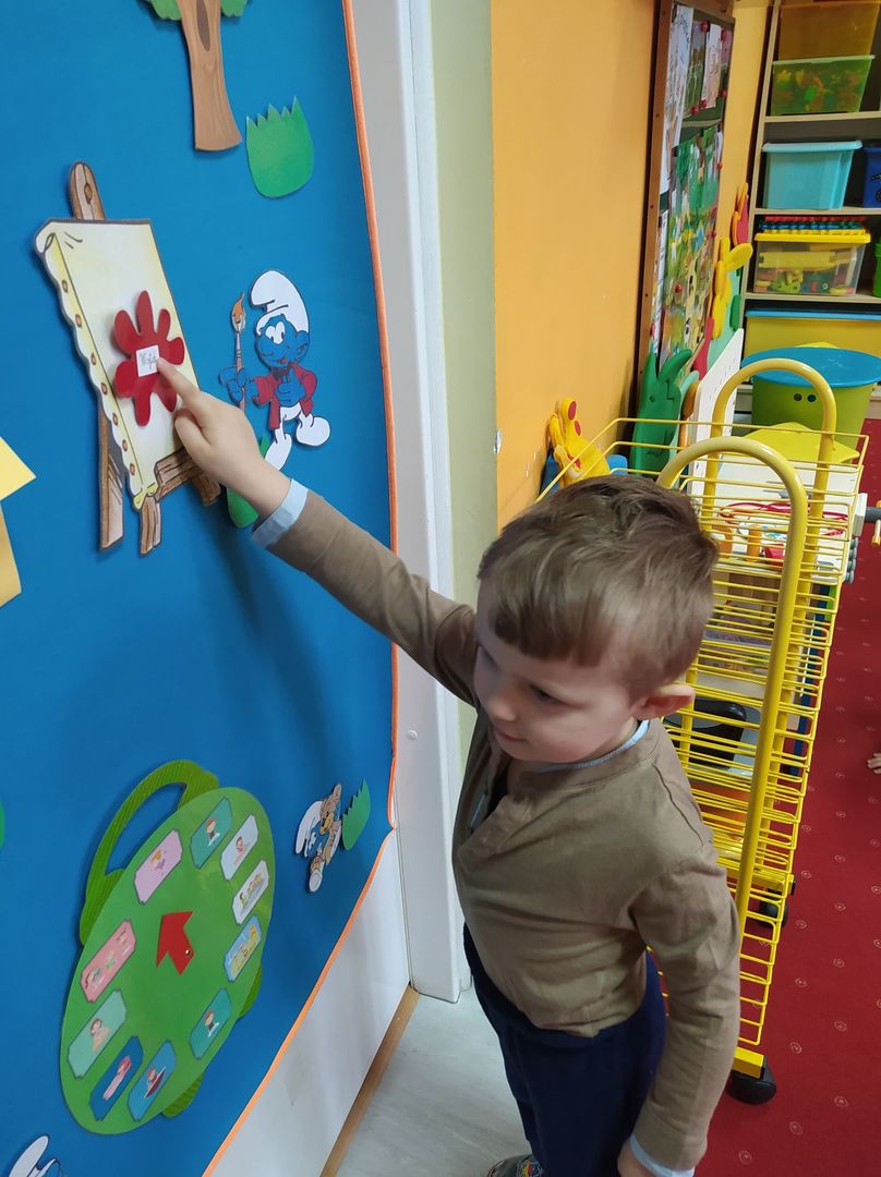 Ma okazję przyjrzenia się charakterystycznej formie każdej litery jak również rysunkowi całego imienia. Metoda ta ma kilka charakterystycznych etapów, które Smerfy będą realizować również w kolejnych latach uczęszczania do przedszkola. Póki co, wszystkie Smerfy otrzymały wizytówki ze swoim imieniem, wspólnie wymyśliły i wykonały pojemnik na wizytówki oraz uczestniczą w zabawach, które stanowią trening rozpoznawania wizytówki z własnym imieniem i wizytówek z imionami kolegów i koleżanek z grupy. Dodatkowo, dzięki znajomości zapisu graficznego swojego imienia, samodzielnie oznaczają objęcie funkcji „pomocnika nauczyciela” na specjalnie przygotowanej tablicy. Brawo Smerfy!