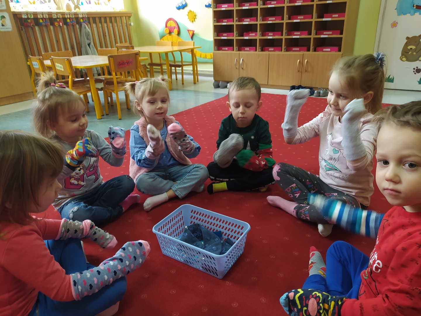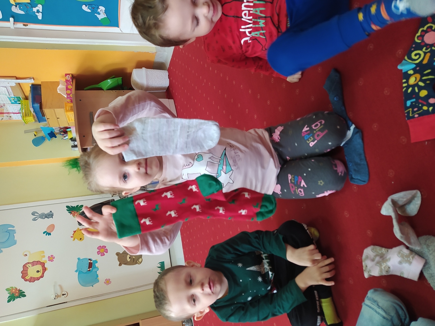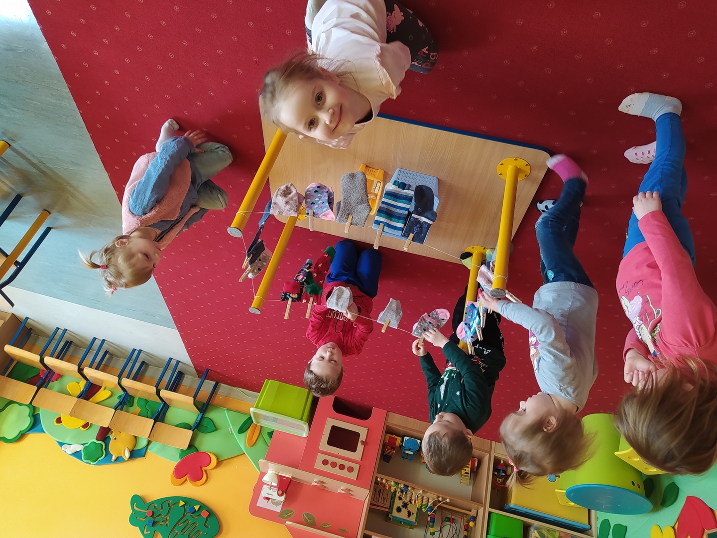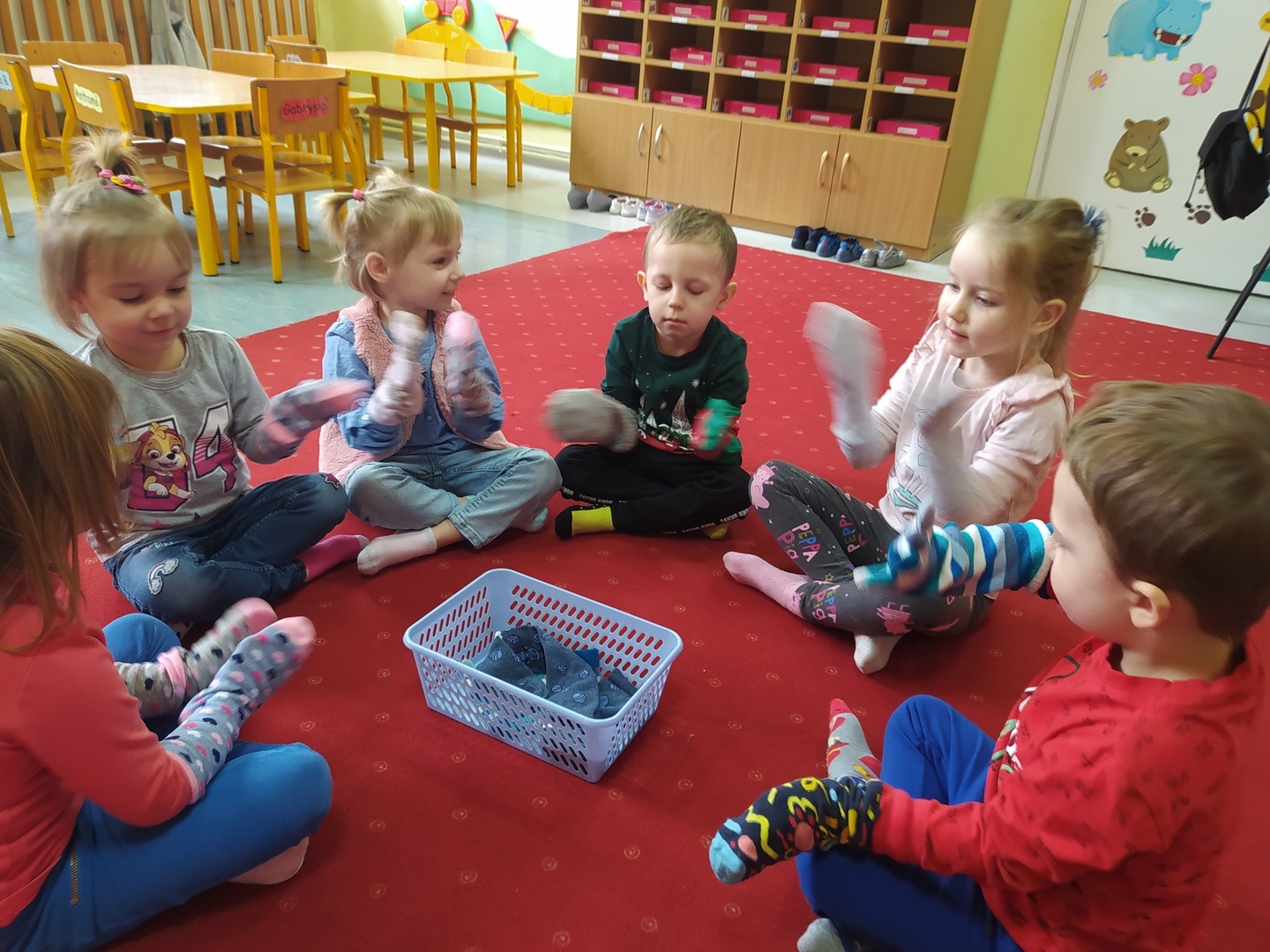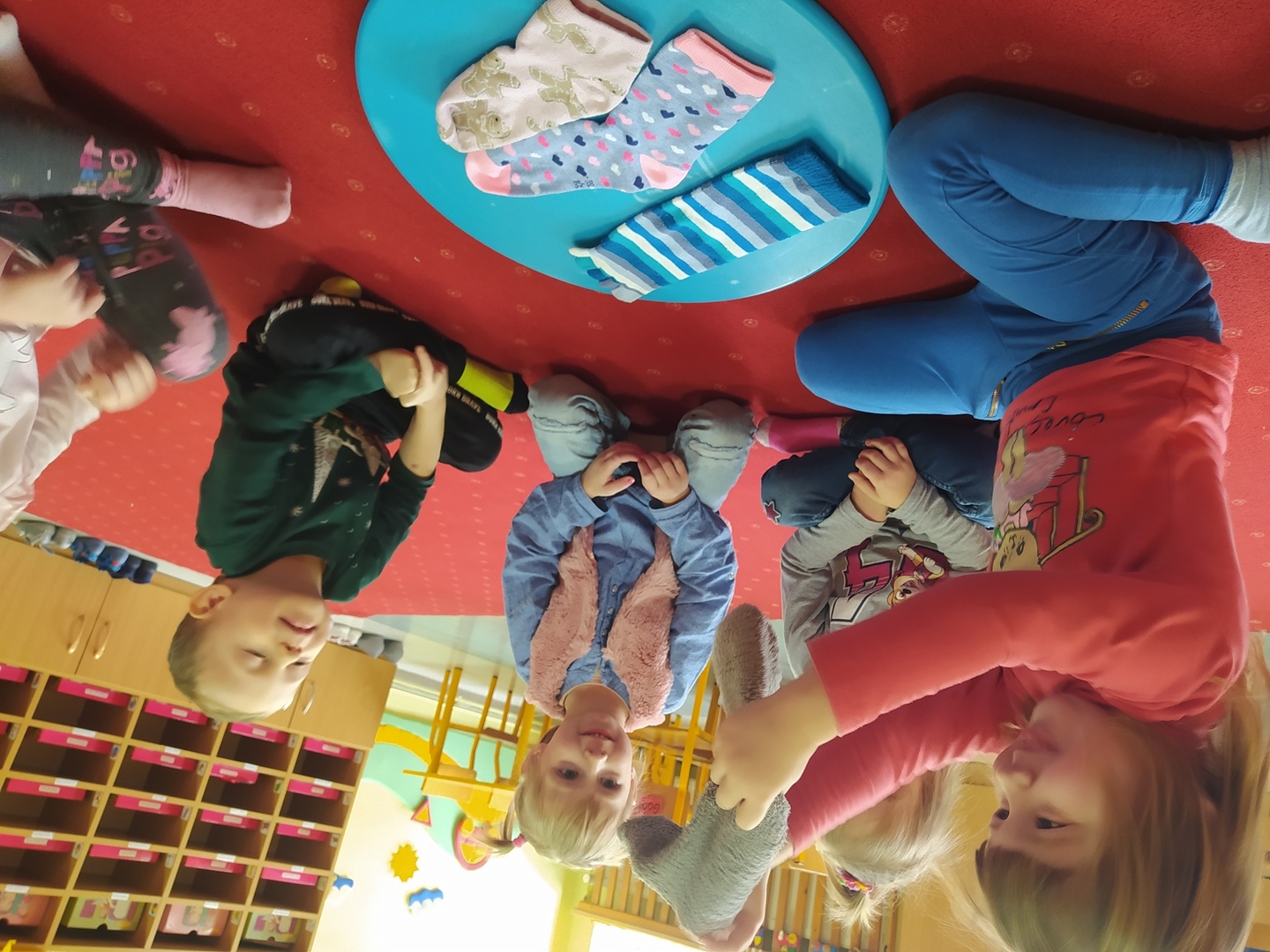 Trzeba przyznać, że dzieciom pomysł bardzo się spodobał i był świetną okazją do skarpetkowych zabaw. Rozpoczęliśmy od krótkiej skarpetkowej gimnastyki, a tuż po niej nauczyliśmy się muzycznej powitanki „Tu jedną mam skarpetkę, tu skarpetkę drugą mam. Zabawę zaczynamy, więc dobry humor mam. Tak macham, tak macham, tak macham do Was dziś Ty także, ty także pomachać możesz mi”. Następnie oglądaliśmy, opisywaliśmy i porównywaliśmy skarpetki, a także sprawdzaliśmy co potrafi każda z nich (np. rozciągać się, spadać, wywijać się na drugą stronę). Wiele uśmiechów wywołała również zabawa w ,,Znikające skarpetki' oraz „Magiczne skarpetki”, które za sprawą małych rączek Smerfów zamieniały się w kwiaty, nauszniki, telefony, samochody, a nawet maseczki. Po tak intensywnych zabawach, skarpetki „upraliśmy” i rozwiesiliśmy na sznurkach, a sami zajęliśmy się kolorowaniem. To był bardzo intensywny i kolorowy dzień.