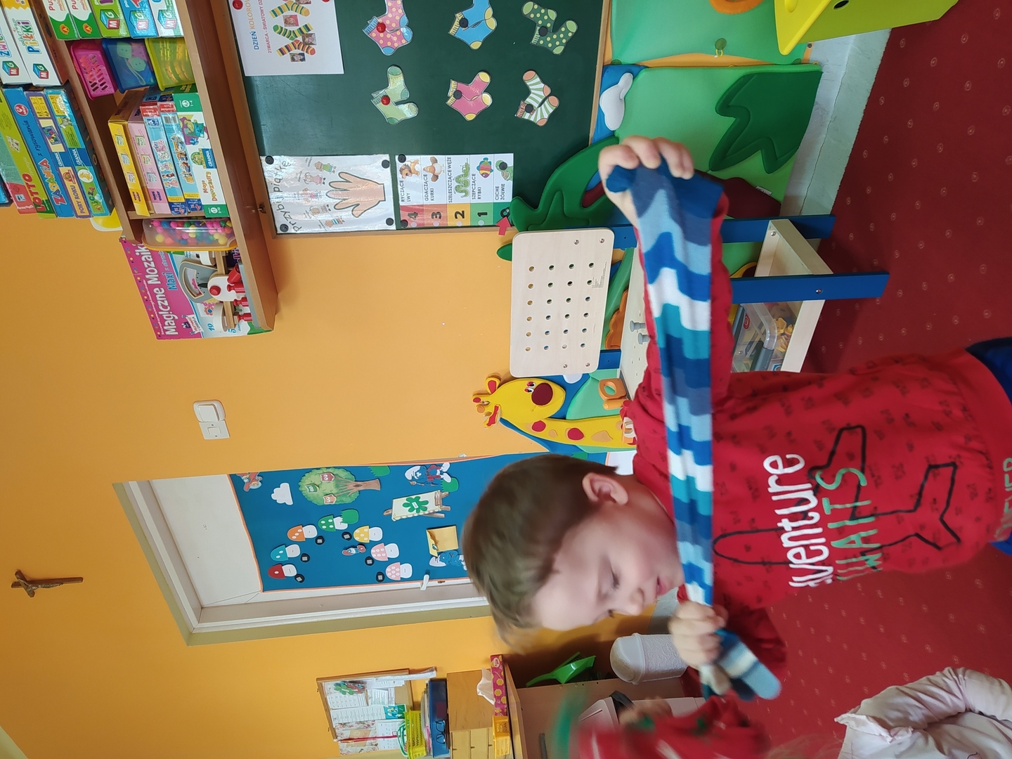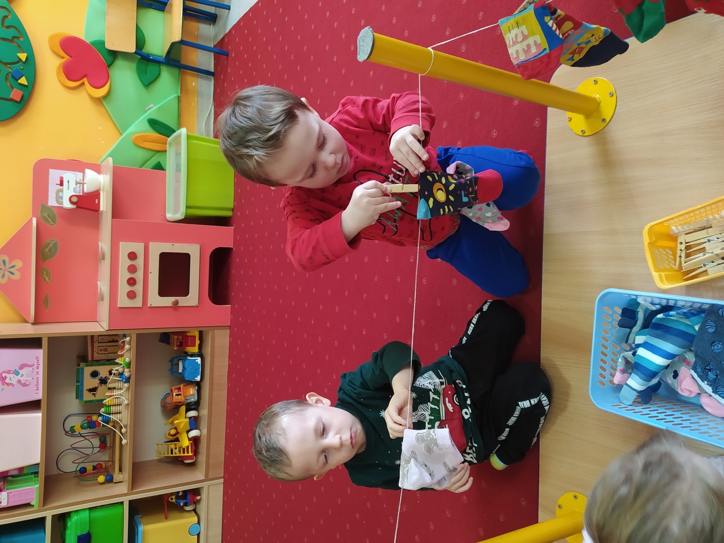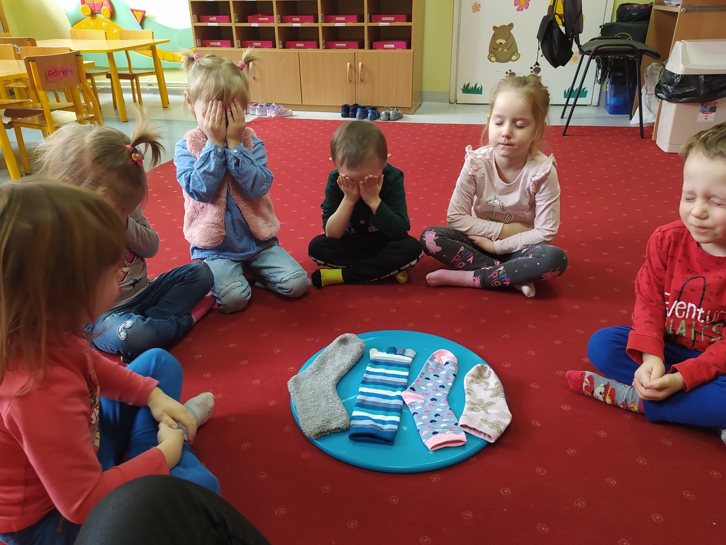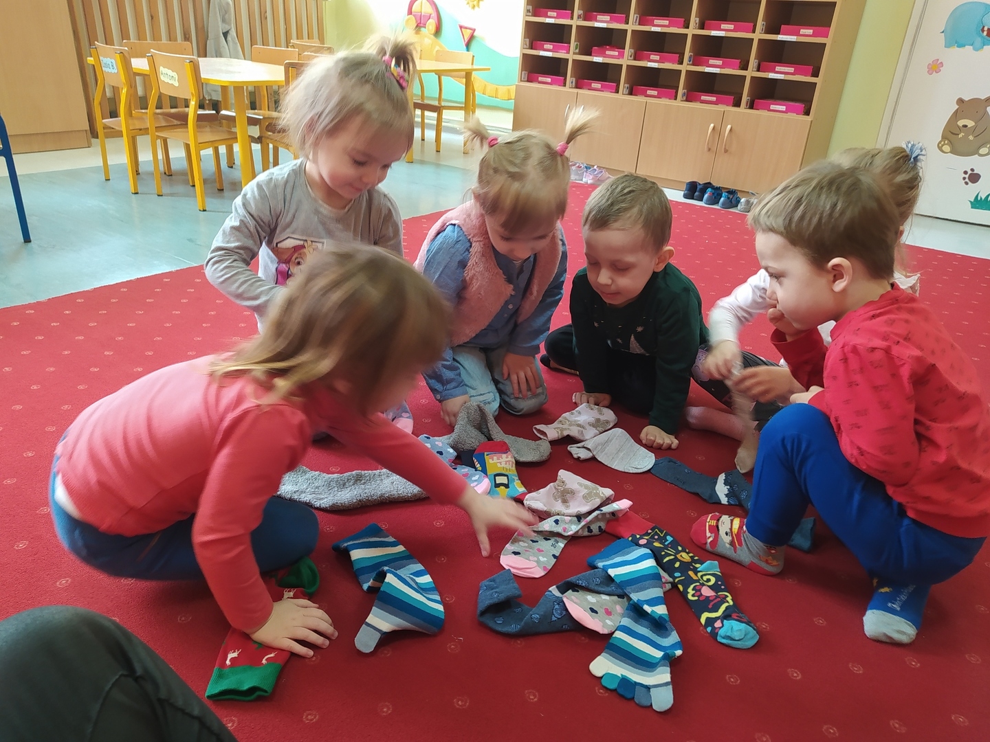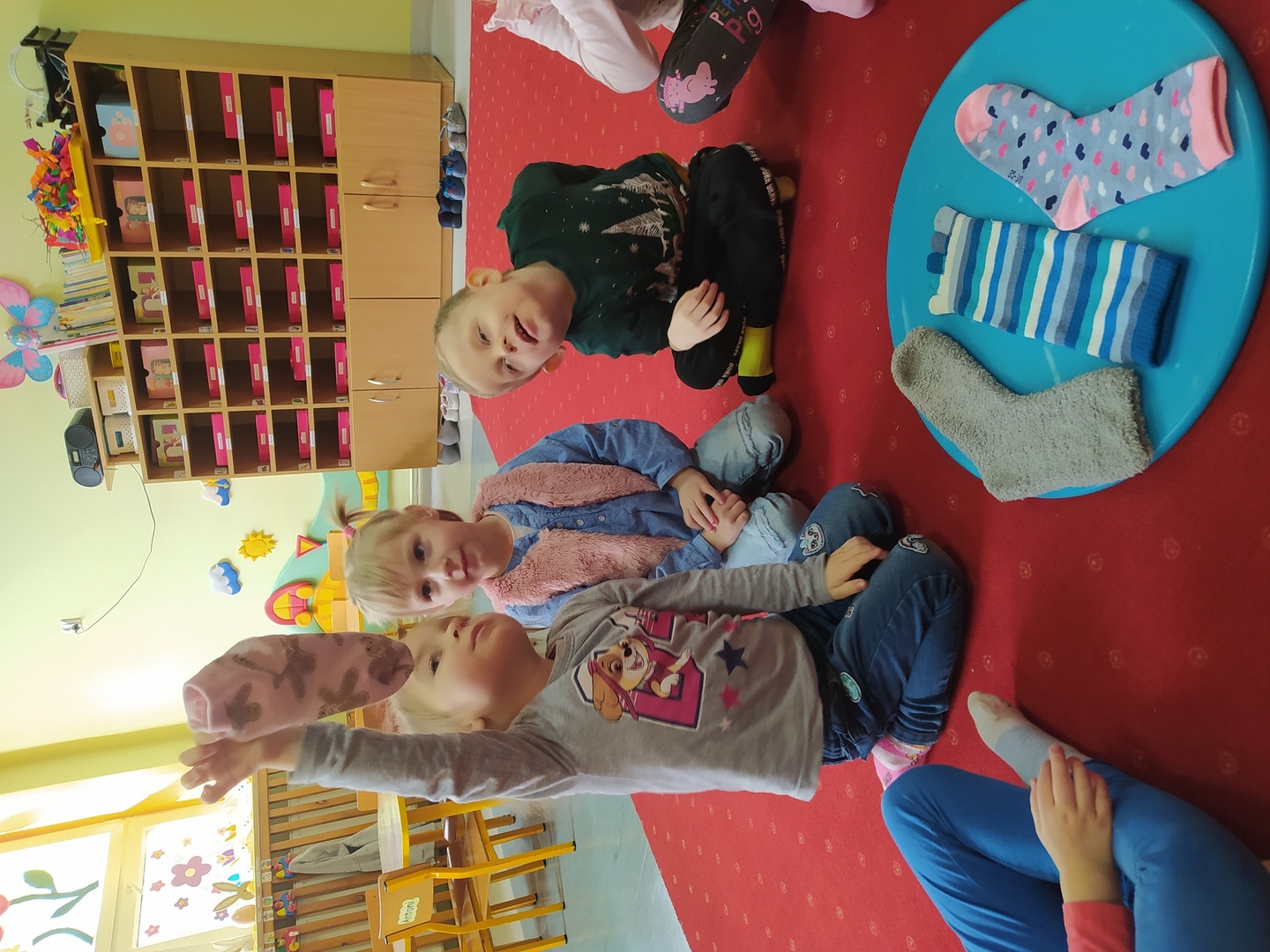 Trzeba przyznać, że dzieciom pomysł bardzo się spodobał i był świetną okazją do skarpetkowych zabaw. Rozpoczęliśmy od krótkiej skarpetkowej gimnastyki, a tuż po niej nauczyliśmy się muzycznej powitanki „Tu jedną mam skarpetkę, tu skarpetkę drugą mam. Zabawę zaczynamy, więc dobry humor mam. Tak macham, tak macham, tak macham do Was dziś Ty także, ty także pomachać możesz mi”. Następnie oglądaliśmy, opisywaliśmy i porównywaliśmy skarpetki, a także sprawdzaliśmy co potrafi każda z nich (np. rozciągać się, spadać, wywijać się na drugą stronę). Wiele uśmiechów wywołała również zabawa w ,,Znikające skarpetki' oraz „Magiczne skarpetki”, które za sprawą małych rączek Smerfów zamieniały się w kwiaty, nauszniki, telefony, samochody, a nawet maseczki. Po tak intensywnych zabawach, skarpetki „upraliśmy” i rozwiesiliśmy na sznurkach, a sami zajęliśmy się kolorowaniem. To był bardzo intensywny i kolorowy dzień.