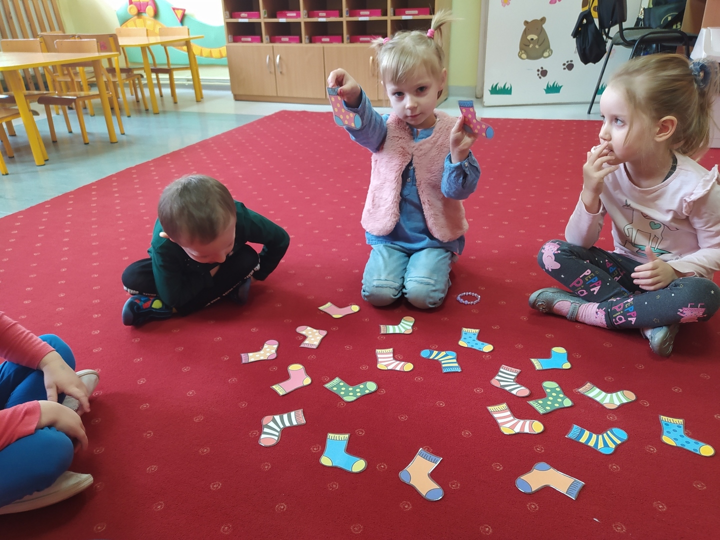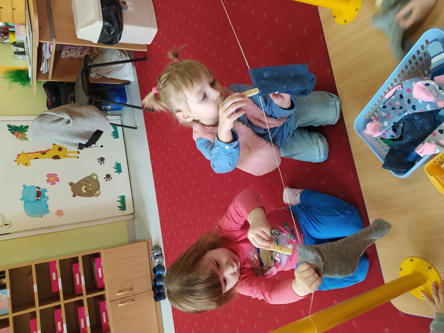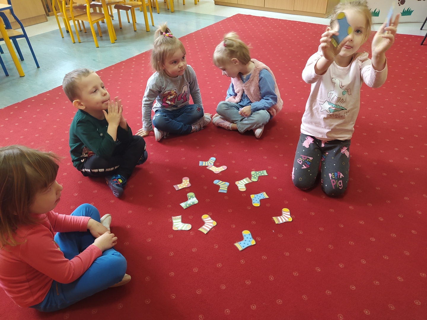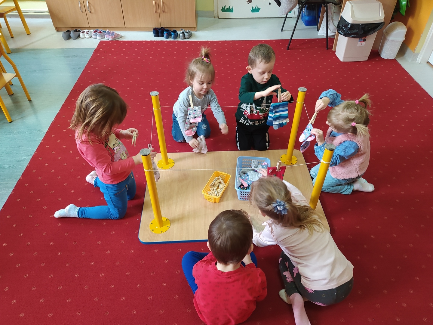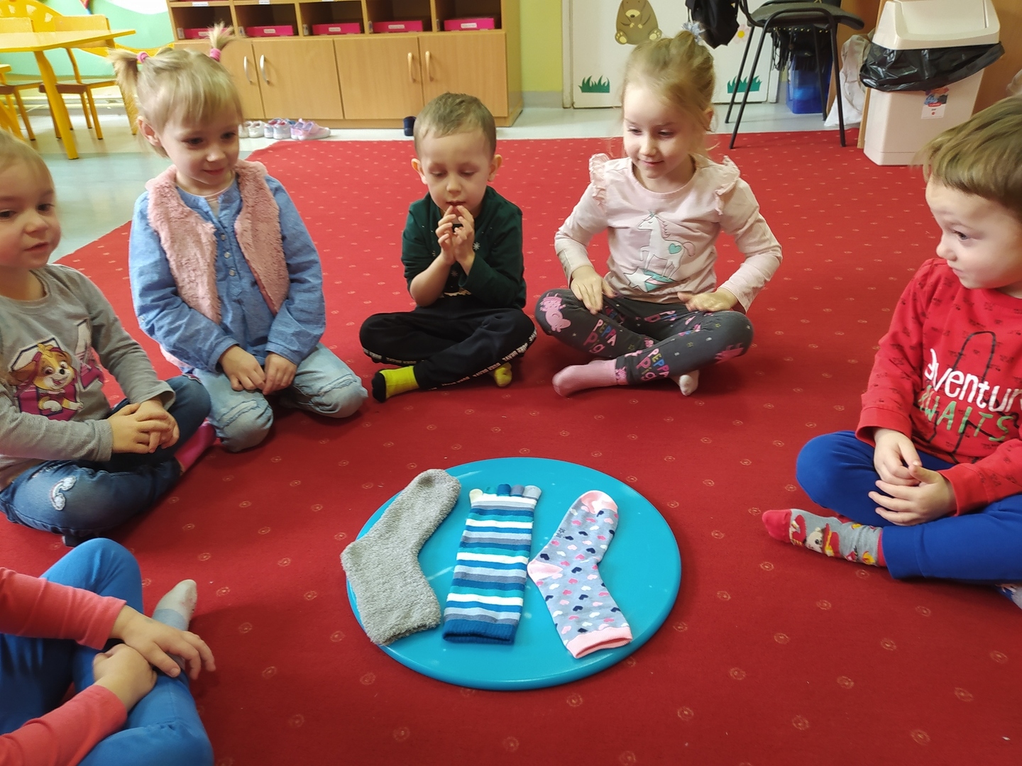 Trzeba przyznać, że dzieciom pomysł bardzo się spodobał i był świetną okazją do skarpetkowych zabaw. Rozpoczęliśmy od krótkiej skarpetkowej gimnastyki, a tuż po niej nauczyliśmy się muzycznej powitanki „Tu jedną mam skarpetkę, tu skarpetkę drugą mam. Zabawę zaczynamy, więc dobry humor mam. Tak macham, tak macham, tak macham do Was dziś Ty także, ty także pomachać możesz mi”. Następnie oglądaliśmy, opisywaliśmy i porównywaliśmy skarpetki, a także sprawdzaliśmy co potrafi każda z nich (np. rozciągać się, spadać, wywijać się na drugą stronę). Wiele uśmiechów wywołała również zabawa w ,,Znikające skarpetki' oraz „Magiczne skarpetki”, które za sprawą małych rączek Smerfów zamieniały się w kwiaty, nauszniki, telefony, samochody, a nawet maseczki. Po tak intensywnych zabawach, skarpetki „upraliśmy” i rozwiesiliśmy na sznurkach, a sami zajęliśmy się kolorowaniem. To był bardzo intensywny i kolorowy dzień.