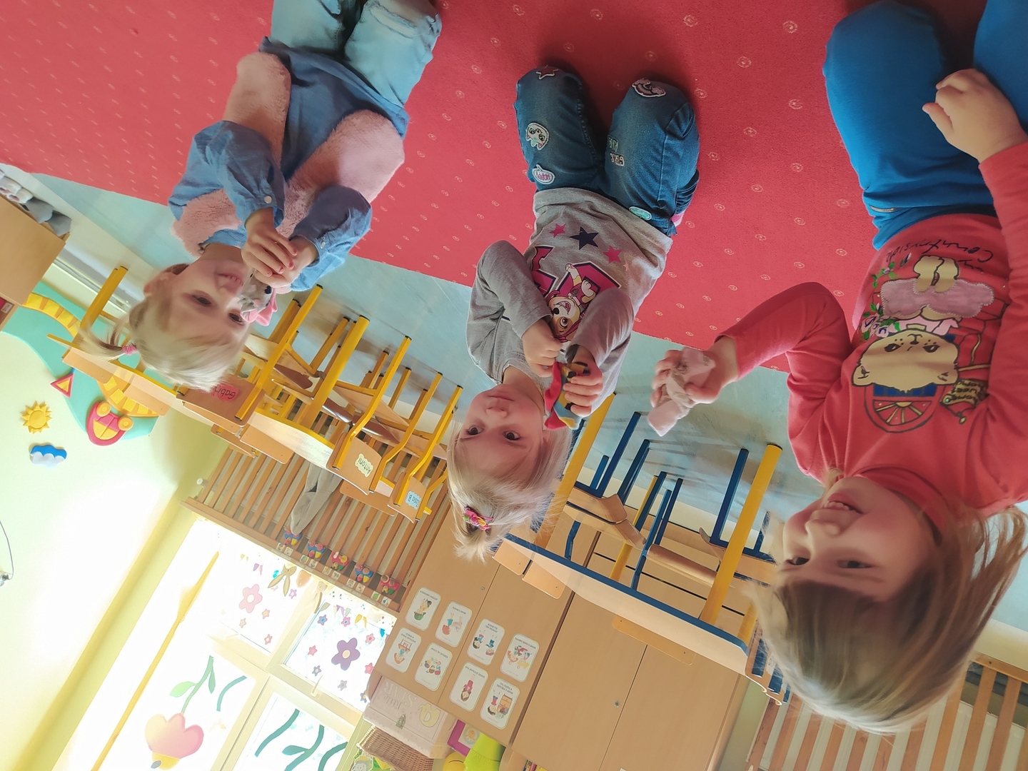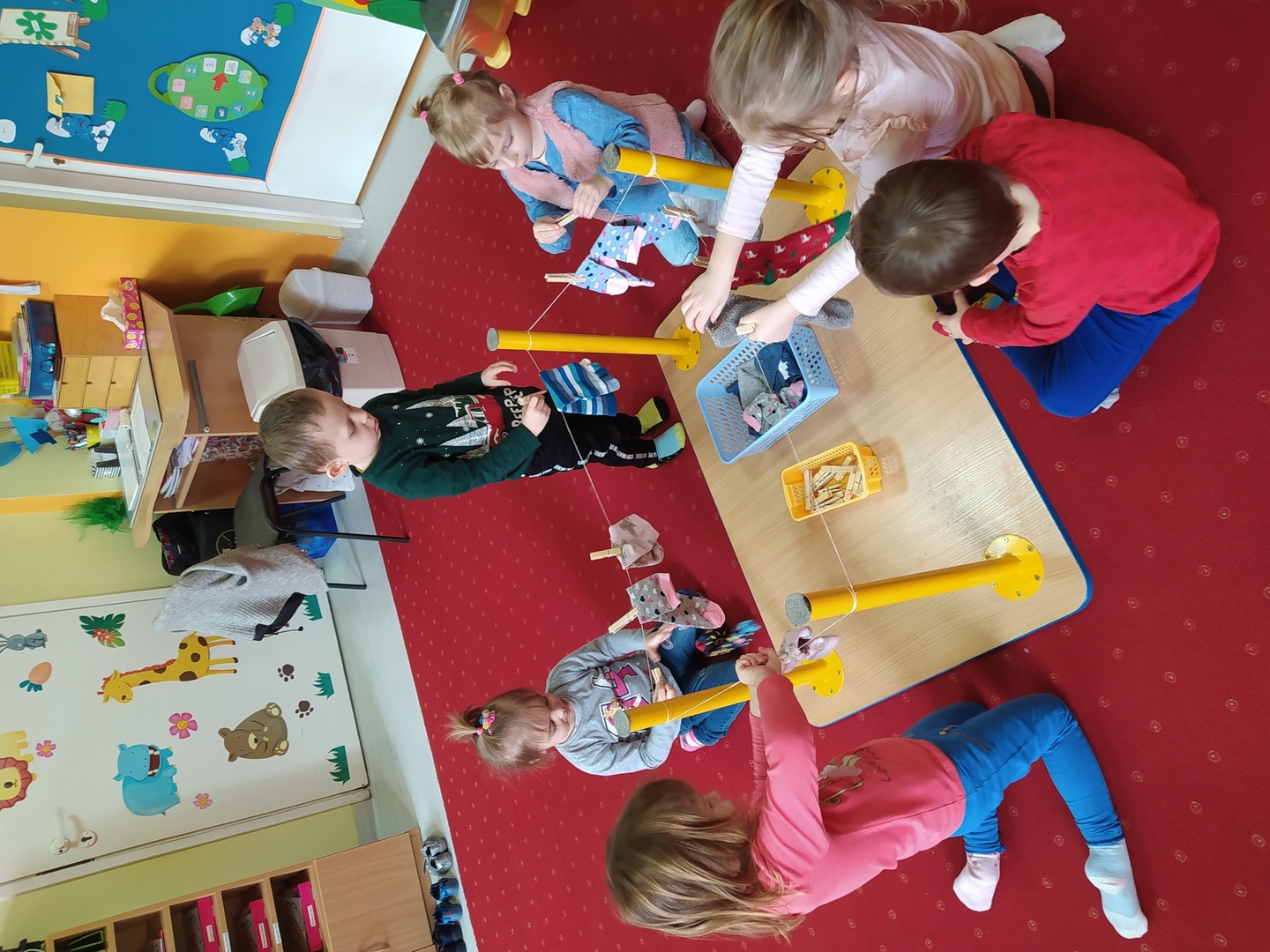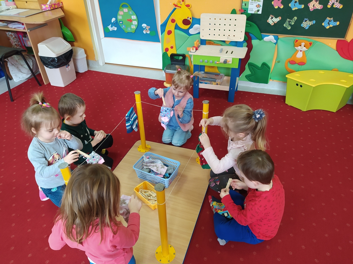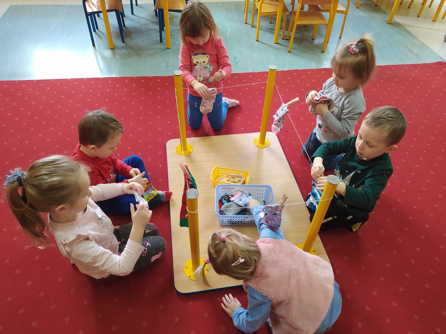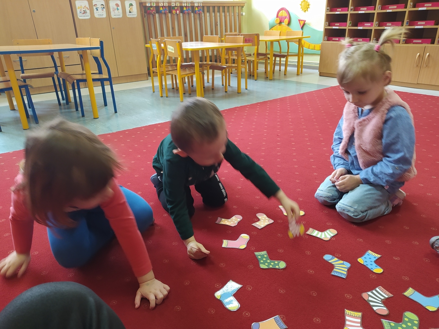Trzeba przyznać, że dzieciom pomysł bardzo się spodobał i był świetną okazją do skarpetkowych zabaw. Rozpoczęliśmy od krótkiej skarpetkowej gimnastyki, a tuż po niej nauczyliśmy się muzycznej powitanki „Tu jedną mam skarpetkę, tu skarpetkę drugą mam. Zabawę zaczynamy, więc dobry humor mam. Tak macham, tak macham, tak macham do Was dziś Ty także, ty także pomachać możesz mi”. Następnie oglądaliśmy, opisywaliśmy i porównywaliśmy skarpetki, a także sprawdzaliśmy co potrafi każda z nich (np. rozciągać się, spadać, wywijać się na drugą stronę). Wiele uśmiechów wywołała również zabawa w ,,Znikające skarpetki' oraz „Magiczne skarpetki”, które za sprawą małych rączek Smerfów zamieniały się w kwiaty, nauszniki, telefony, samochody, a nawet maseczki. Po tak intensywnych zabawach, skarpetki „upraliśmy” i rozwiesiliśmy na sznurkach, a sami zajęliśmy się kolorowaniem. To był bardzo intensywny i kolorowy dzień.