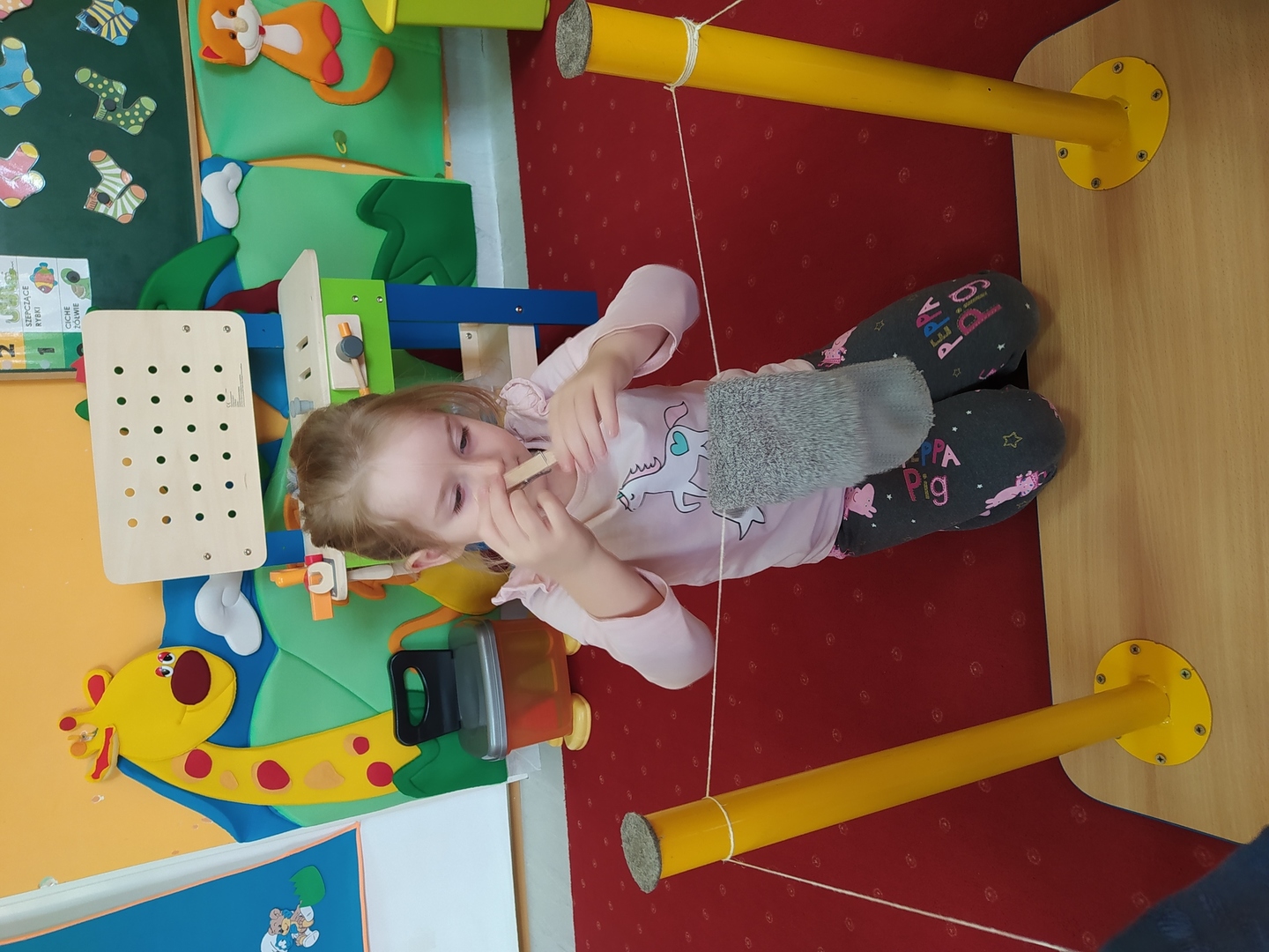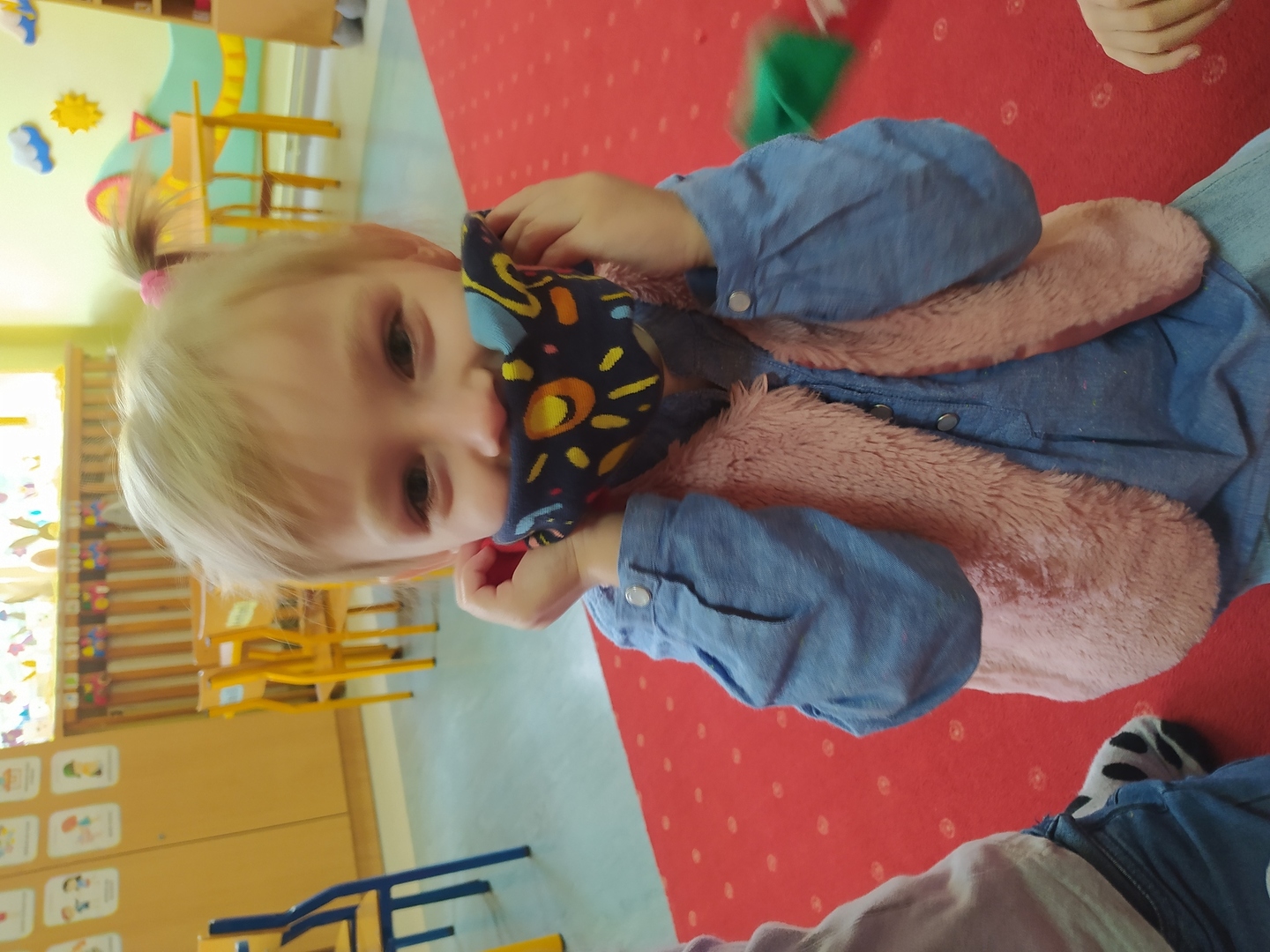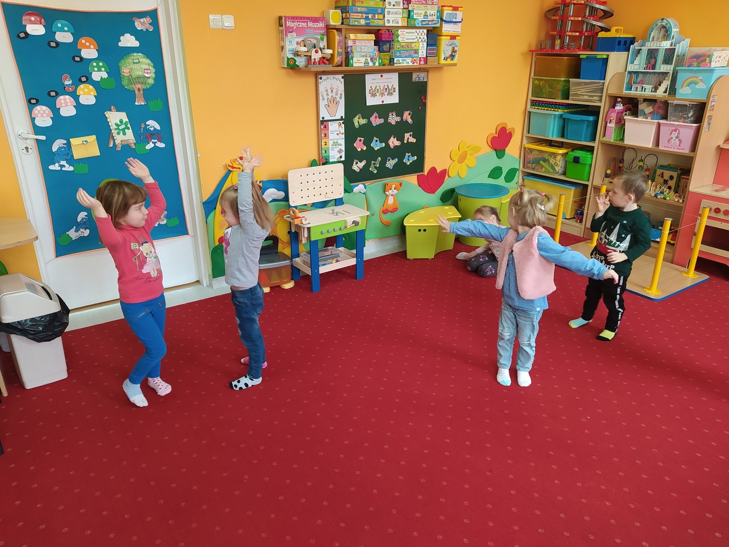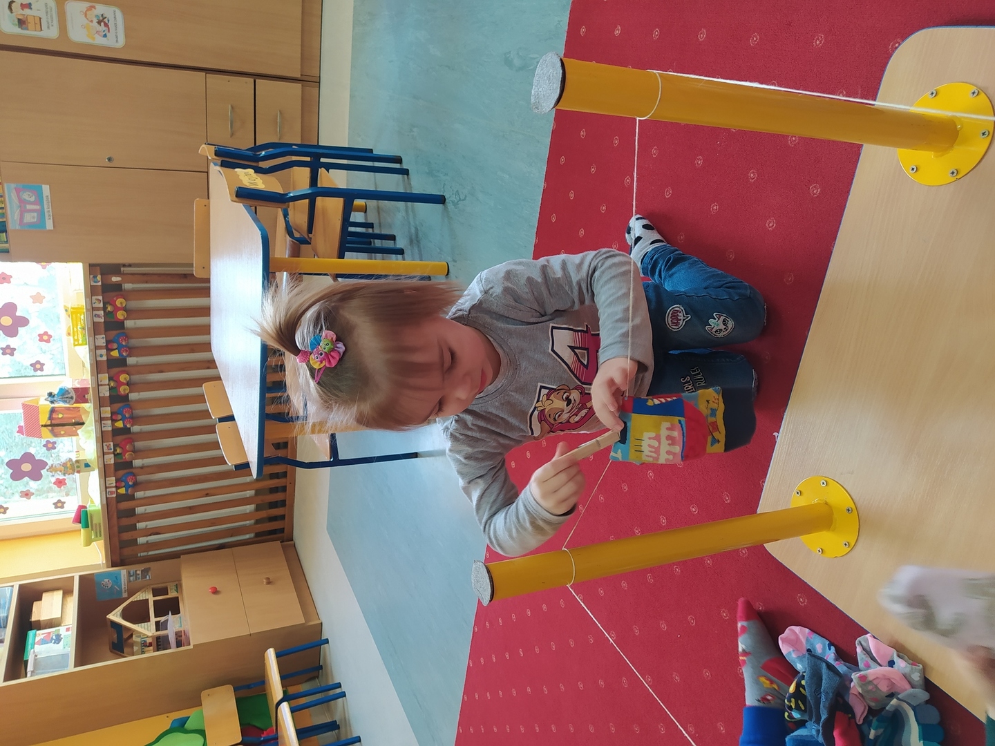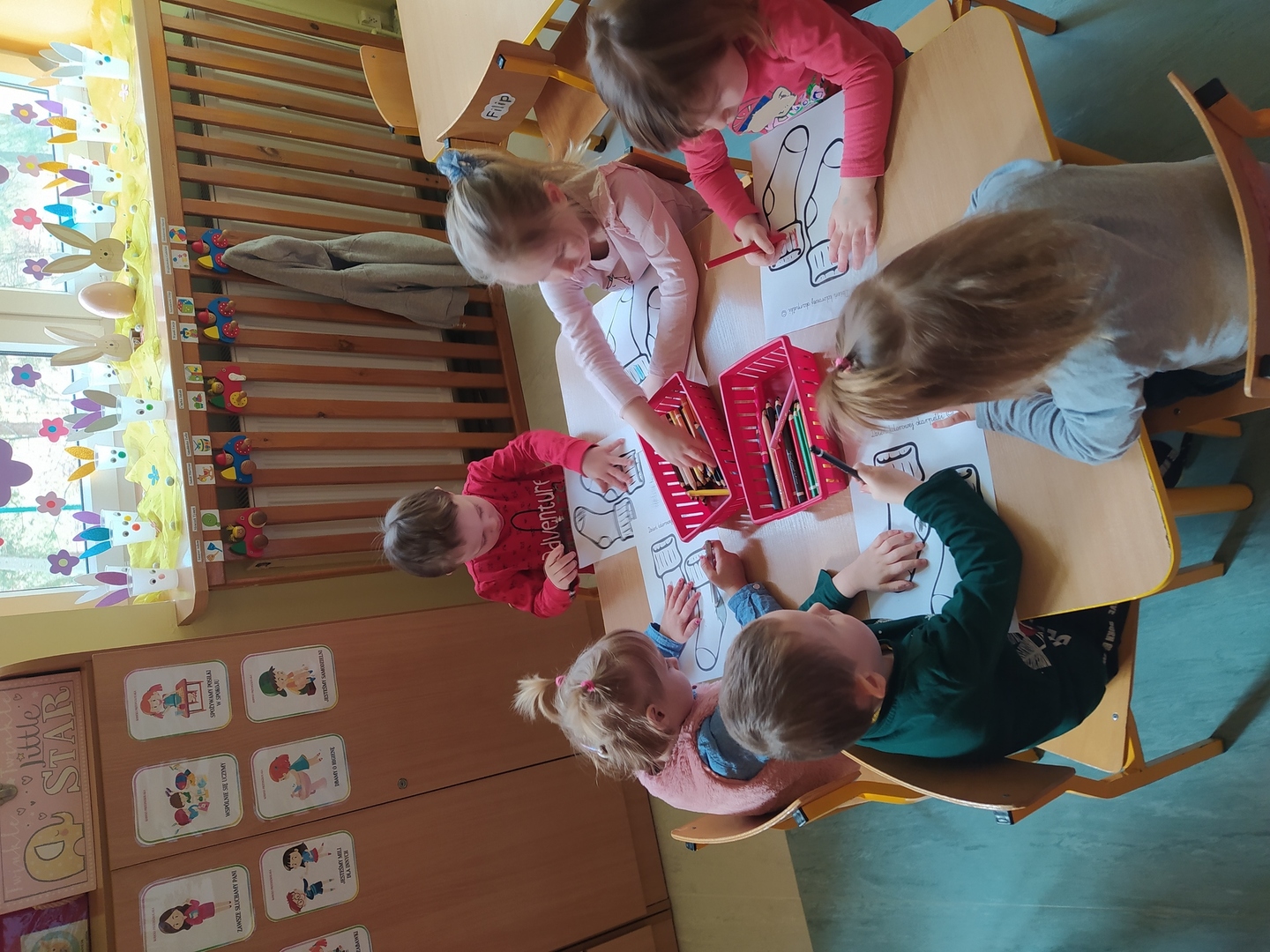Trzeba przyznać, że dzieciom pomysł bardzo się spodobał i był świetną okazją do skarpetkowych zabaw. Rozpoczęliśmy od krótkiej skarpetkowej gimnastyki, a tuż po niej nauczyliśmy się muzycznej powitanki „Tu jedną mam skarpetkę, tu skarpetkę drugą mam. Zabawę zaczynamy, więc dobry humor mam. Tak macham, tak macham, tak macham do Was dziś Ty także, ty także pomachać możesz mi”. Następnie oglądaliśmy, opisywaliśmy i porównywaliśmy skarpetki, a także sprawdzaliśmy co potrafi każda z nich (np. rozciągać się, spadać, wywijać się na drugą stronę). Wiele uśmiechów wywołała również zabawa w ,,Znikające skarpetki' oraz „Magiczne skarpetki”, które za sprawą małych rączek Smerfów zamieniały się w kwiaty, nauszniki, telefony, samochody, a nawet maseczki. Po tak intensywnych zabawach, skarpetki „upraliśmy” i rozwiesiliśmy na sznurkach, a sami zajęliśmy się kolorowaniem. To był bardzo intensywny i kolorowy dzień.