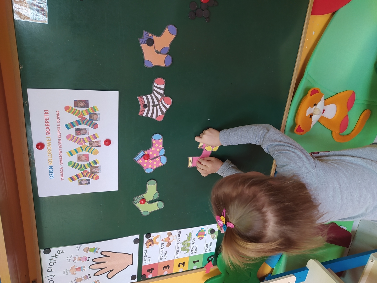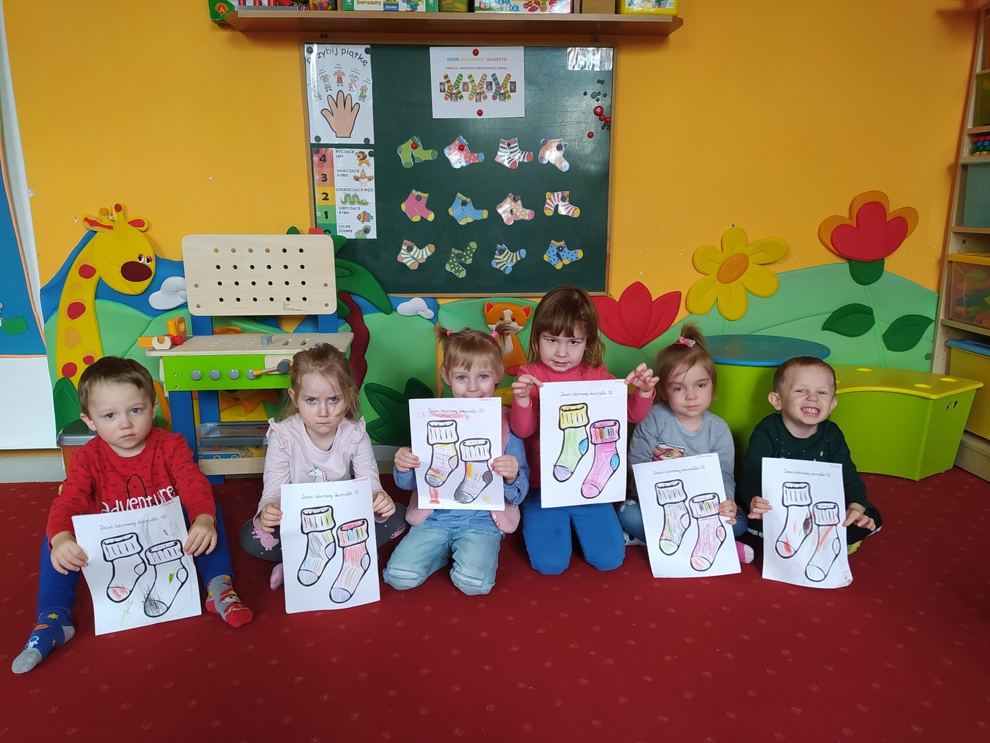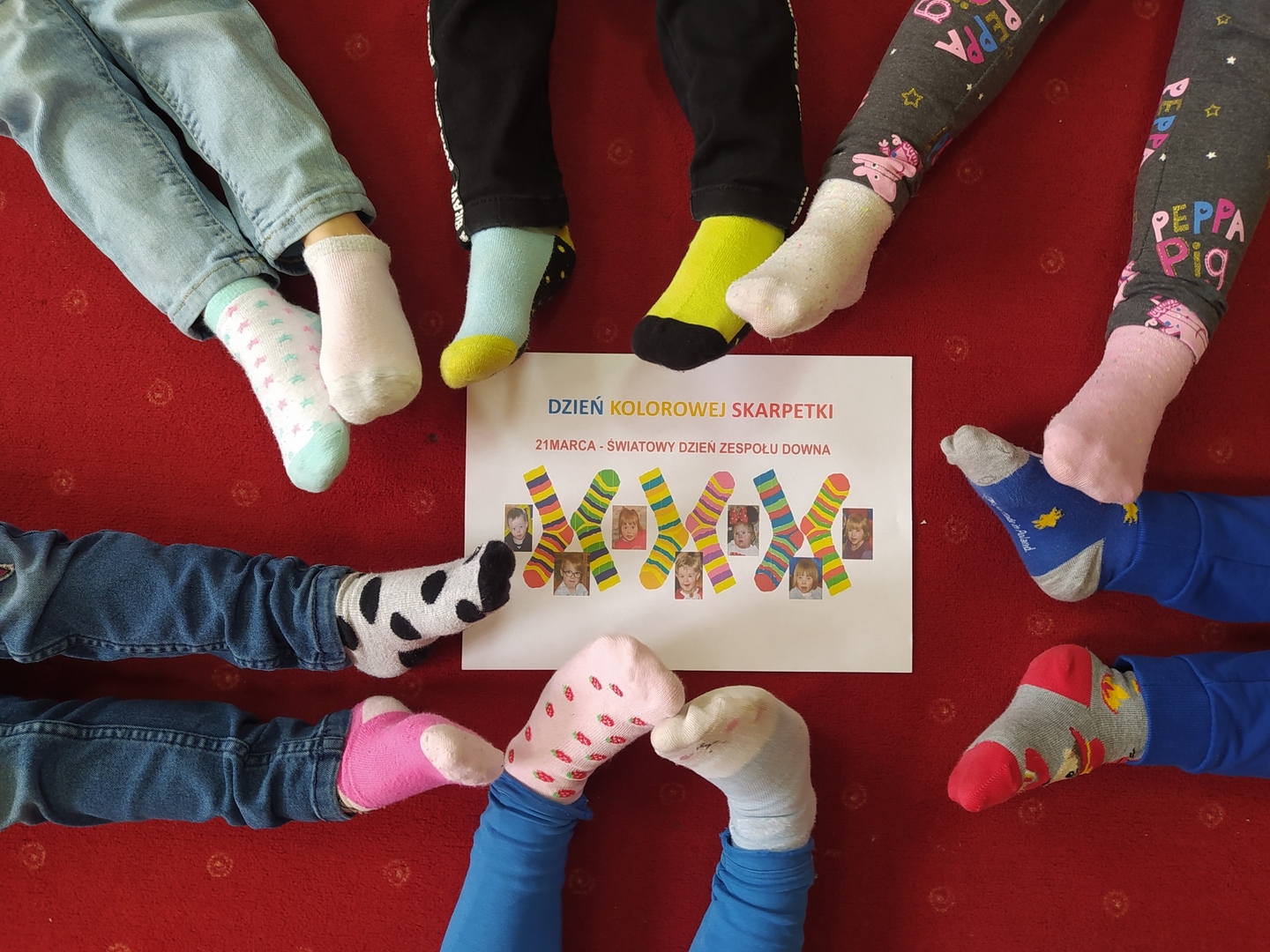 Sama data - kombinacja liczb 21 i 3 - nie jest też przypadkowa, bowiem w 21 parze chromosomów, osoby zdrowe mają 2 chromosomy, podczas gdy osoby z Zespołem Downa - 3. Stąd inna nazwa tej choroby – trisomia 21. W tym roku nasze przedszkolaki z grupy Smerfy aktywnie włączyły się w obchody tego wyjątkowego dnia i już 19 marca założyły kolorowe skarpetki nie do pary. Im bardziej oryginalne, tym lepiej. Ten spontaniczny, niecodzienny gest miał na celu zamanifestowanie odrębności, z której poczuciem na co dzień zmagają się osoby z Zespołem Downa.