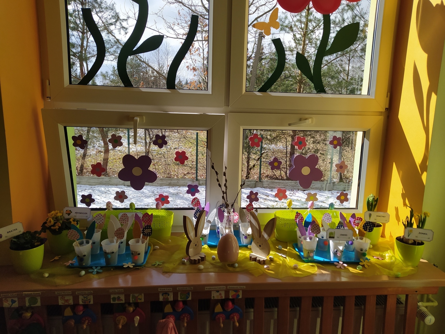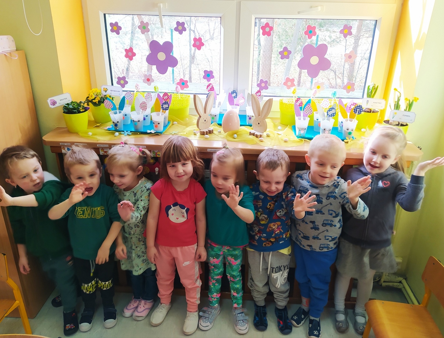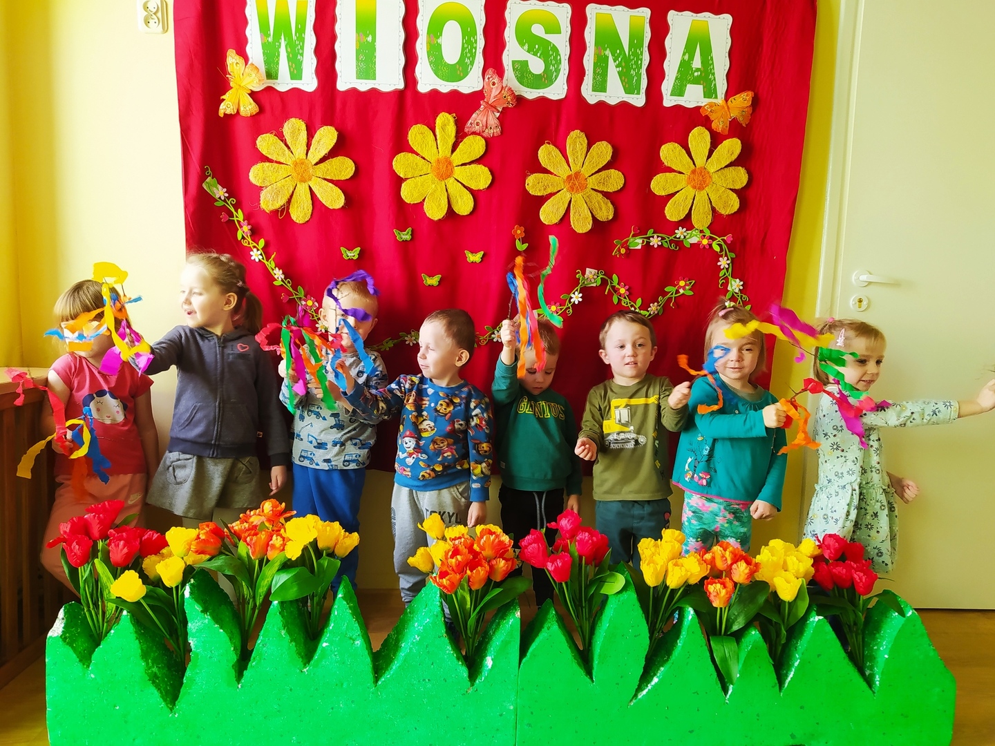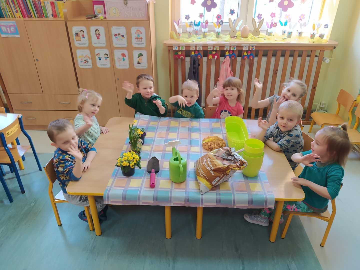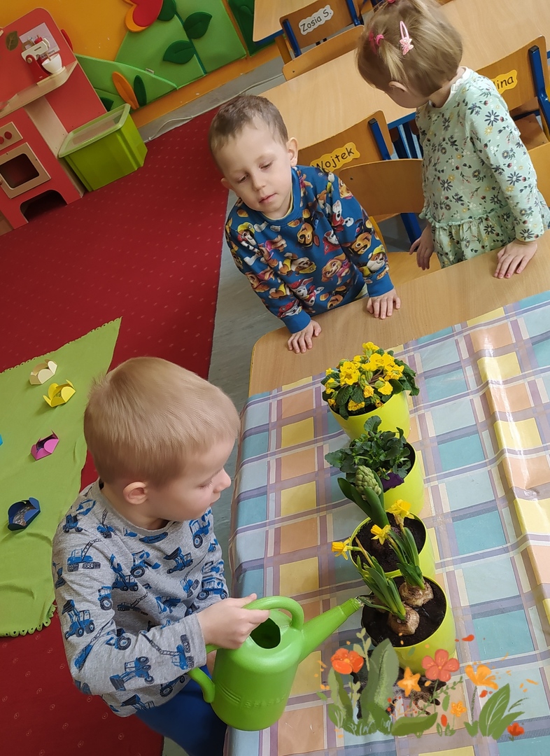 W naszym przedszkolu Smerfne przygotowania do pożegnania zimy i powitania wiosny zaczęły się już kilka dni wcześniej. Zmieniła się dekoracja przedszkola z zimowej na wiosenną, wspólnie przygotowaliśmy kolorowe gałązki, a i w serduszkach zrobiło się jakby cieplej. W dniu 22 marca zaś, zgodnie z tradycją, Smerfy świętowały Pierwszy Dzień Wiosny. Aby podkreślić charakter tego dnia, Przedszkolaki przyszły ubrane w kolorze wiosny, czyli na zielono. Już od rana w sali czekała na nie piękna i barwna niespodzianka od Pani Wiosny- kosz pełen kwiatów. Z ukrytego w nim listu, dowiedzieliśmy się jakie są pierwsze zwiastuny wiosny, a za sprawą „wycieczki” na zieloną łąkę obejrzeliśmy zdjęcia tych że zwiastunów i rozwiązaliśmy zagadki na ich temat. Następnie, przy dźwiękach wiosennych piosenek, wspólnie założyliśmy nasz pierwszy ogródek, w którym zasadziliśmy przyniesione przez Panią Wiosnę kwiaty, a także posialiśmy owies (p.s. pamiętaliśmy o chorujących kolegach i koleżankach i dla nich również zasialiśmy owies). Dzieci głośnym okrzykiem: "Witaj Wiosno, jak się masz, wszyscy Cię witamy, bądź wśród nas" oraz kolorowymi patyczkami witały wiosnę, zaś podczas spaceru wokół przedszkola sprawdzały, gdzie schowała się Wiosna i czy Zima już na dobre pożegnała się z przedszkolem. Wspólnej zabawie towarzyszyło wiele radości i uśmiechu, co wyraziliśmy kolorując portret Pani Wiosny. A teraz już tylko czekamy na cieplejsze wiosenne dni …
