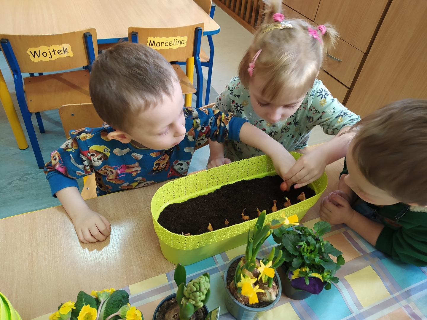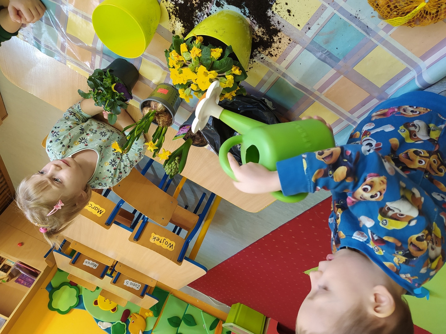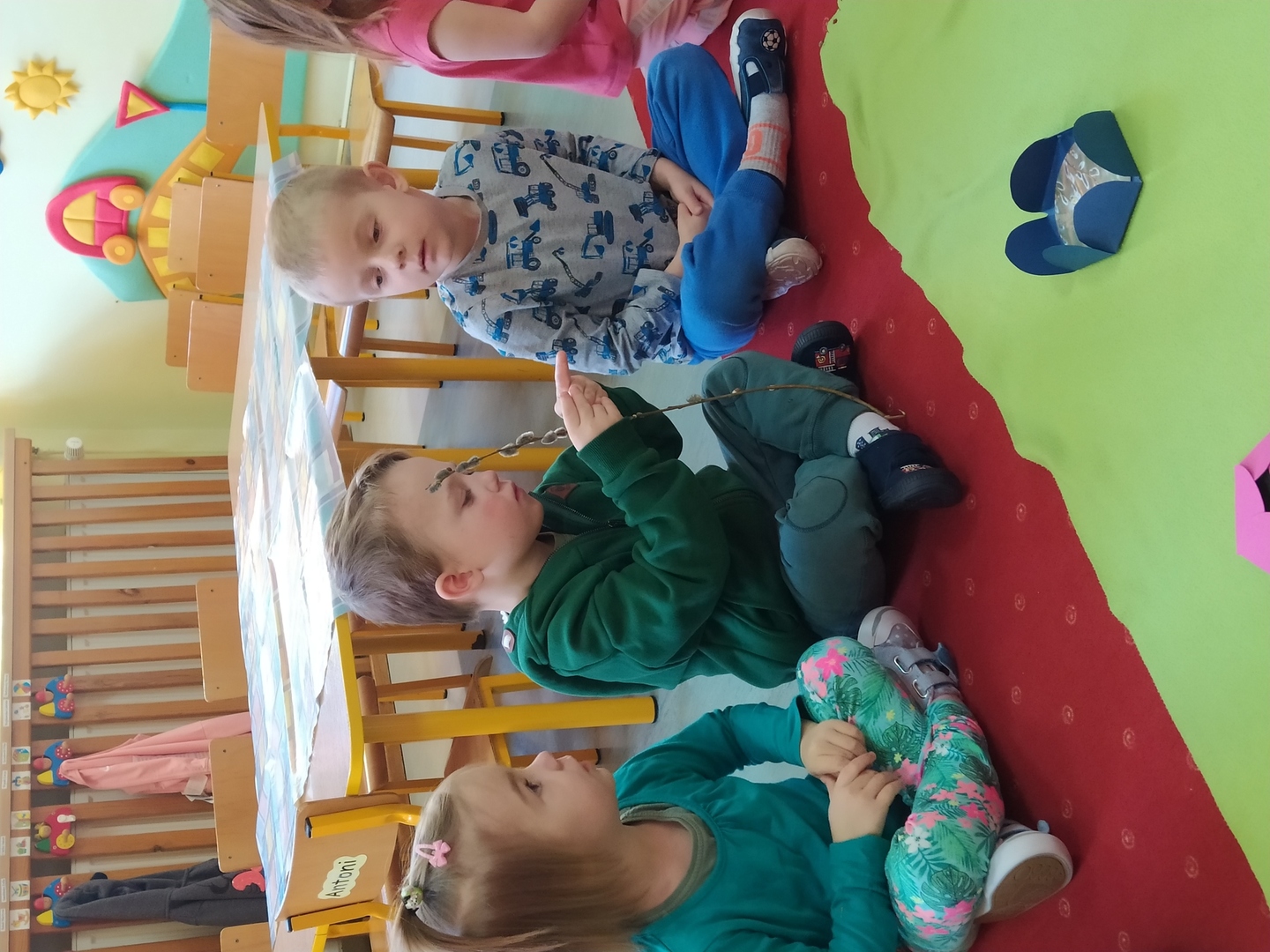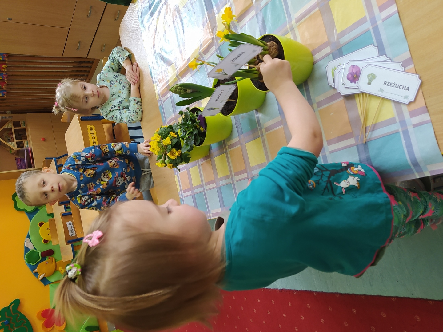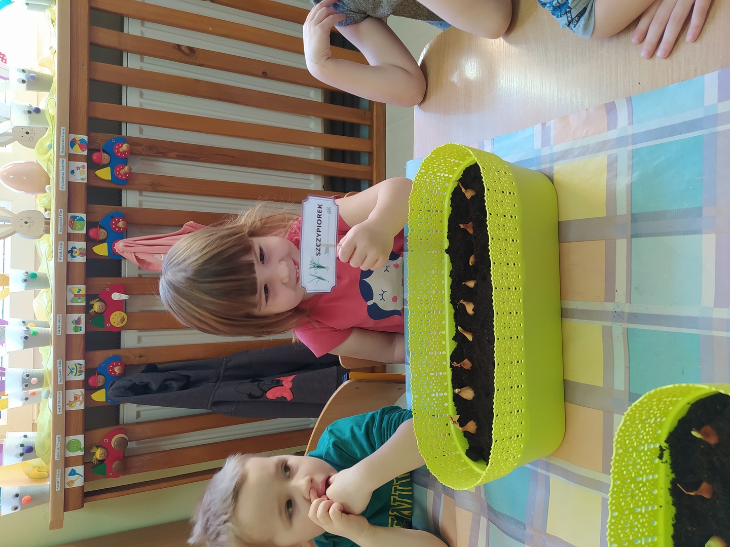 W naszym przedszkolu Smerfne przygotowania do pożegnania zimy i powitania wiosny zaczęły się już kilka dni wcześniej. Zmieniła się dekoracja przedszkola z zimowej na wiosenną, wspólnie przygotowaliśmy kolorowe gałązki, a i w serduszkach zrobiło się jakby cieplej. W dniu 22 marca zaś, zgodnie z tradycją, Smerfy świętowały Pierwszy Dzień Wiosny. Aby podkreślić charakter tego dnia, Przedszkolaki przyszły ubrane w kolorze wiosny, czyli na zielono. Już od rana w sali czekała na nie piękna i barwna niespodzianka od Pani Wiosny- kosz pełen kwiatów. Z ukrytego w nim listu, dowiedzieliśmy się jakie są pierwsze zwiastuny wiosny, a za sprawą „wycieczki” na zieloną łąkę obejrzeliśmy zdjęcia tych że zwiastunów i rozwiązaliśmy zagadki na ich temat. Następnie, przy dźwiękach wiosennych piosenek, wspólnie założyliśmy nasz pierwszy ogródek, w którym zasadziliśmy przyniesione przez Panią Wiosnę kwiaty, a także posialiśmy owies (p.s. pamiętaliśmy o chorujących kolegach i koleżankach i dla nich również zasialiśmy owies). Dzieci głośnym okrzykiem: "Witaj Wiosno, jak się masz, wszyscy Cię witamy, bądź wśród nas" oraz kolorowymi patyczkami witały wiosnę, zaś podczas spaceru wokół przedszkola sprawdzały, gdzie schowała się Wiosna i czy Zima już na dobre pożegnała się z przedszkolem. Wspólnej zabawie towarzyszyło wiele radości i uśmiechu, co wyraziliśmy kolorując portret Pani Wiosny. A teraz już tylko czekamy na cieplejsze wiosenne dni …