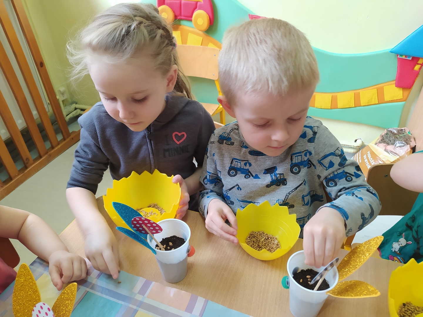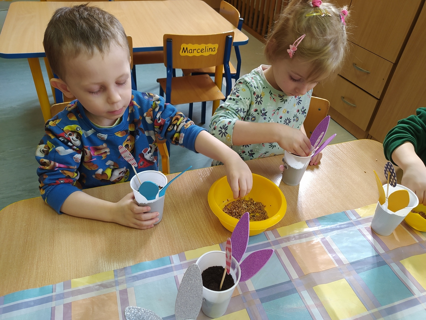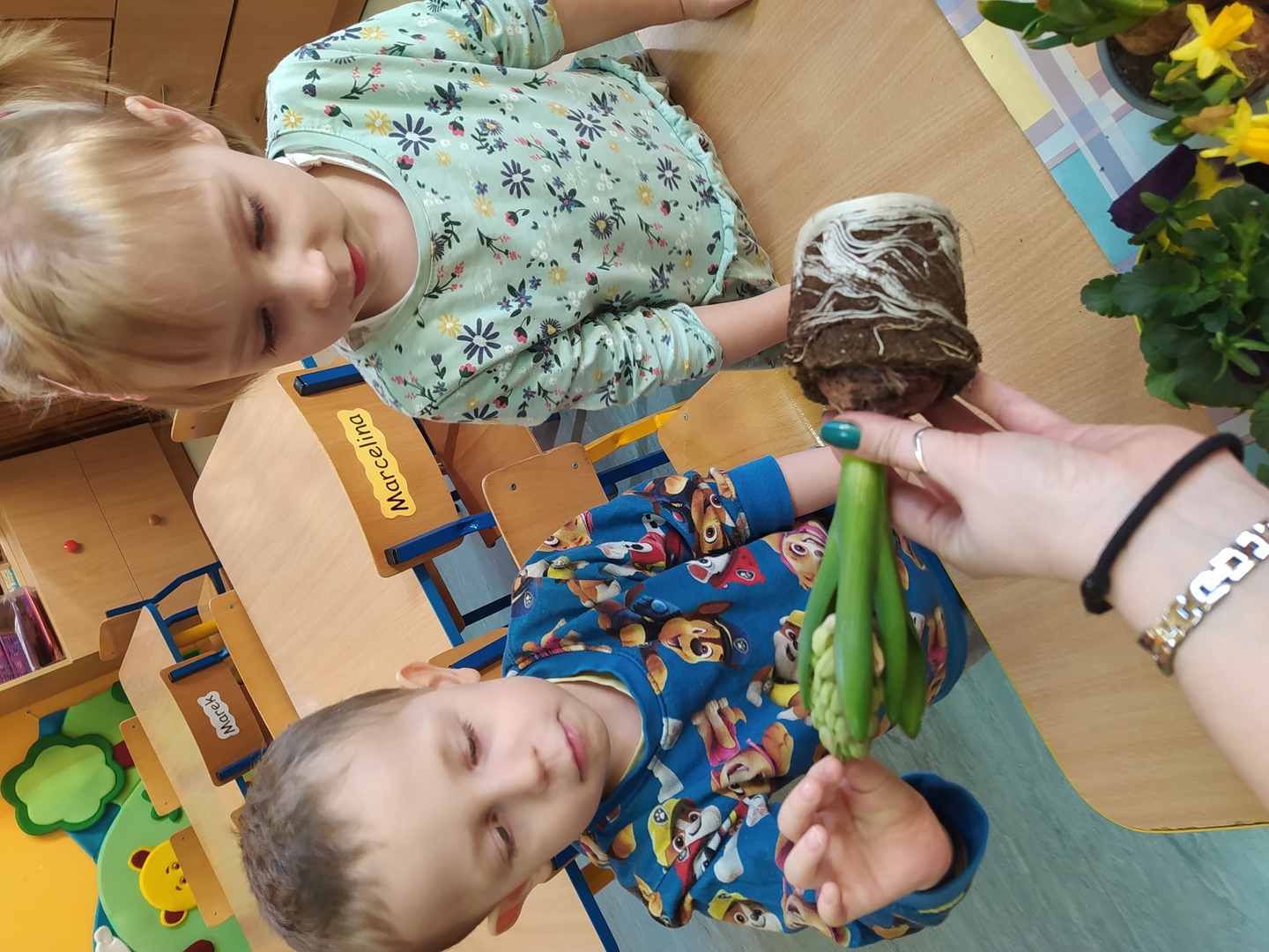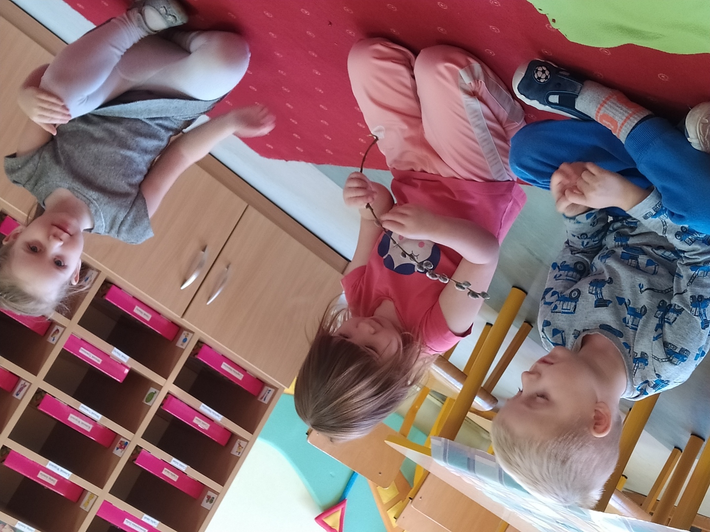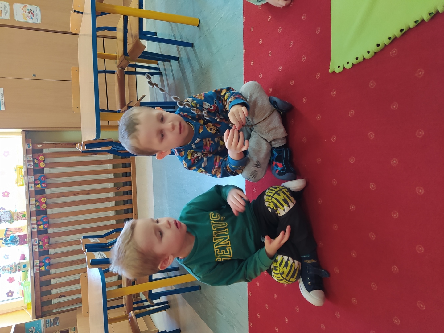 W naszym przedszkolu Smerfne przygotowania do pożegnania zimy i powitania wiosny zaczęły się już kilka dni wcześniej. Zmieniła się dekoracja przedszkola z zimowej na wiosenną, wspólnie przygotowaliśmy kolorowe gałązki, a i w serduszkach zrobiło się jakby cieplej. W dniu 22 marca zaś, zgodnie z tradycją, Smerfy świętowały Pierwszy Dzień Wiosny. Aby podkreślić charakter tego dnia, Przedszkolaki przyszły ubrane w kolorze wiosny, czyli na zielono. Już od rana w sali czekała na nie piękna i barwna niespodzianka od Pani Wiosny- kosz pełen kwiatów. Z ukrytego w nim listu, dowiedzieliśmy się jakie są pierwsze zwiastuny wiosny, a za sprawą „wycieczki” na zieloną łąkę obejrzeliśmy zdjęcia tych że zwiastunów i rozwiązaliśmy zagadki na ich temat. Następnie, przy dźwiękach wiosennych piosenek, wspólnie założyliśmy nasz pierwszy ogródek, w którym zasadziliśmy przyniesione przez Panią Wiosnę kwiaty, a także posialiśmy owies (p.s. pamiętaliśmy o chorujących kolegach i koleżankach i dla nich również zasialiśmy owies). Dzieci głośnym okrzykiem: "Witaj Wiosno, jak się masz, wszyscy Cię witamy, bądź wśród nas" oraz kolorowymi patyczkami witały wiosnę, zaś podczas spaceru wokół przedszkola sprawdzały, gdzie schowała się Wiosna i czy Zima już na dobre pożegnała się z przedszkolem. Wspólnej zabawie towarzyszyło wiele radości i uśmiechu, co wyraziliśmy kolorując portret Pani Wiosny. A teraz już tylko czekamy na cieplejsze wiosenne dni …