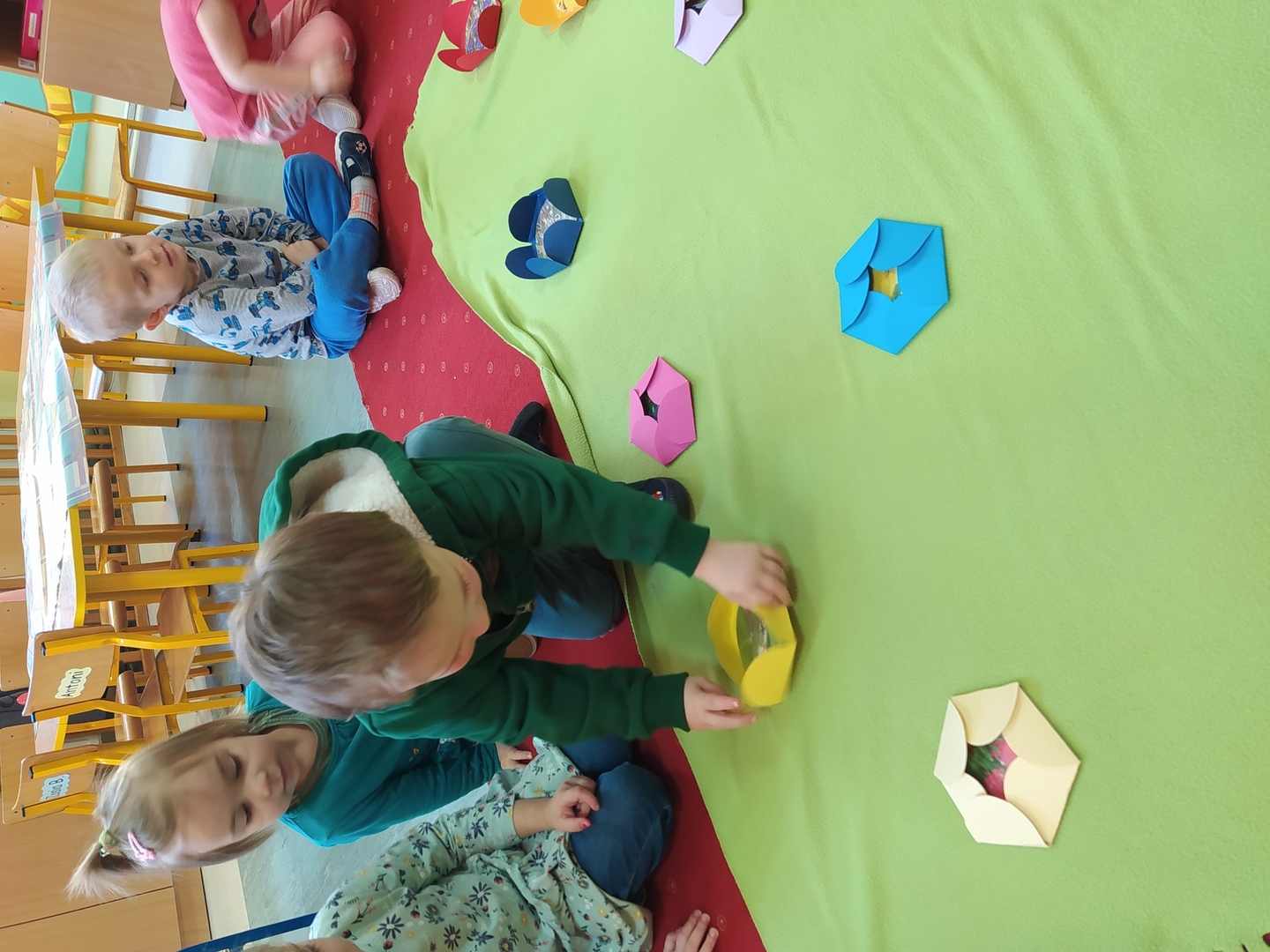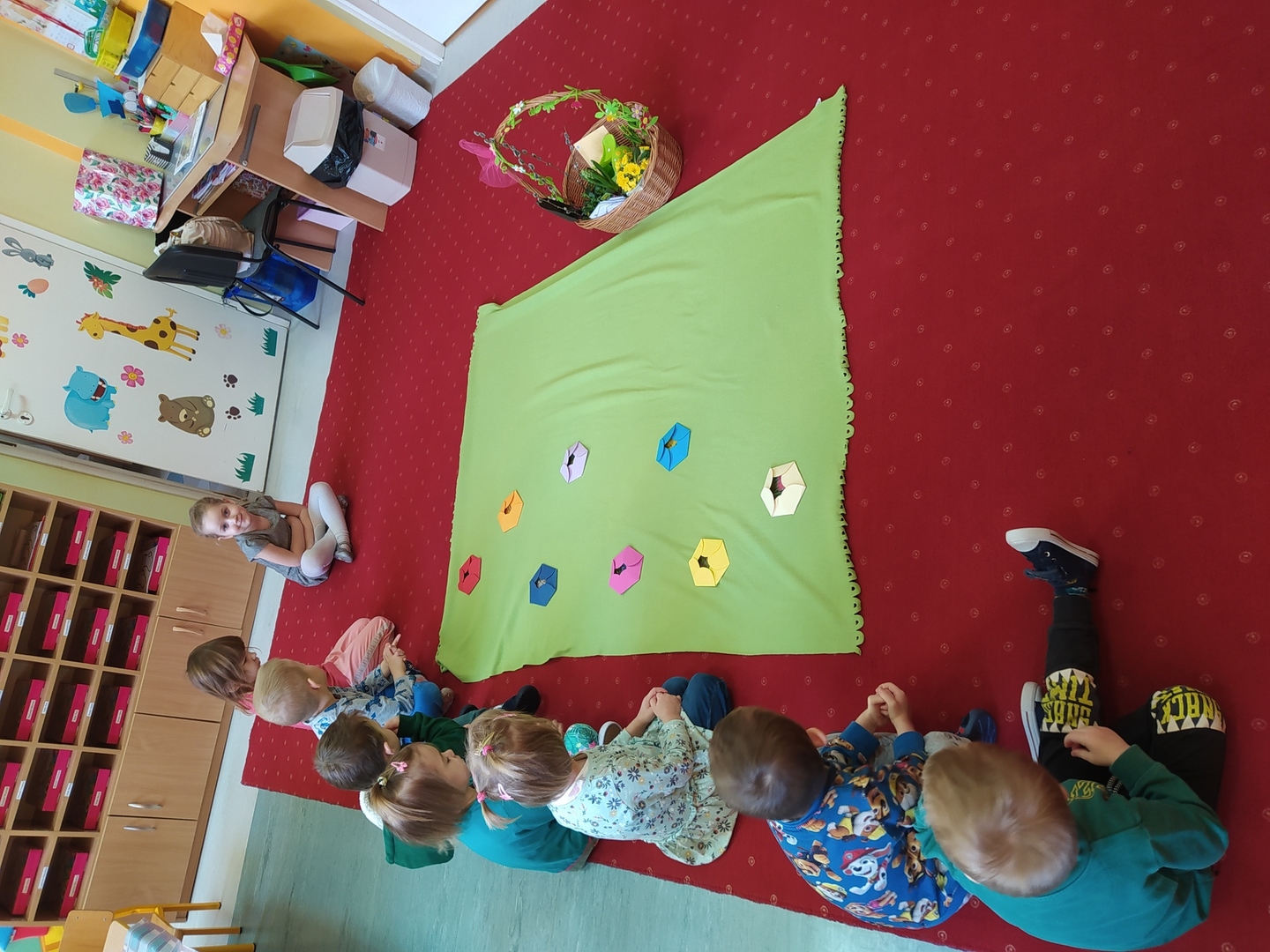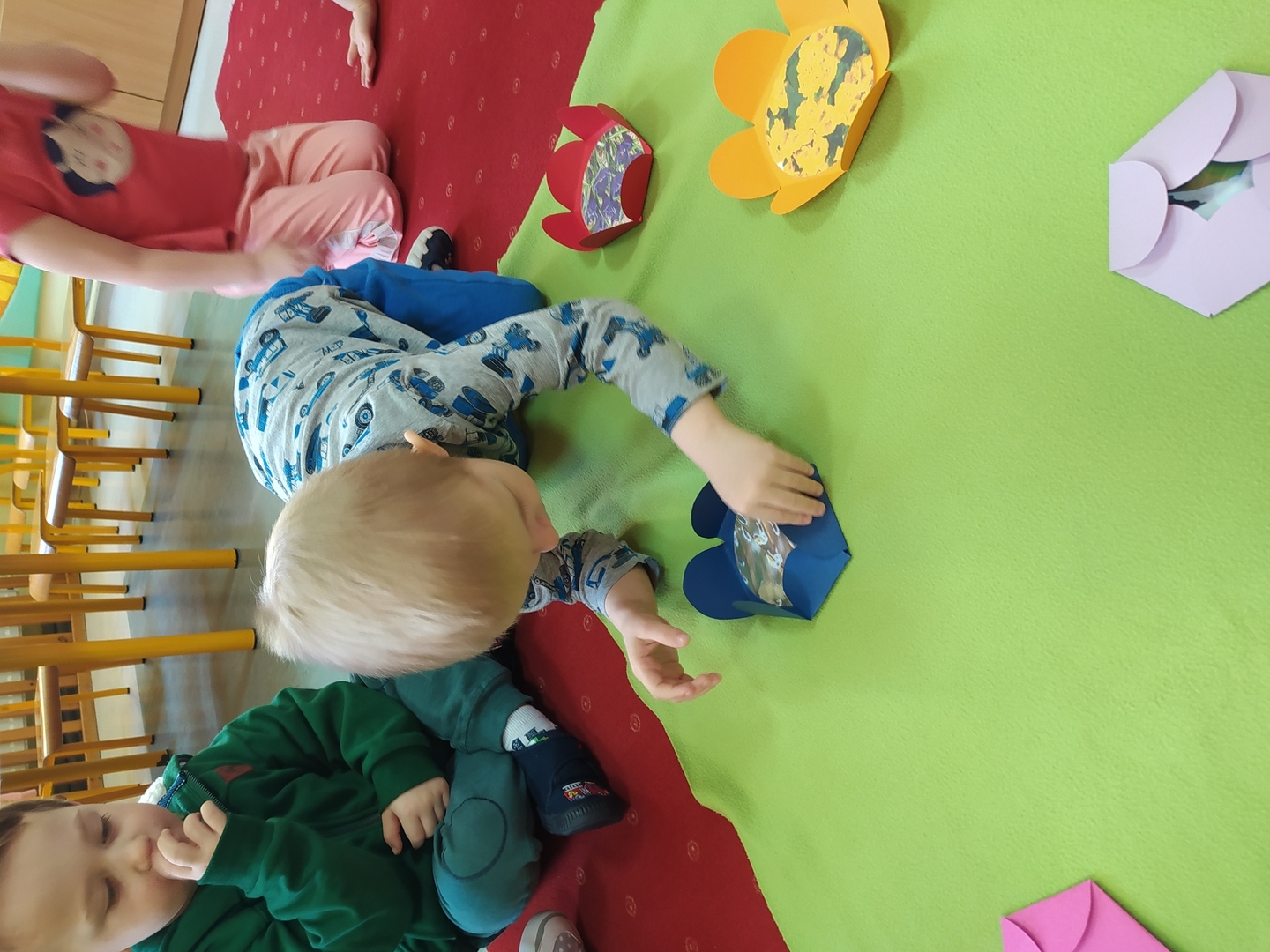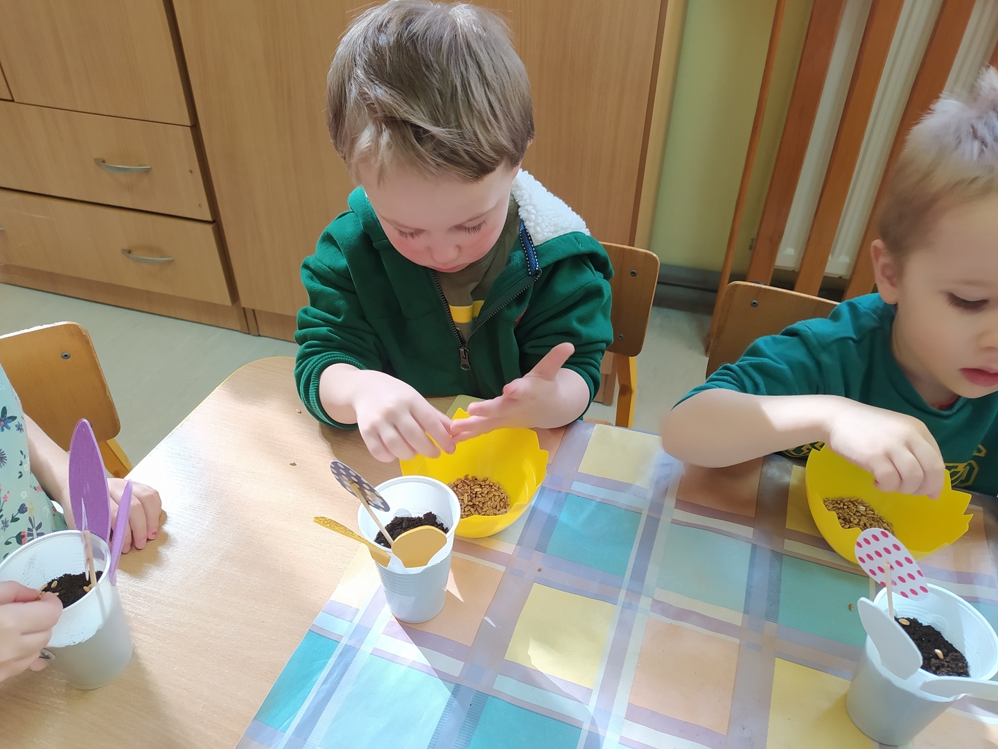 W naszym przedszkolu Smerfne przygotowania do pożegnania zimy i powitania wiosny zaczęły się już kilka dni wcześniej. Zmieniła się dekoracja przedszkola z zimowej na wiosenną, wspólnie przygotowaliśmy kolorowe gałązki, a i w serduszkach zrobiło się jakby cieplej. W dniu 22 marca zaś, zgodnie z tradycją, Smerfy świętowały Pierwszy Dzień Wiosny. Aby podkreślić charakter tego dnia, Przedszkolaki przyszły ubrane w kolorze wiosny, czyli na zielono. Już od rana w sali czekała na nie piękna i barwna niespodzianka od Pani Wiosny- kosz pełen kwiatów. Z ukrytego w nim listu, dowiedzieliśmy się jakie są pierwsze zwiastuny wiosny, a za sprawą „wycieczki” na zieloną łąkę obejrzeliśmy zdjęcia tych że zwiastunów i rozwiązaliśmy zagadki na ich temat. Następnie, przy dźwiękach wiosennych piosenek, wspólnie założyliśmy nasz pierwszy ogródek, w którym zasadziliśmy przyniesione przez Panią Wiosnę kwiaty, a także posialiśmy owies (p.s. pamiętaliśmy o chorujących kolegach i koleżankach i dla nich również zasialiśmy owies). Dzieci głośnym okrzykiem: "Witaj Wiosno, jak się masz, wszyscy Cię witamy, bądź wśród nas" oraz kolorowymi patyczkami witały wiosnę, zaś podczas spaceru wokół przedszkola sprawdzały, gdzie schowała się Wiosna i czy Zima już na dobre pożegnała się z przedszkolem. Wspólnej zabawie towarzyszyło wiele radości i uśmiechu, co wyraziliśmy kolorując portret Pani Wiosny. A teraz już tylko czekamy na cieplejsze wiosenne dni …