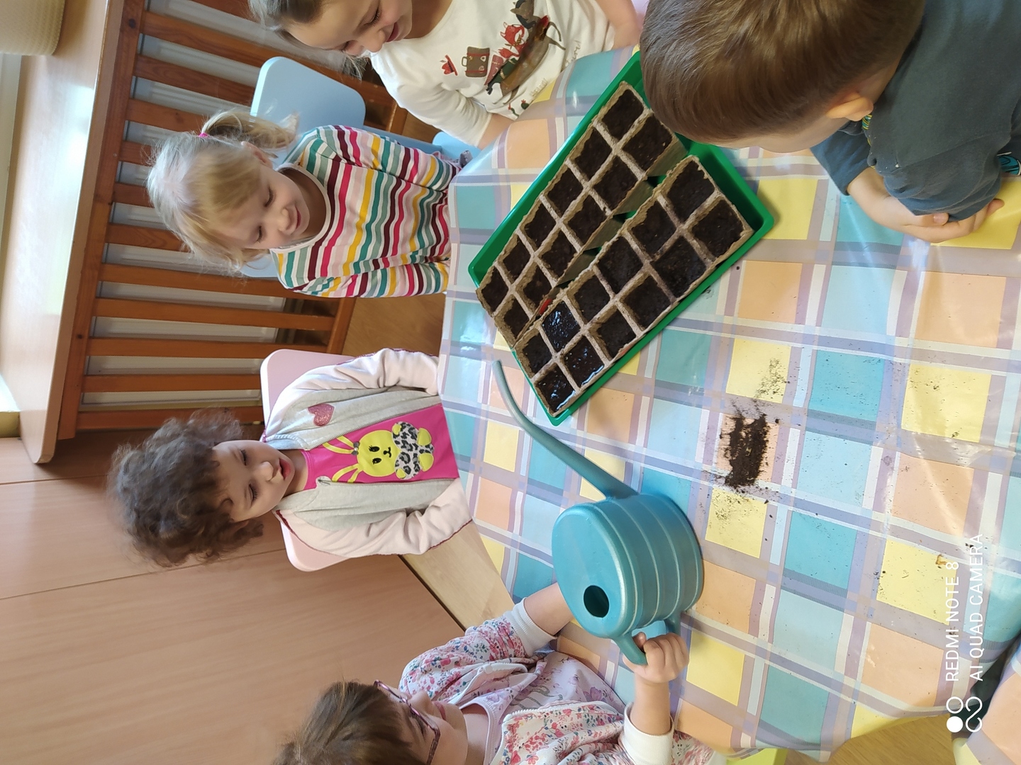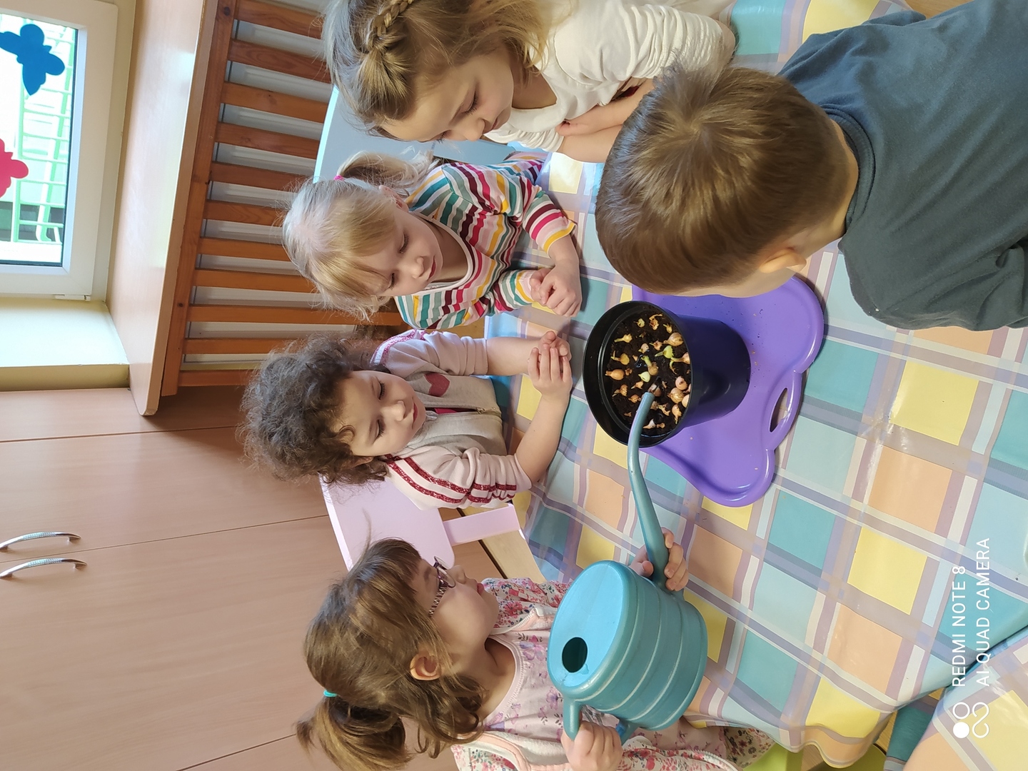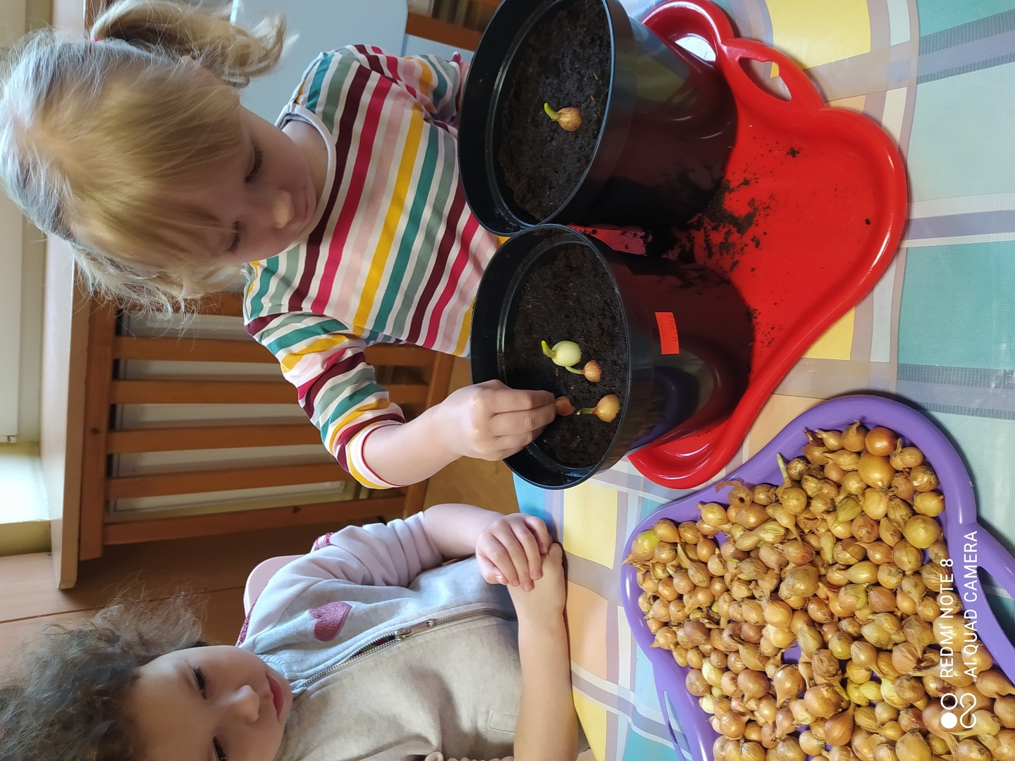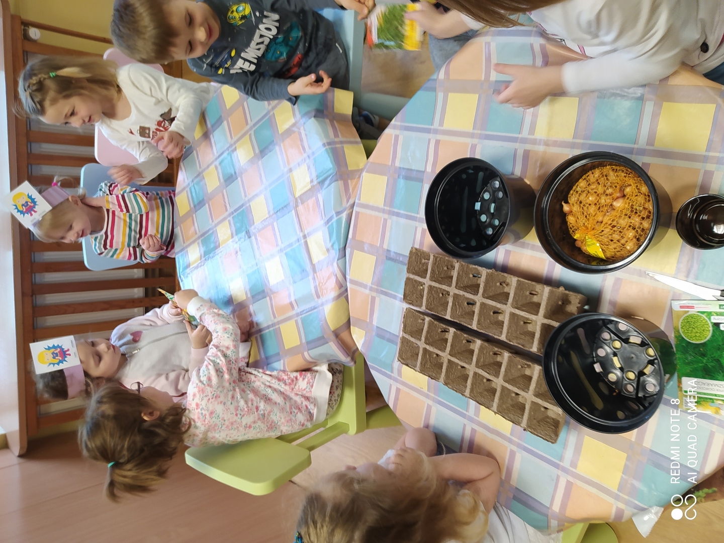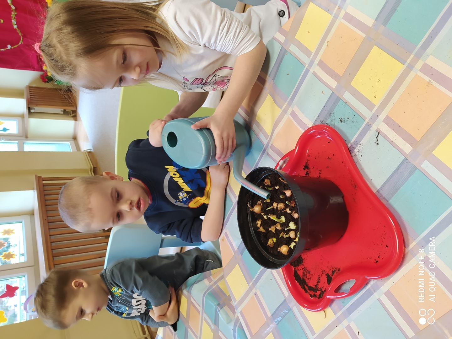 Przedszkolaki z ochotą współpracowały ze sobą podczas napełniania doniczek ziemią, sadzenia cebulek na szczypiorek, wysiewania nasion warzyw i kwiatów oraz podlewania. A po skończonych zajęciach równie chętnie pomagały przy porządkowaniu sali. Brawo Gumisie! Teraz z niecierpliwością będziemy obserwować zmiany zachodzące w naszym kąciku przyrody i czekać na owoce naszej pracy :)