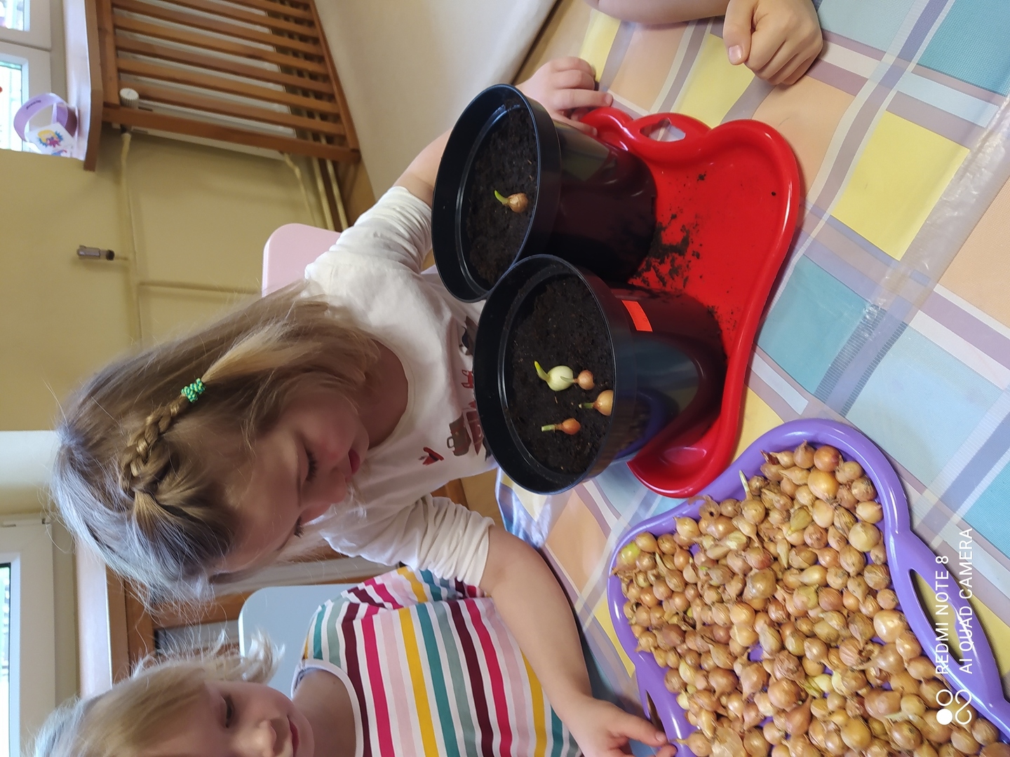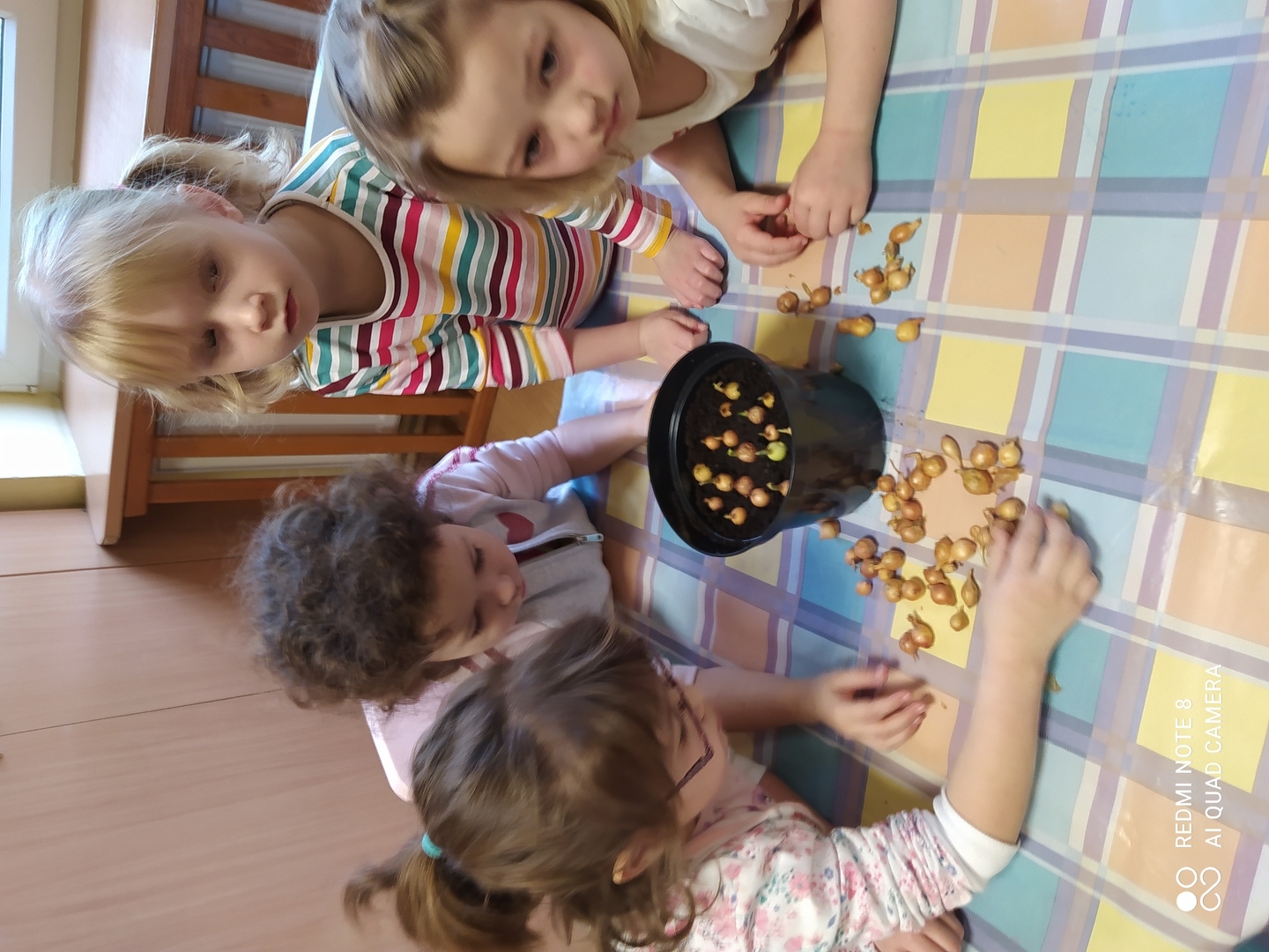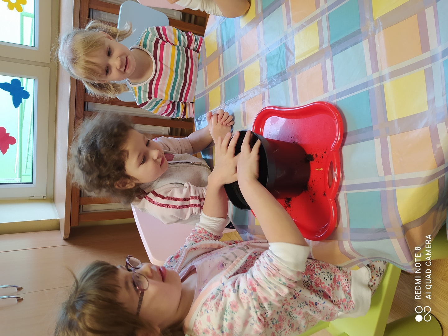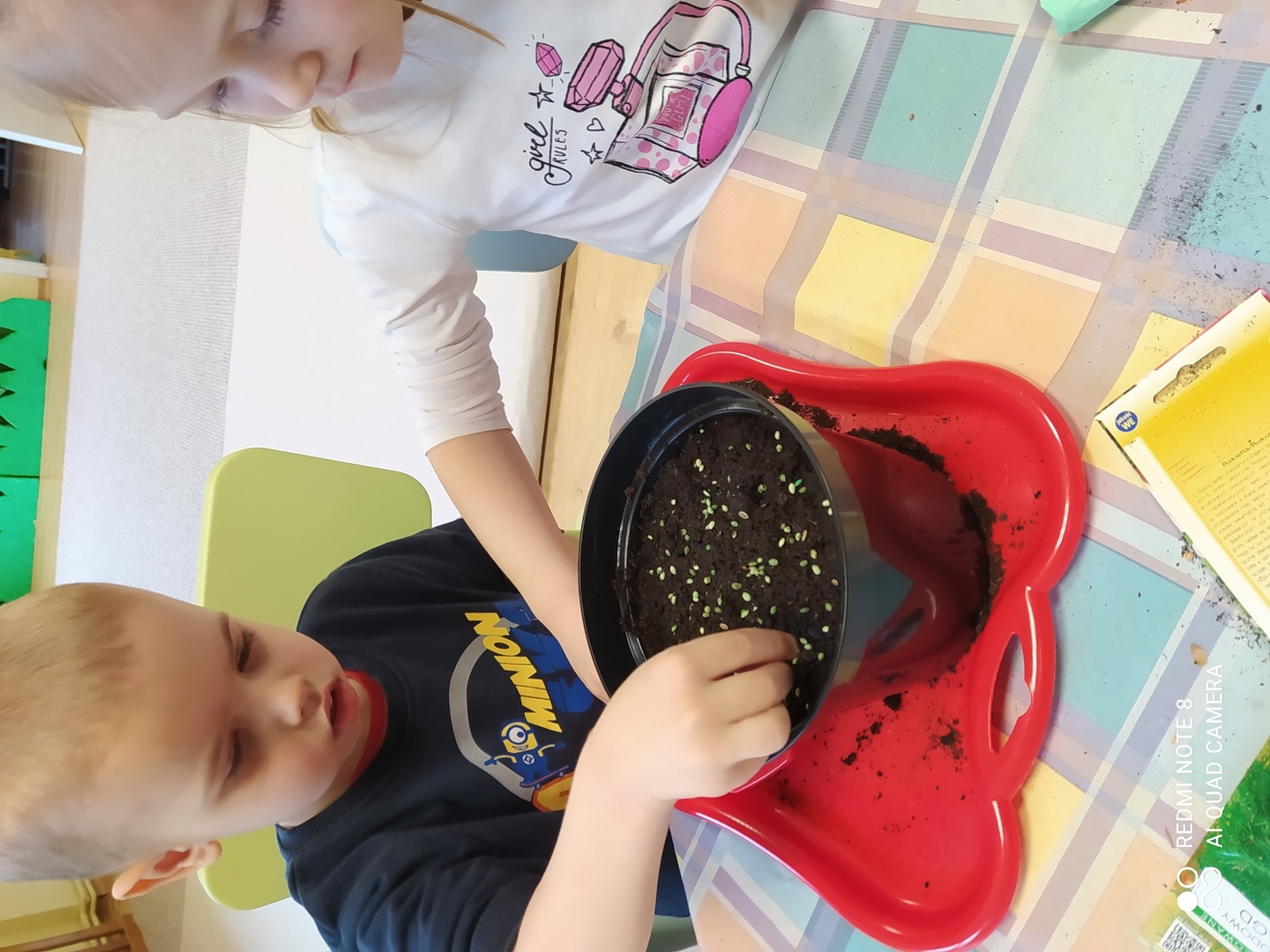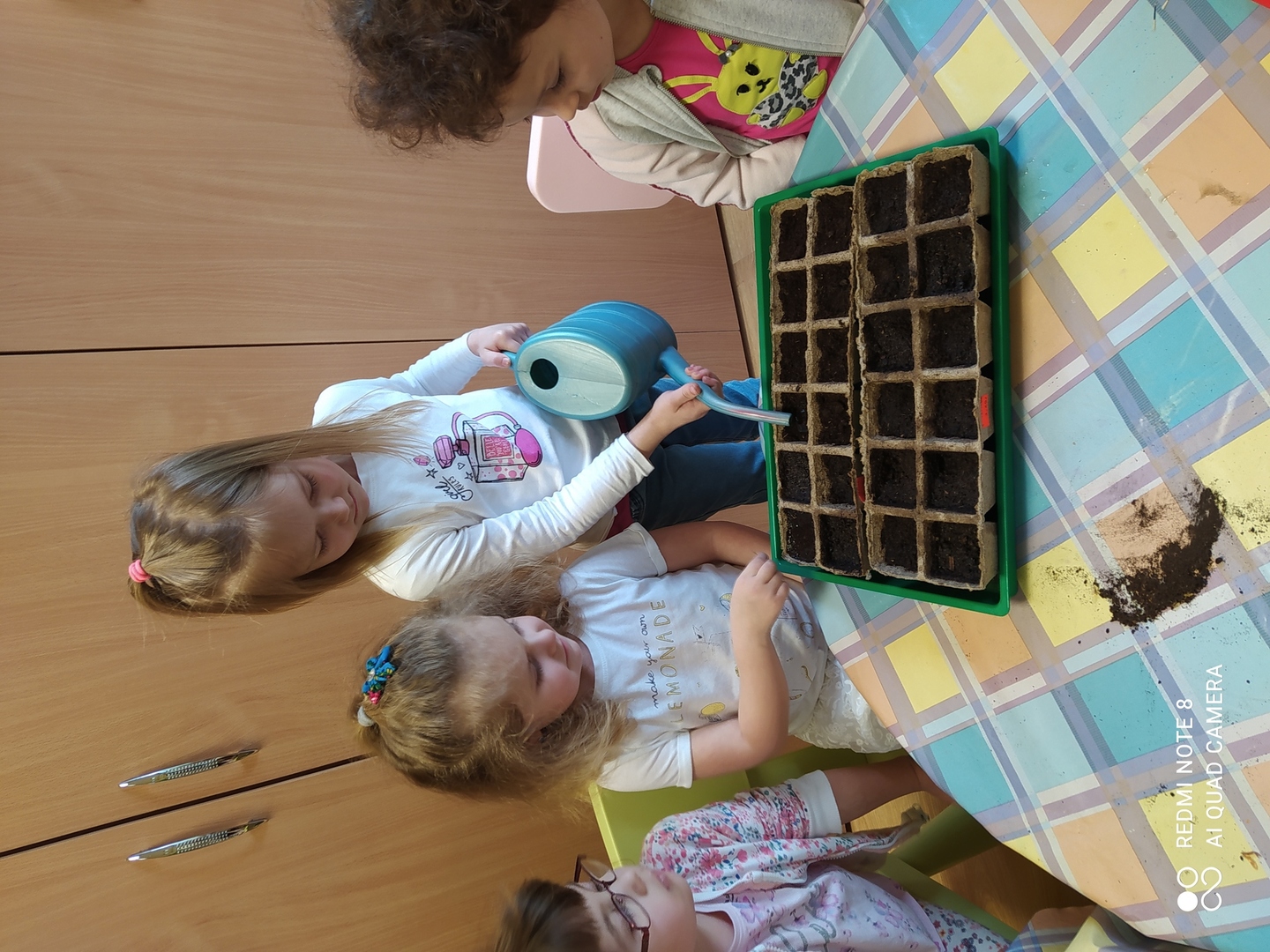 Przedszkolaki z ochotą współpracowały ze sobą podczas napełniania doniczek ziemią, sadzenia cebulek na szczypiorek, wysiewania nasion warzyw i kwiatów oraz podlewania. A po skończonych zajęciach równie chętnie pomagały przy porządkowaniu sali. Brawo Gumisie! Teraz z niecierpliwością będziemy obserwować zmiany zachodzące w naszym kąciku przyrody i czekać na owoce naszej pracy :)