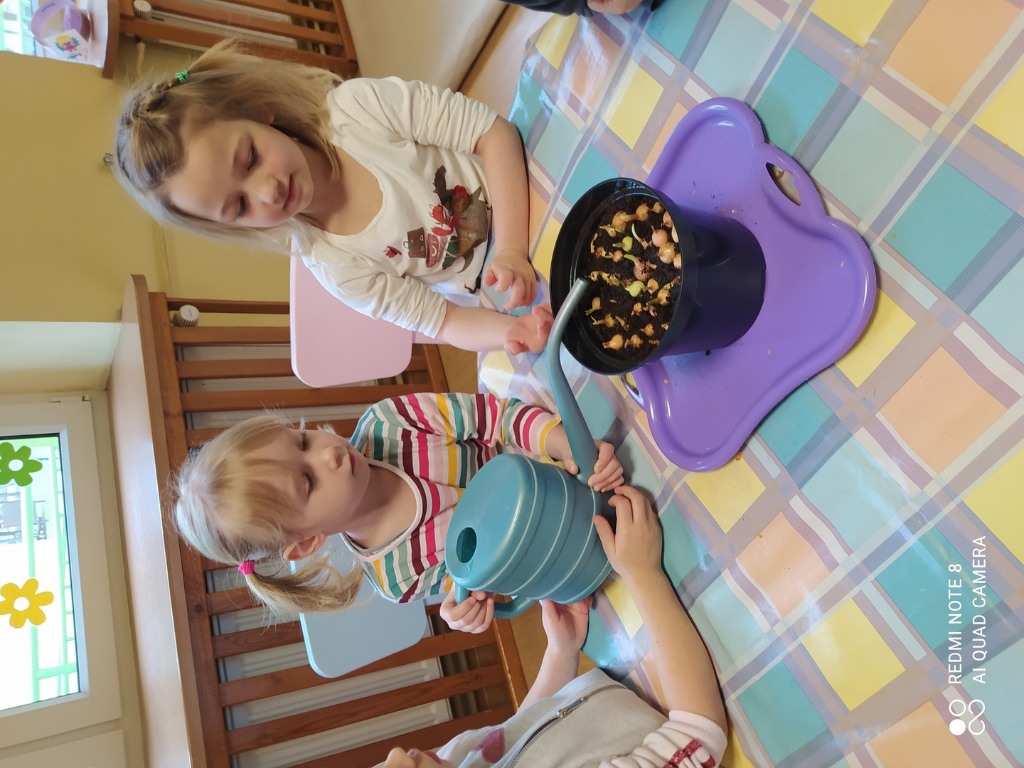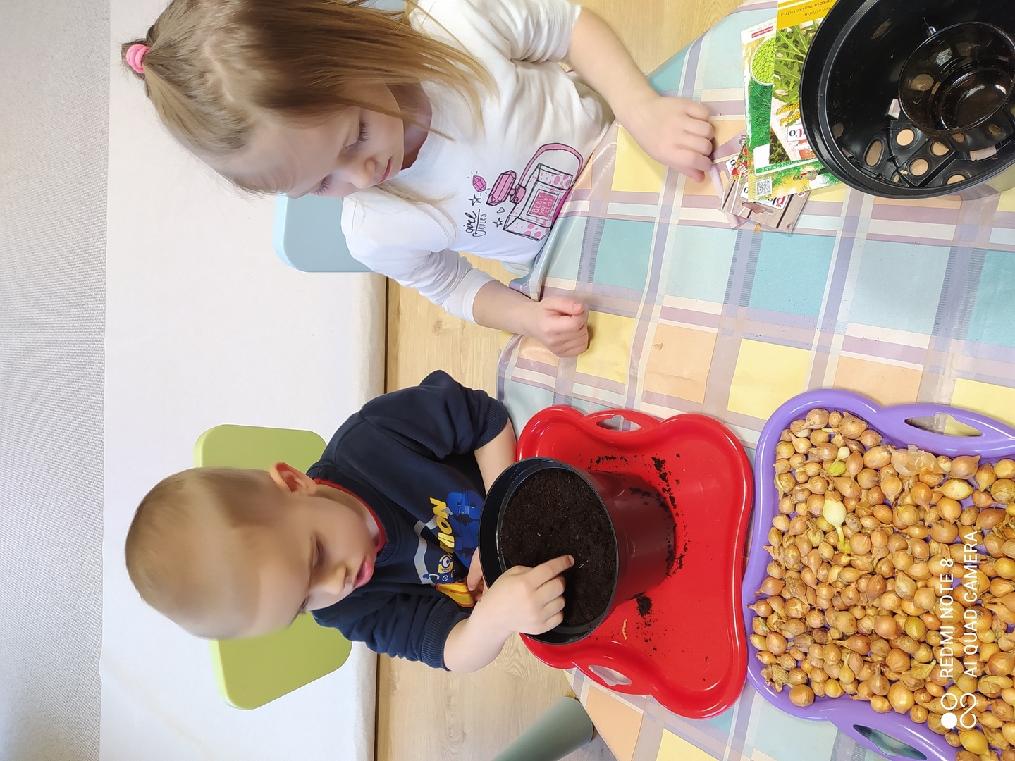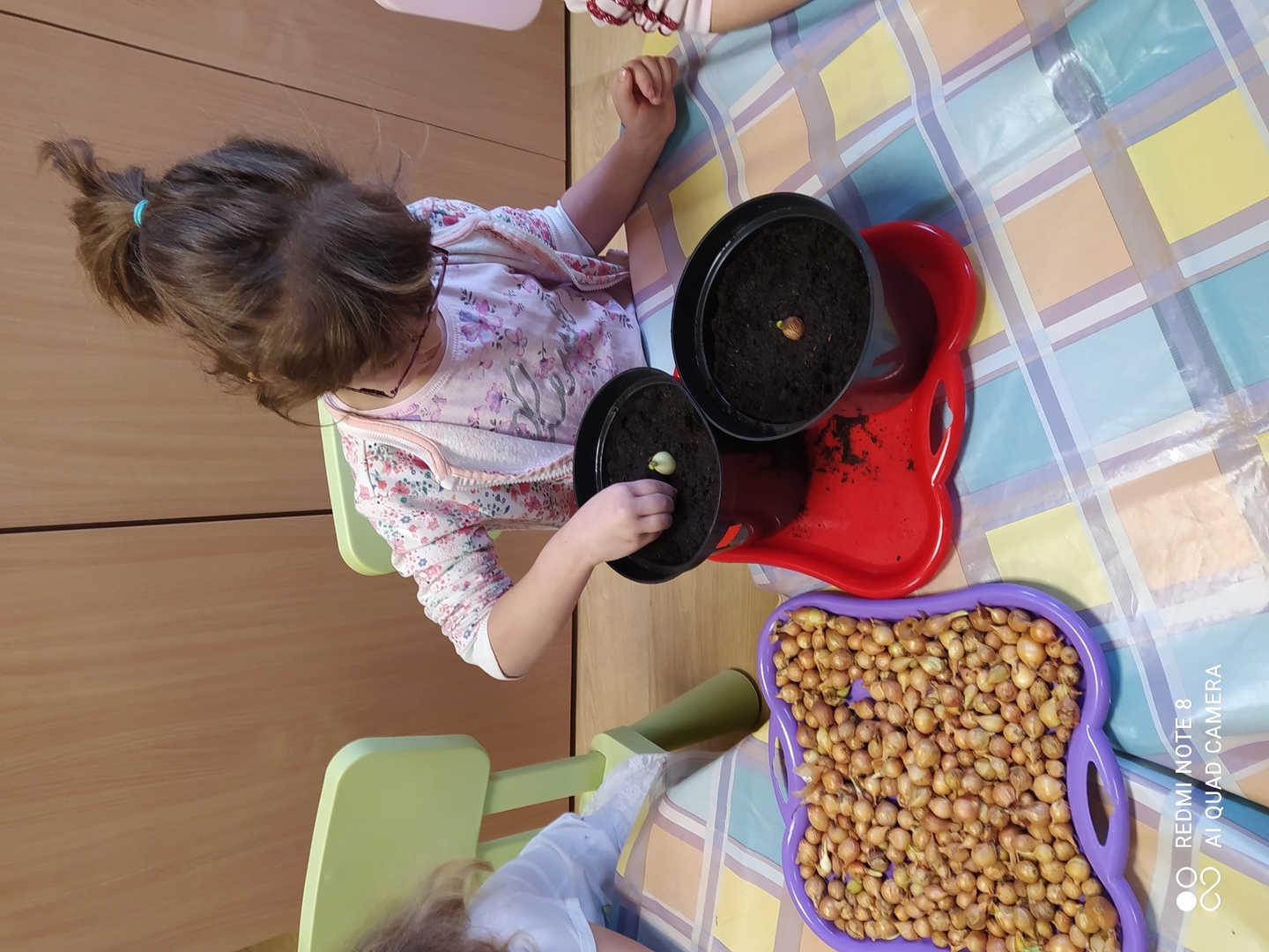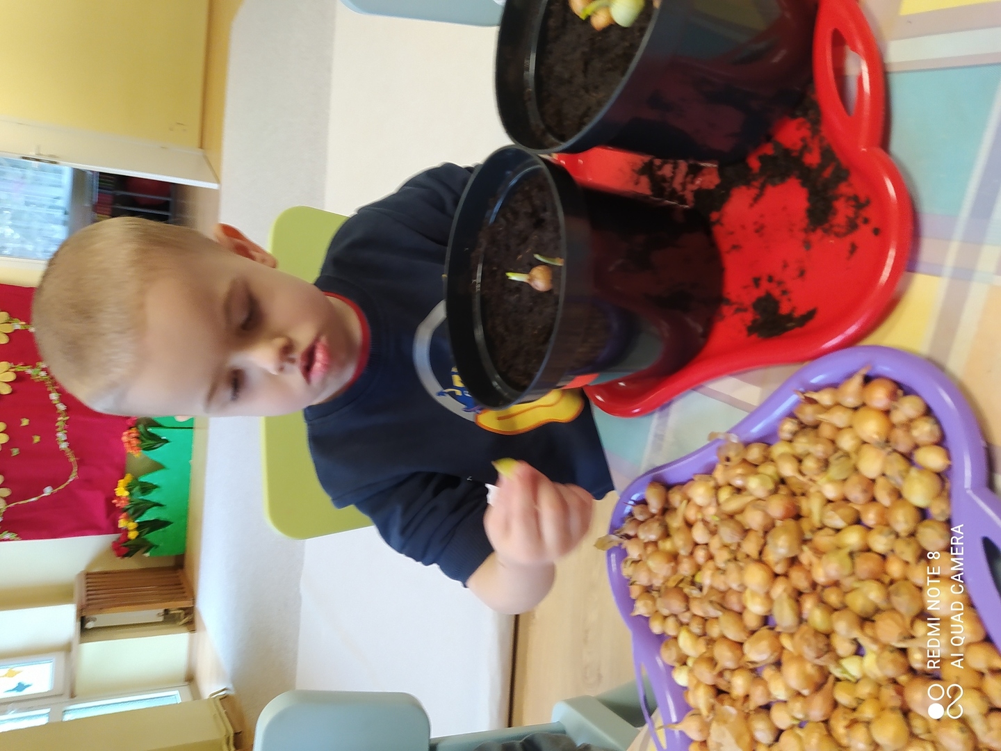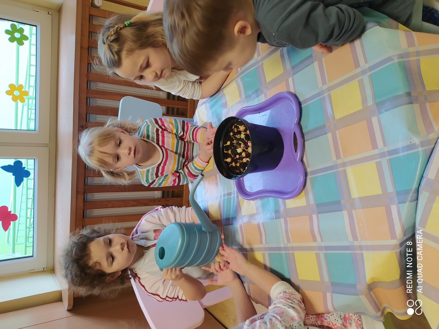 Przedszkolaki z ochotą współpracowały ze sobą podczas napełniania doniczek ziemią, sadzenia cebulek na szczypiorek, wysiewania nasion warzyw i kwiatów oraz podlewania. A po skończonych zajęciach równie chętnie pomagały przy porządkowaniu sali. Brawo Gumisie! Teraz z niecierpliwością będziemy obserwować zmiany zachodzące w naszym kąciku przyrody i czekać na owoce naszej pracy :)