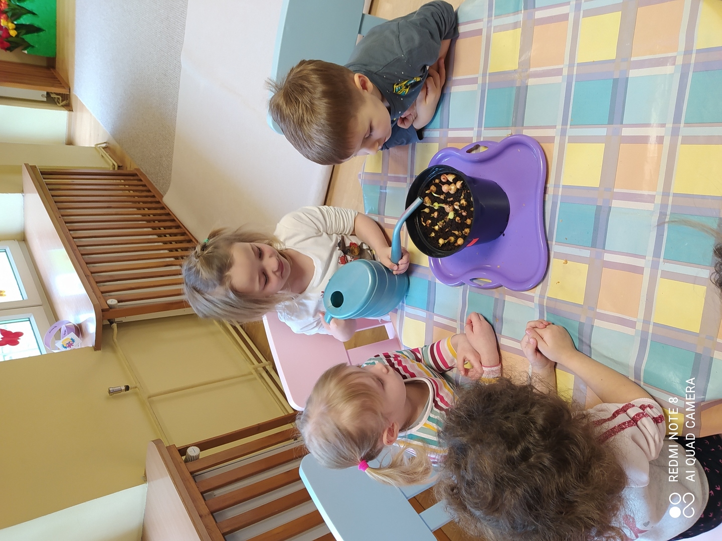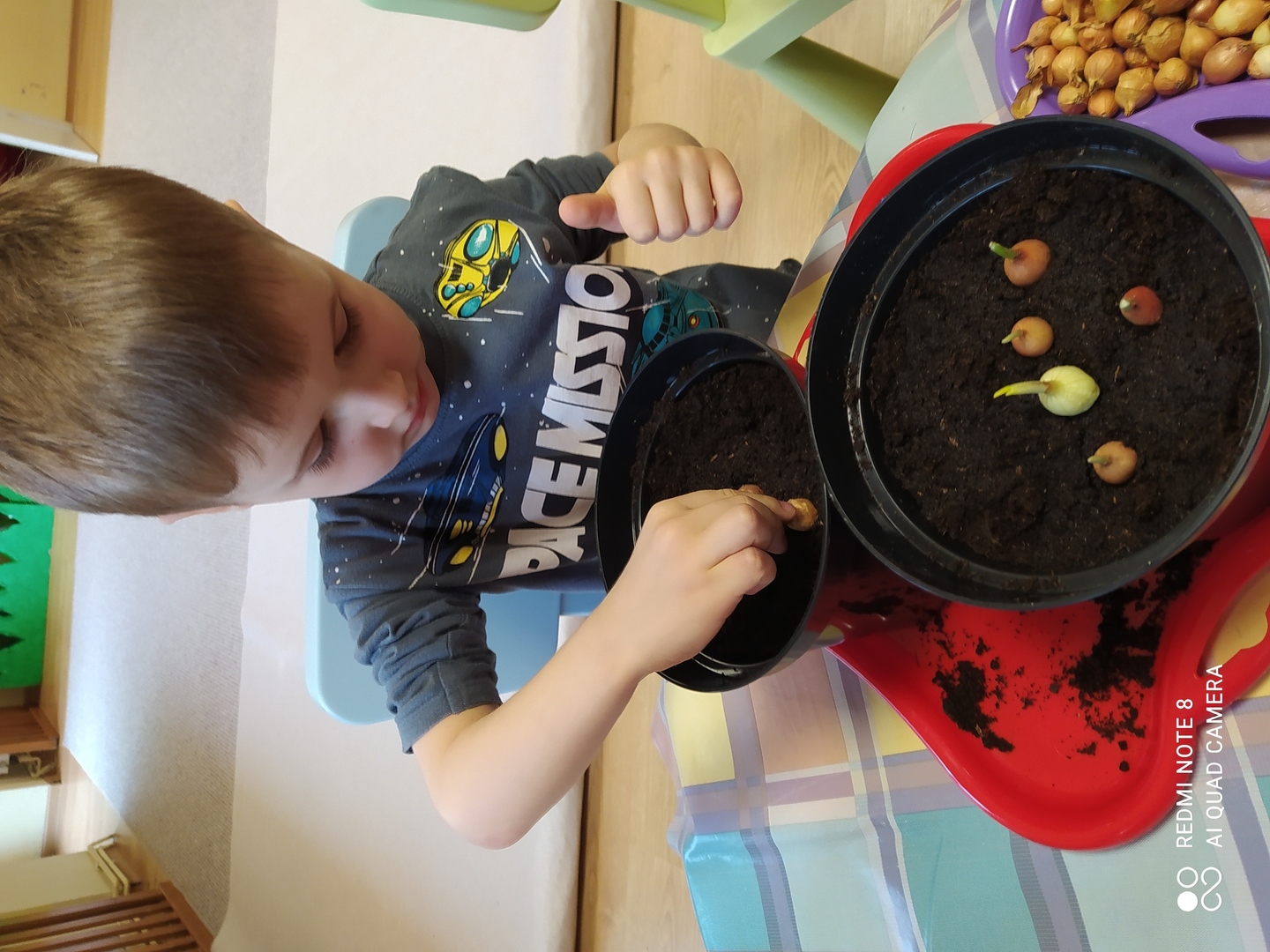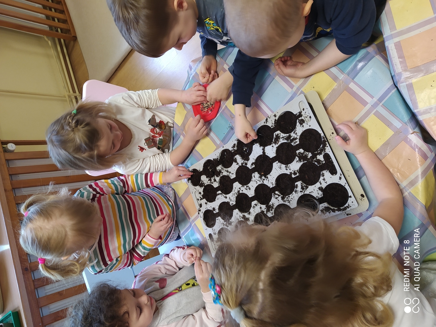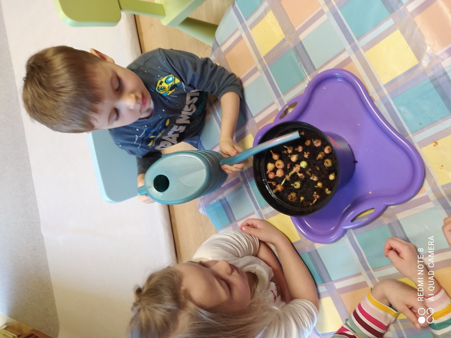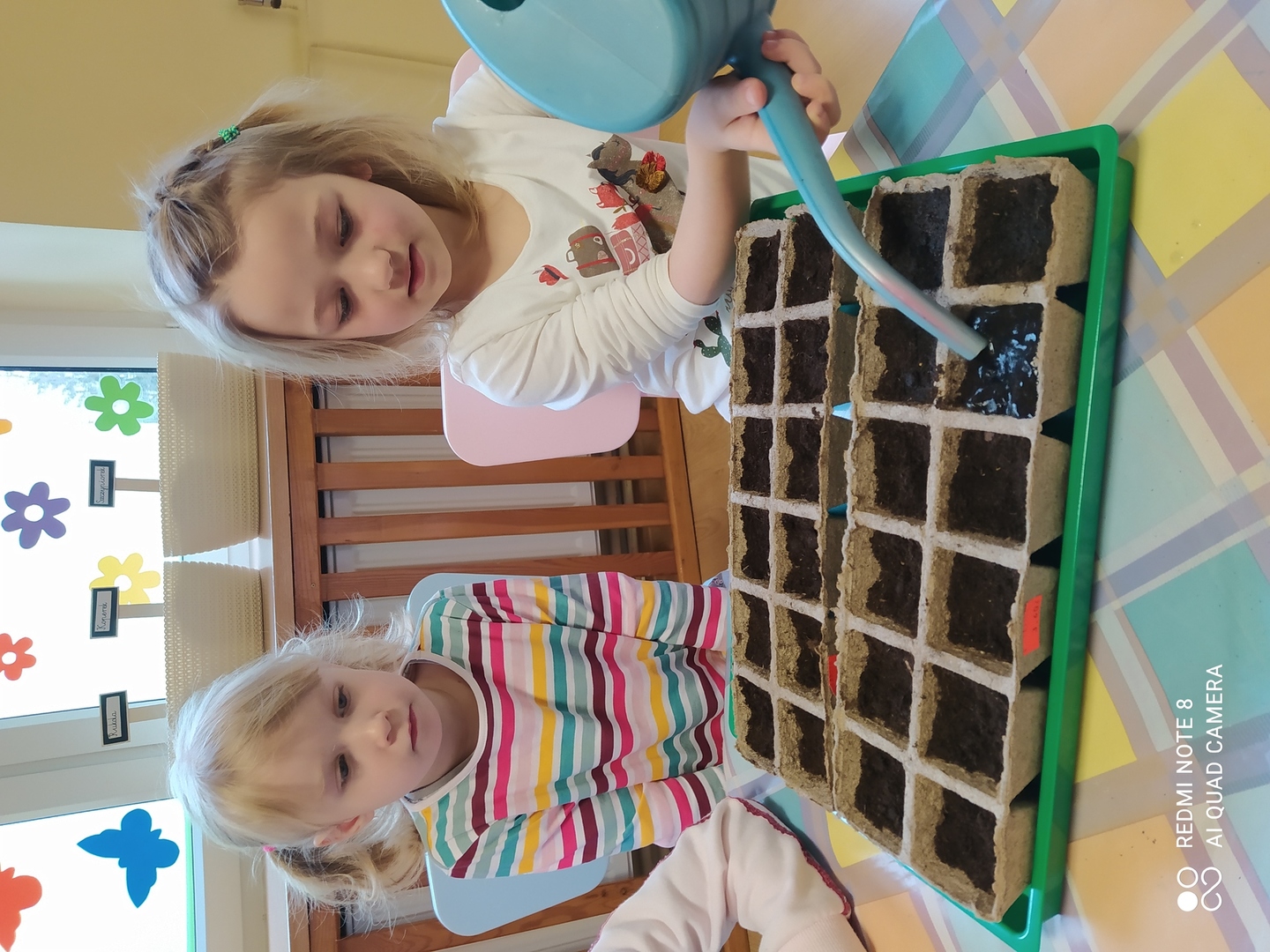 Przedszkolaki z ochotą współpracowały ze sobą podczas napełniania doniczek ziemią, sadzenia cebulek na szczypiorek, wysiewania nasion warzyw i kwiatów oraz podlewania. A po skończonych zajęciach równie chętnie pomagały przy porządkowaniu sali. Brawo Gumisie! Teraz z niecierpliwością będziemy obserwować zmiany zachodzące w naszym kąciku przyrody i czekać na owoce naszej pracy :)