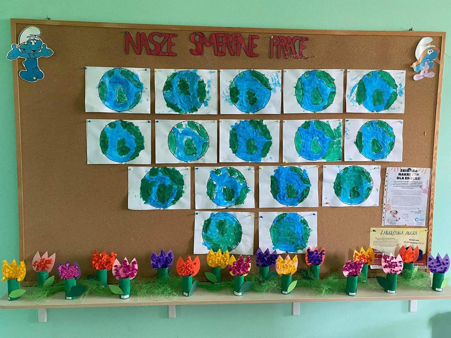 W ramach obchodów Dnia Ziemi grupa Smerfy wyruszyła w multimedialną podróż, gdzie przewodnikiem była planeta Ziemia. Dzięki prezentacji przedszkolaki dowiedziały się, jak wygląda nasz wspólnych dom – Ziemia, a także w jaki sposób należy o niego dbać. Poznały zasady recyklingu oraz najważniejsze postawy ekologiczne. W celu utrwalenia zdobytej wiedzy dzieci przeprowadziły wspólne doświadczenie plastyczne przemieniające waciki kosmetyczne w małą kulę ziemską. Przedszkolaki wzięły również udział w zabawie polegającej na segregowaniu śmieci do odpowiednich pojemników. Natomiast na koniec zajęć wykonały pracę plastyczną przedstawiającą planetę Ziemię. A co jeszcze działo się w minionym tygodniu najlepiej powiedzą zdjęcia 😉.