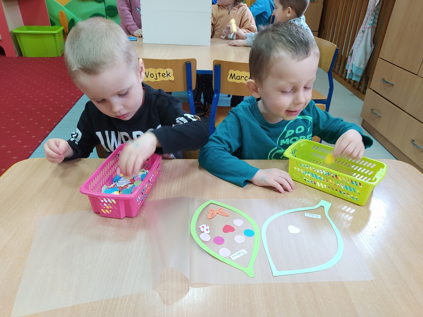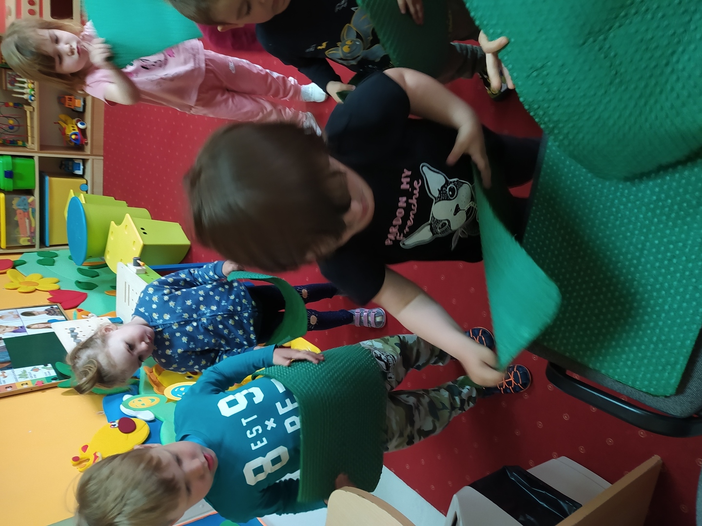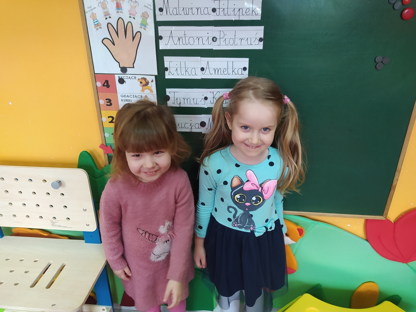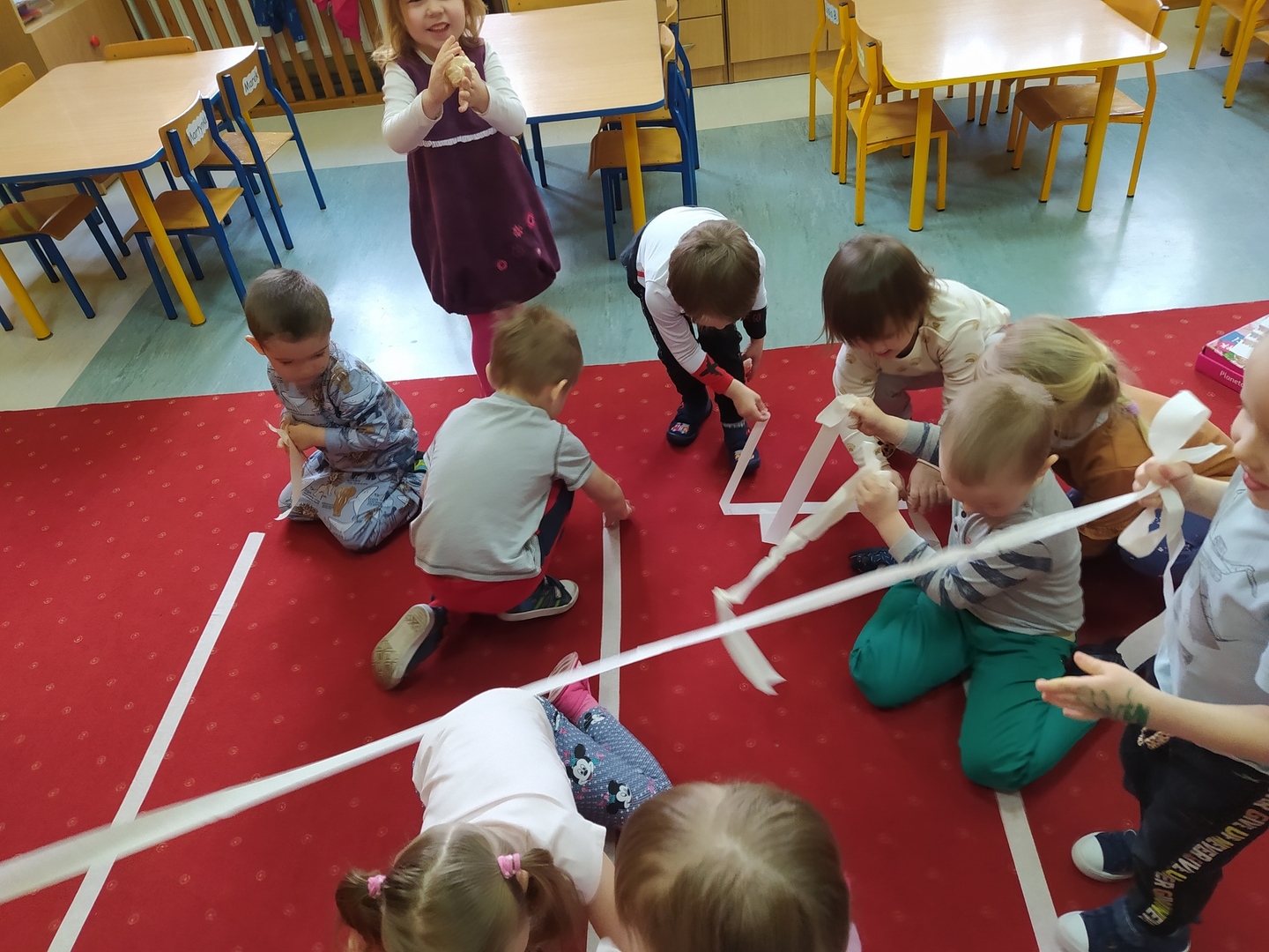 My Smerfiki dzielne, jesteśmy już bardzo samodzielne. 1. Kanapki na śniadanie, sami raz w tygodniu przygotowujemy. 2. Ubrać się i rozebrać to dla nas łatwizna. O ubranka dbać też potrafimy i składać się je uczymy, a gdy ciepło nam doskwiera na wieszaki bluzy i sweterki odwieszamy. 3. Prace swoje do teczek sami też wkładamy, na półeczkach pięknie potem je układamy. Pamiętamy nawet o skrzydełek chowaniu i o tym, by imionko już z daleka na teczce widać było. 4. Po zajęciach podkładkę każdy swoją sprzątnąć pamięta. 5. Gdy z taśmy wzory na dywanie wyklejamy, potem wszyscy razem je odklejamy. Kulki z niej duże i małe formujemy, o porządek w sali dbamy, w koszu je umieścić pamiętamy. 6. Kto w przedszkolu, a kto w domu leniuchuje, co dzień sprawdzamy. Imionka nasze utrwalamy, a i kolegów i koleżanek rozpoznawać już nawet się uczymy. 7. W parach pracować się uczymy, z kolegą i koleżanką zgodnie działać toż to sprawa ważna. 8. Sowy trzy pomocą służą nam i kolorem swym podpowiadają co robić będziemy; z panią bawić się – sowa zielona, z kolegą lub koleżanką tworzyć – sowa żółta, czy sami zadanie wykonywać- sowa czerwona. 9. Aby łatwiej było nam, co dzień pomocnika wybieramy. Dzielny on jest, żadne wyzwania straszne nie są mu. Czy koszyków rozdawanie, czy kart pracy dzieciom wręczanie- uśmiech na twarzy zawsze ma, pomagać wszystkich bardzo chce.