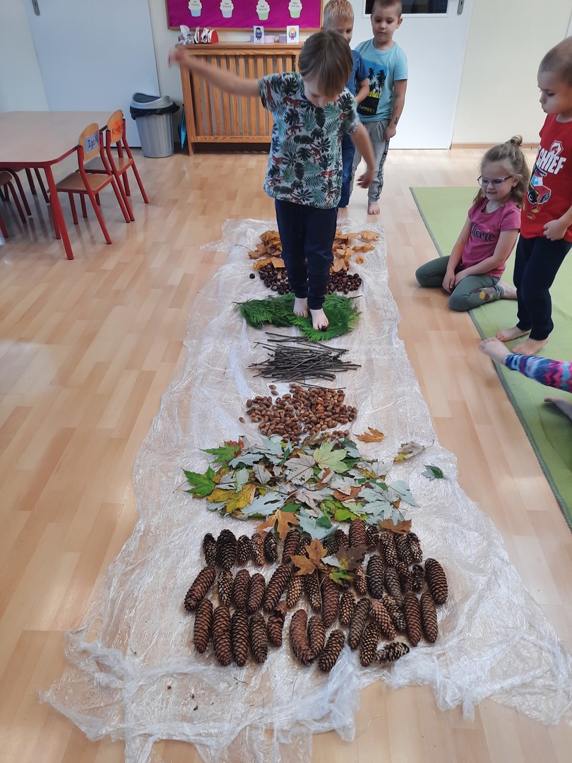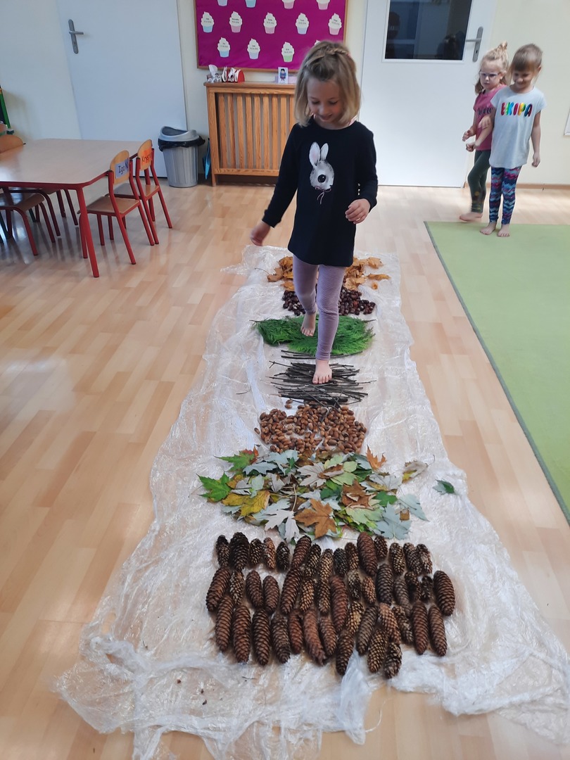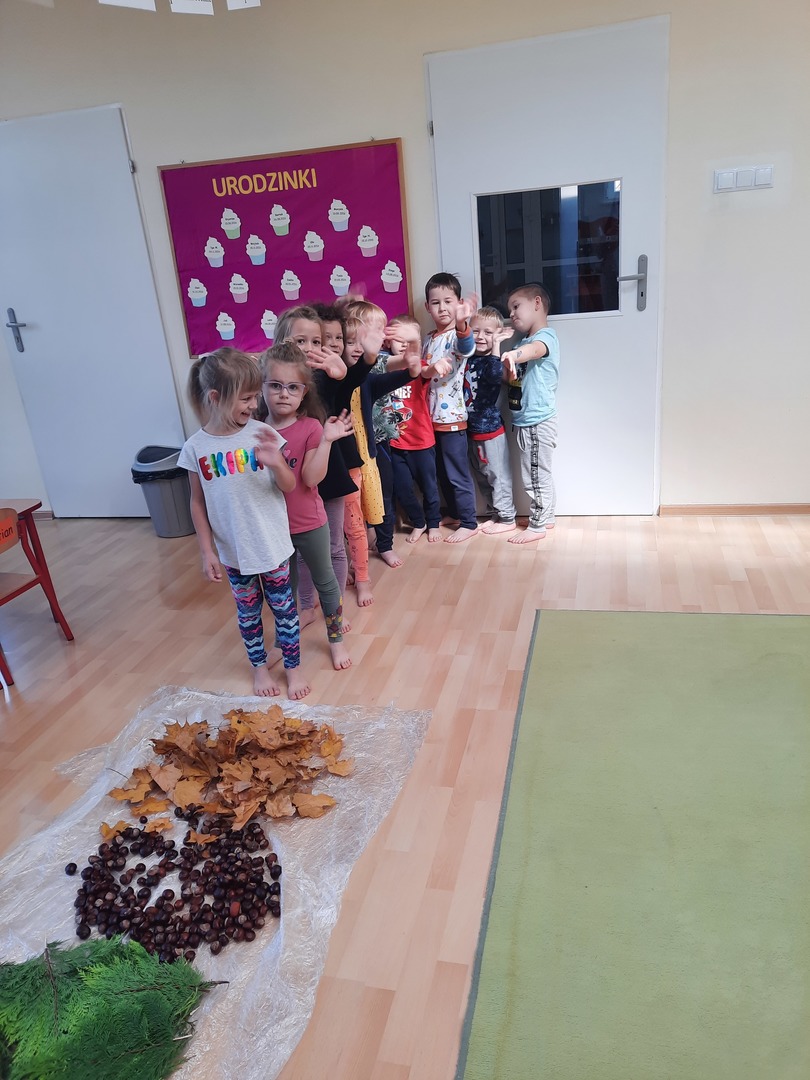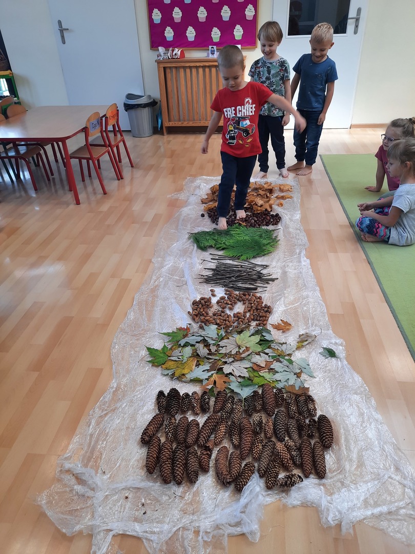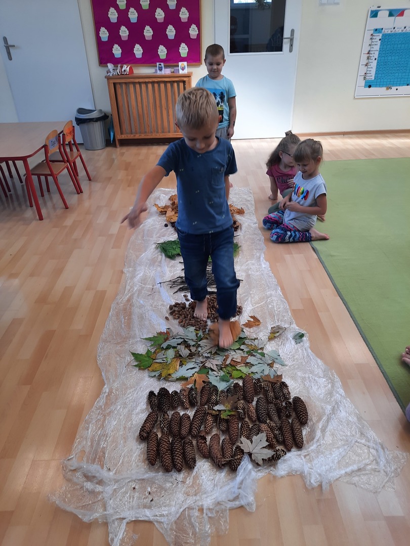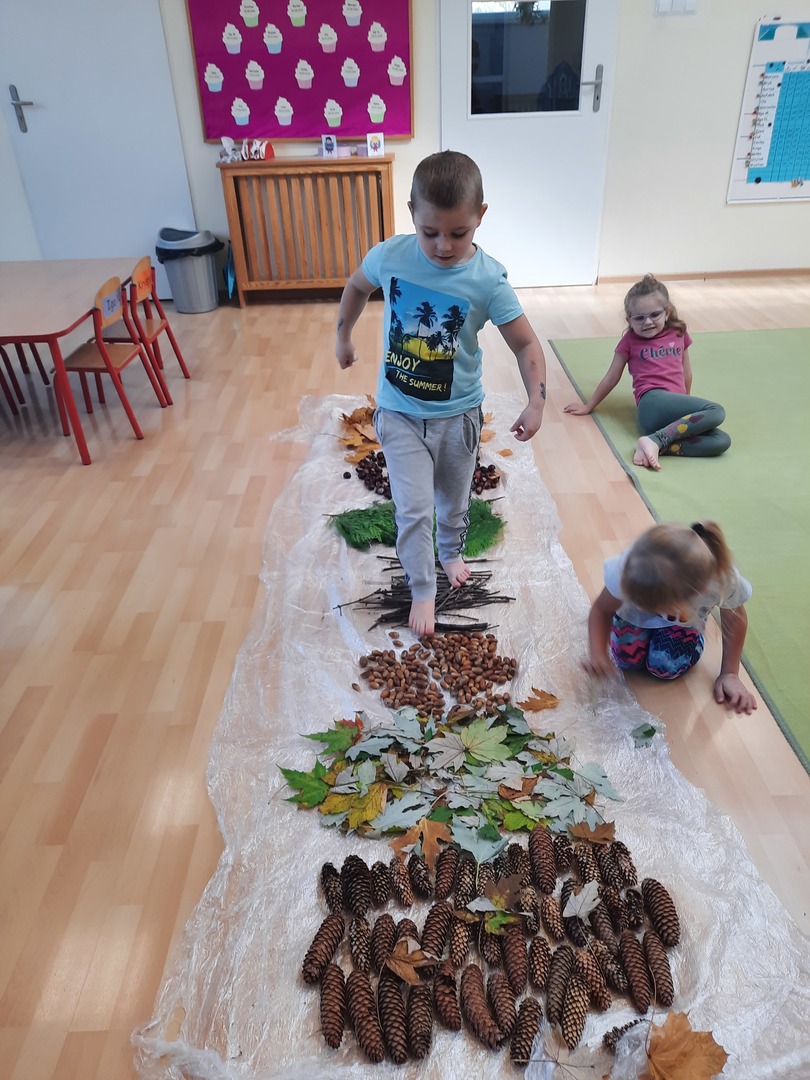 08.10.21. Za oknami Polska złota jesień wiec warto było skorzystać z darów jesieni i umilić czas przedszkolaków. Dla dzieci korzystanie ze ścieżki sensorycznej stanowi zabawę, a jednocześnie jest to sposób na poprawę motoryki dużej, rozwój wyobraźni dotykowej oraz poprawę równowagi i koordynacji ruchowej i stymulację receptorów nerwowych w stopach. Zabawa była wspaniała!