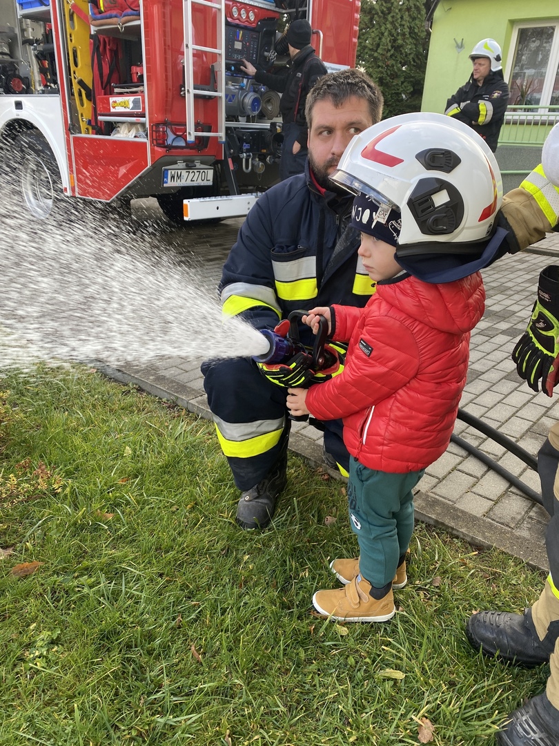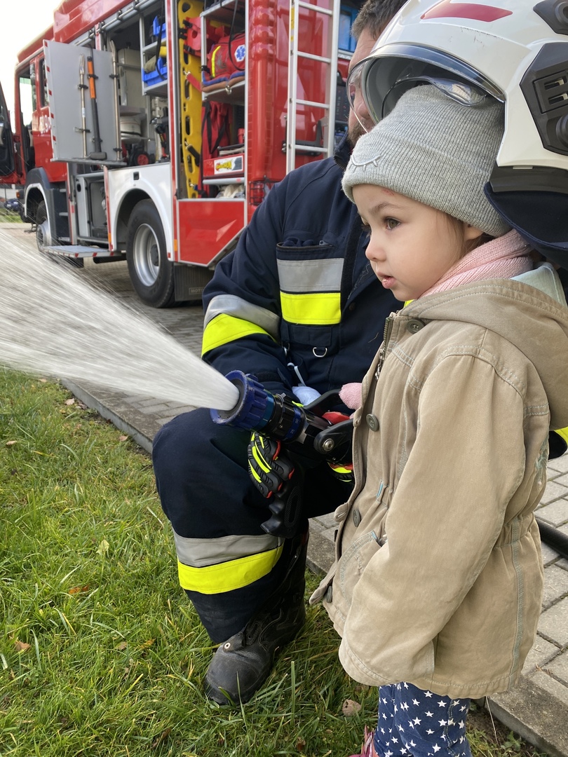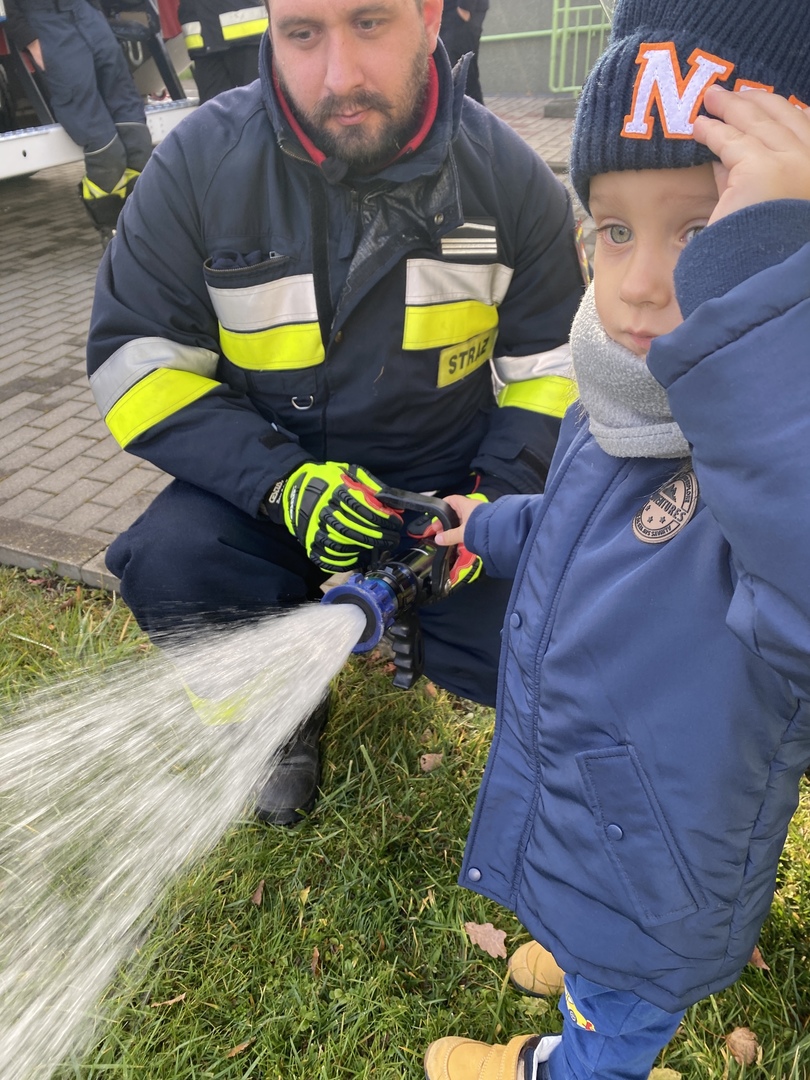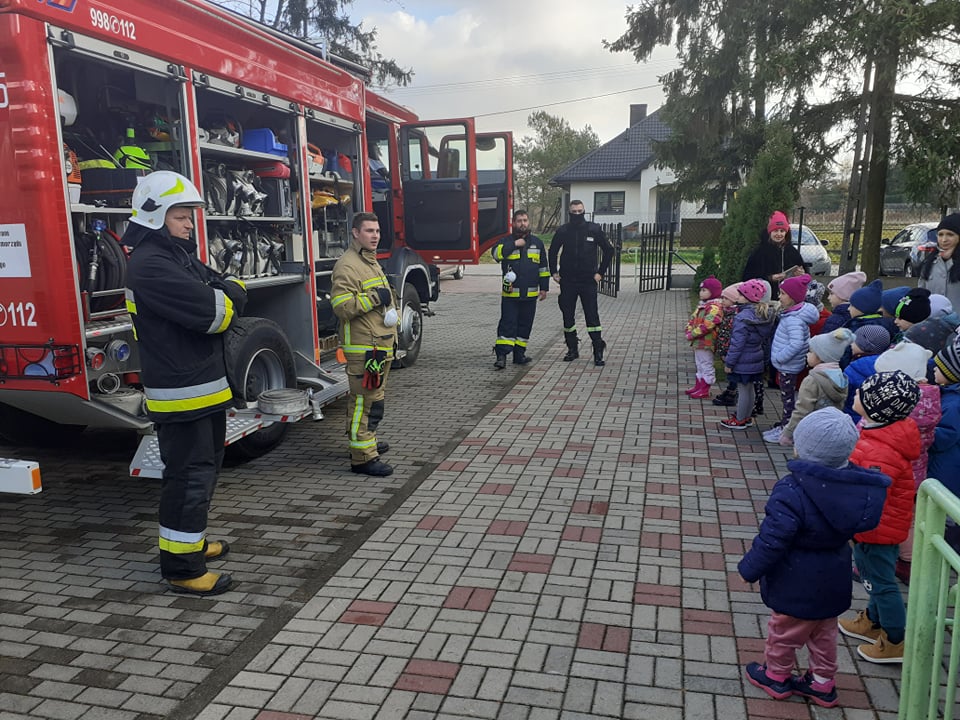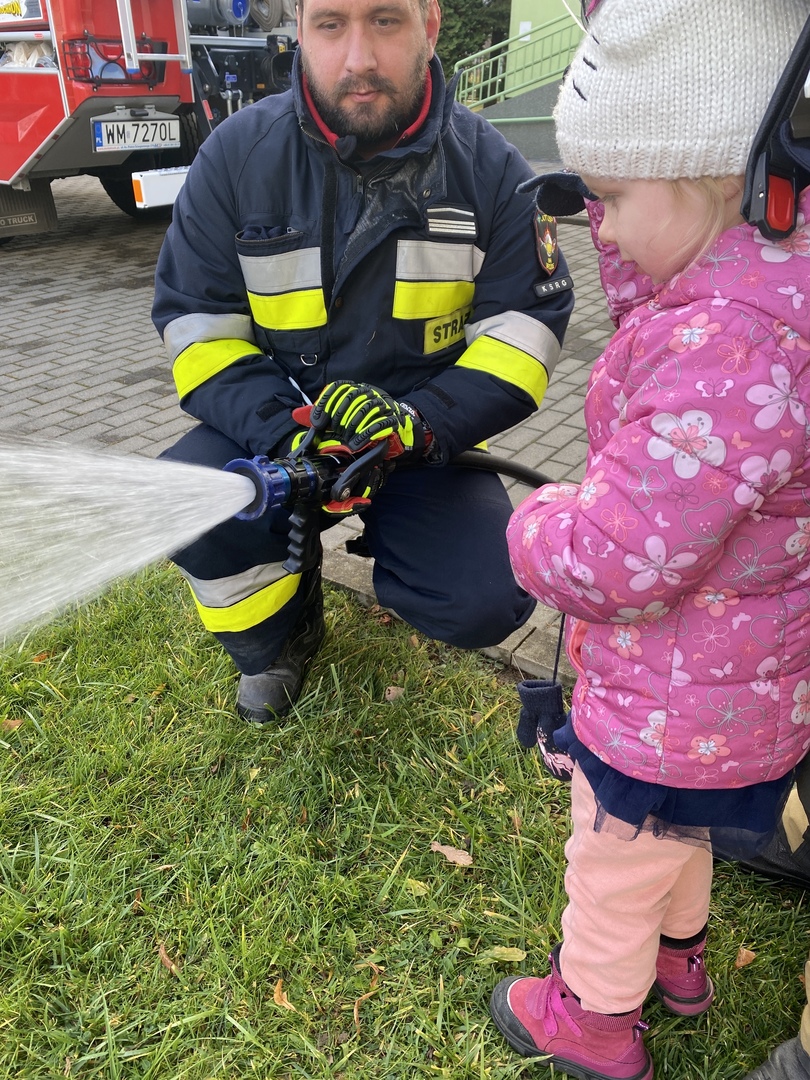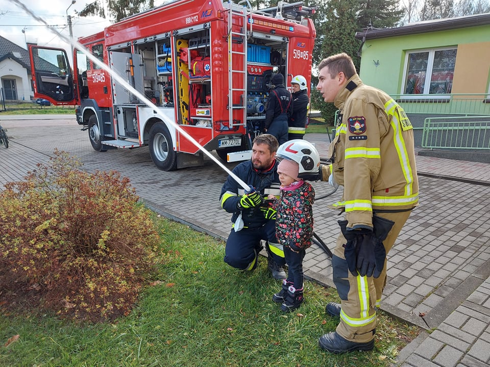 9 listopada odwiedzili nas strażacy z Ochotniczej Straży Pożarnej w Brzózem. Podczas spotkania panowie zaprezentowali dzieciom tajniki zawodu strażaka, a także poruszyli tematy związane z bezpieczeństwem. Opowiadali o tym, jak należy się zachować w razie wypadku oraz przypomnieli numery alarmowe. Największe zainteresowanie dzieci wzbudził wielki, czerwony wóz strażacki, do którego każdy przedszkolak mógł wejść. Dzieci miały możliwość podziwiać wyposażenie, jakim strażacy dysponują podczas swojej ciężkiej i odpowiedzialnej pracy, a chętni spróbowali nawet swoich sił asystując przy pokazie działania prądownicy wodnej.
