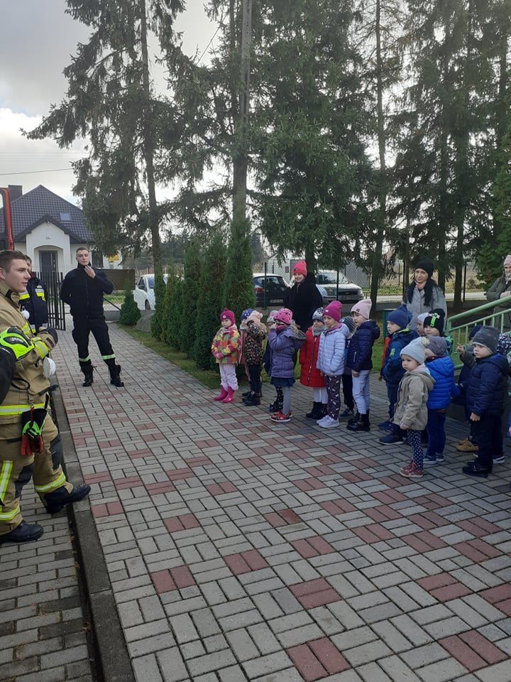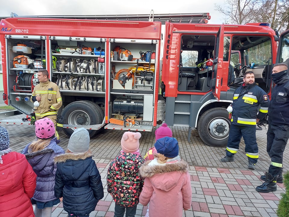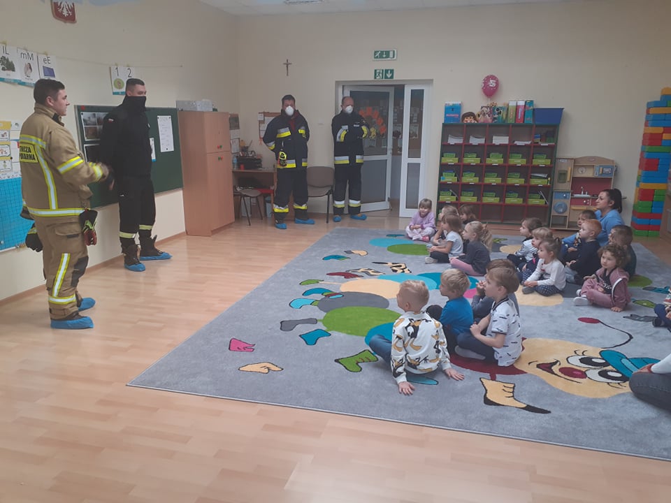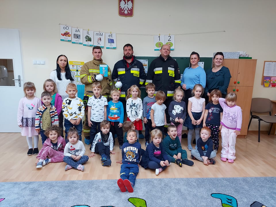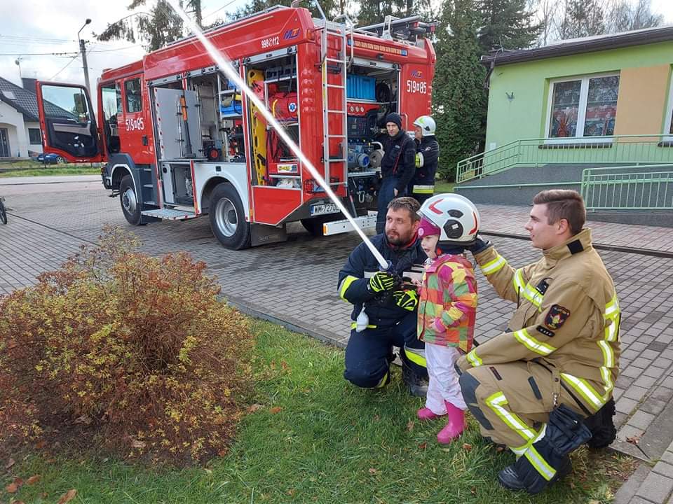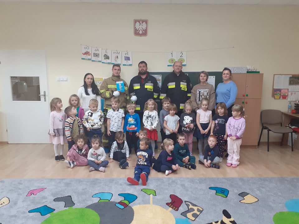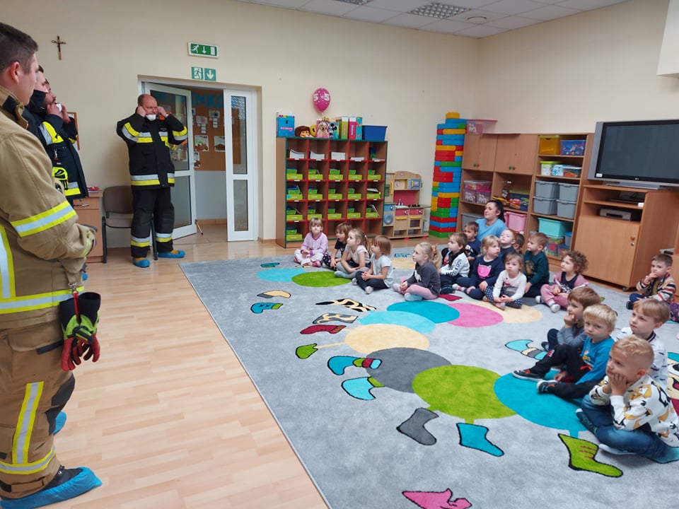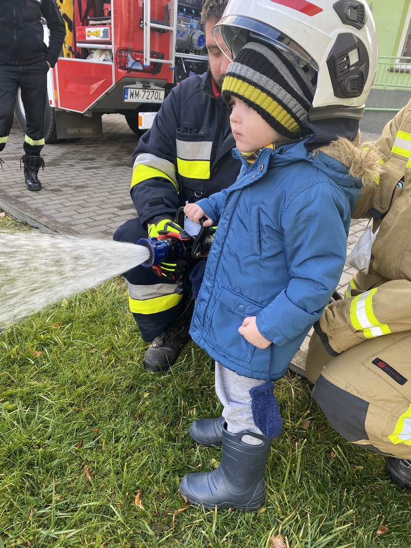 9 listopada odwiedzili nas strażacy z Ochotniczej Straży Pożarnej w Brzózem. Podczas spotkania panowie zaprezentowali dzieciom tajniki zawodu strażaka, a także poruszyli tematy związane z bezpieczeństwem. Opowiadali o tym, jak należy się zachować w razie wypadku oraz przypomnieli numery alarmowe. Największe zainteresowanie dzieci wzbudził wielki, czerwony wóz strażacki, do którego każdy przedszkolak mógł wejść. Dzieci miały możliwość podziwiać wyposażenie, jakim strażacy dysponują podczas swojej ciężkiej i odpowiedzialnej pracy, a chętni spróbowali nawet swoich sił asystując przy pokazie działania prądownicy wodnej.