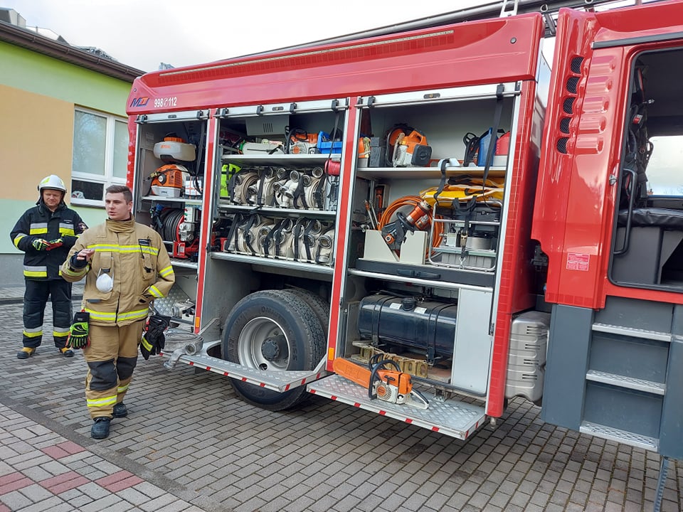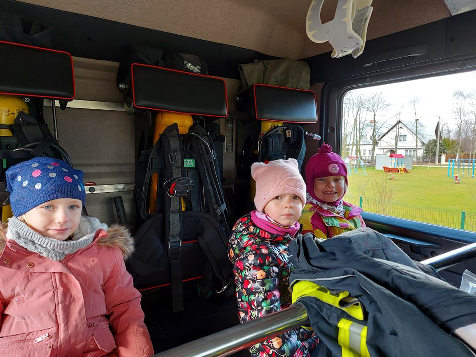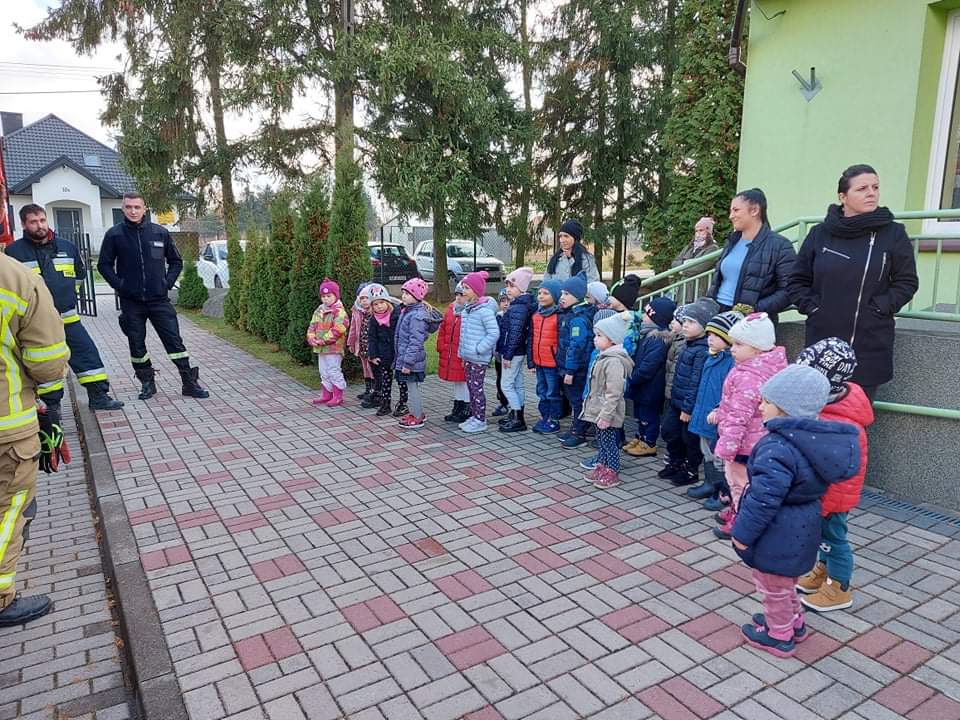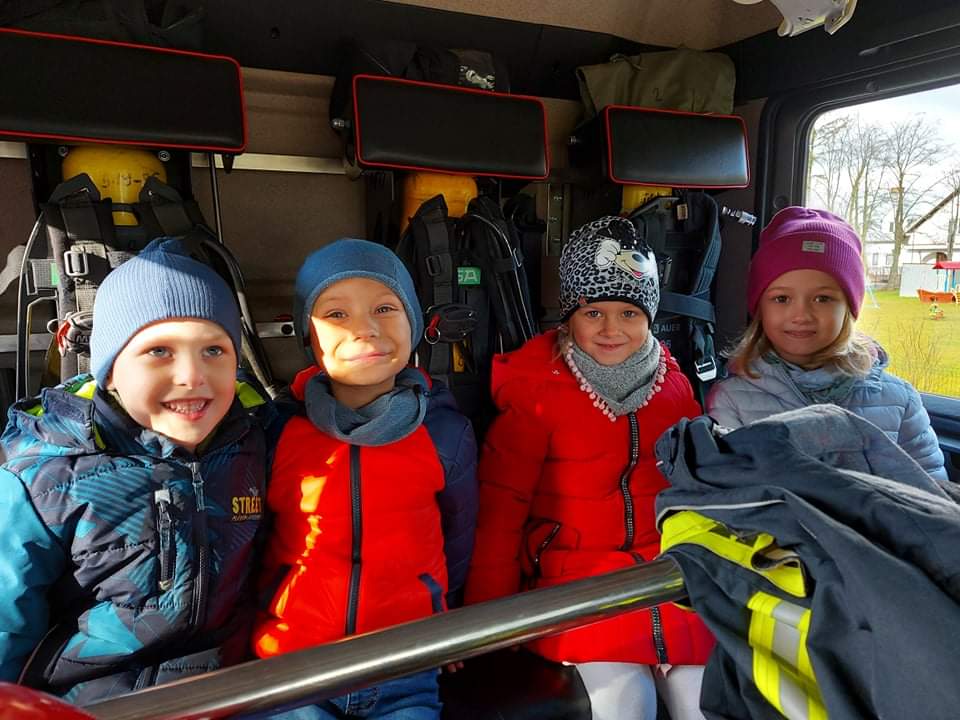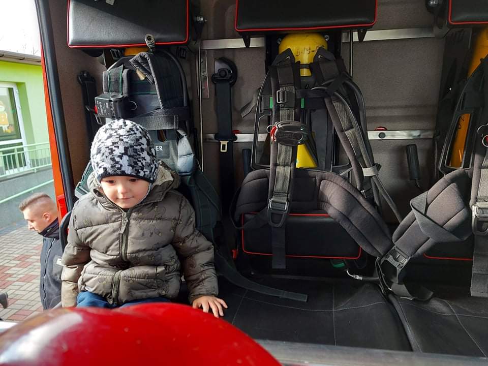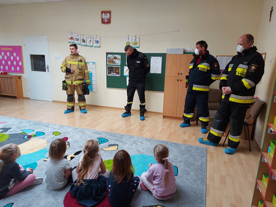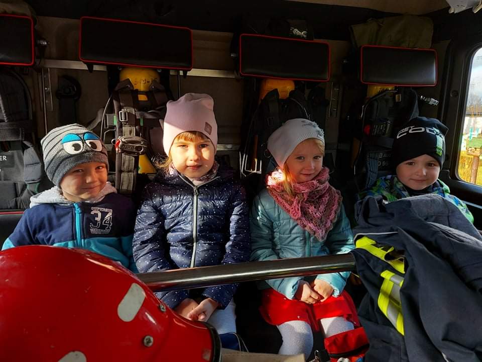 9 listopada odwiedzili nas strażacy z Ochotniczej Straży Pożarnej w Brzózem. Podczas spotkania panowie zaprezentowali dzieciom tajniki zawodu strażaka, a także poruszyli tematy związane z bezpieczeństwem. Opowiadali o tym, jak należy się zachować w razie wypadku oraz przypomnieli numery alarmowe. Największe zainteresowanie dzieci wzbudził wielki, czerwony wóz strażacki, do którego każdy przedszkolak mógł wejść. Dzieci miały możliwość podziwiać wyposażenie, jakim strażacy dysponują podczas swojej ciężkiej i odpowiedzialnej pracy, a chętni spróbowali nawet swoich sił asystując przy pokazie działania prądownicy wodnej.