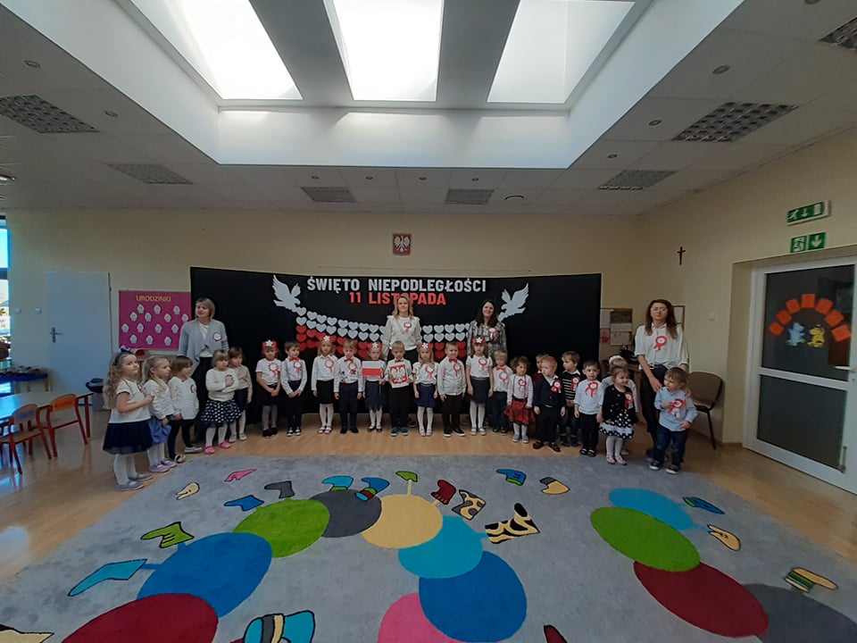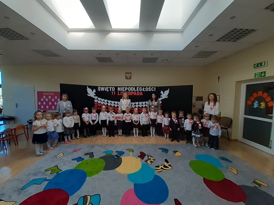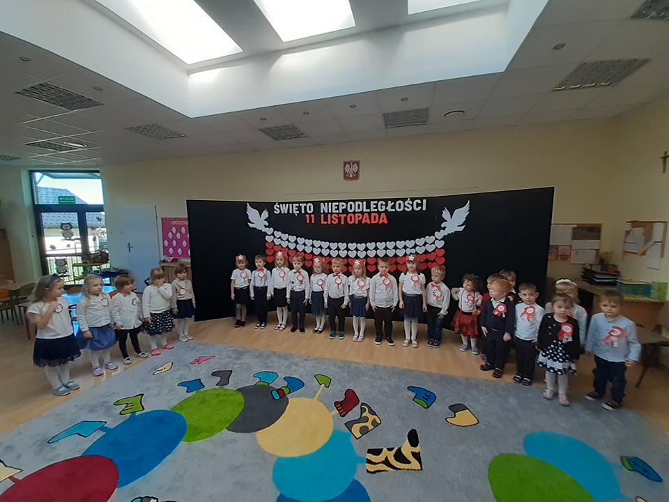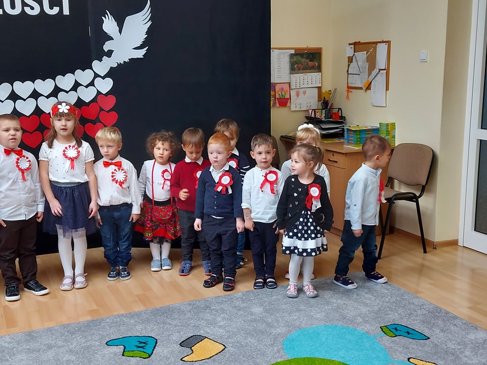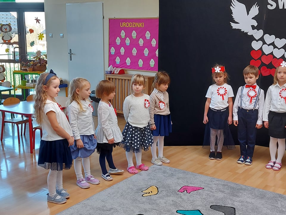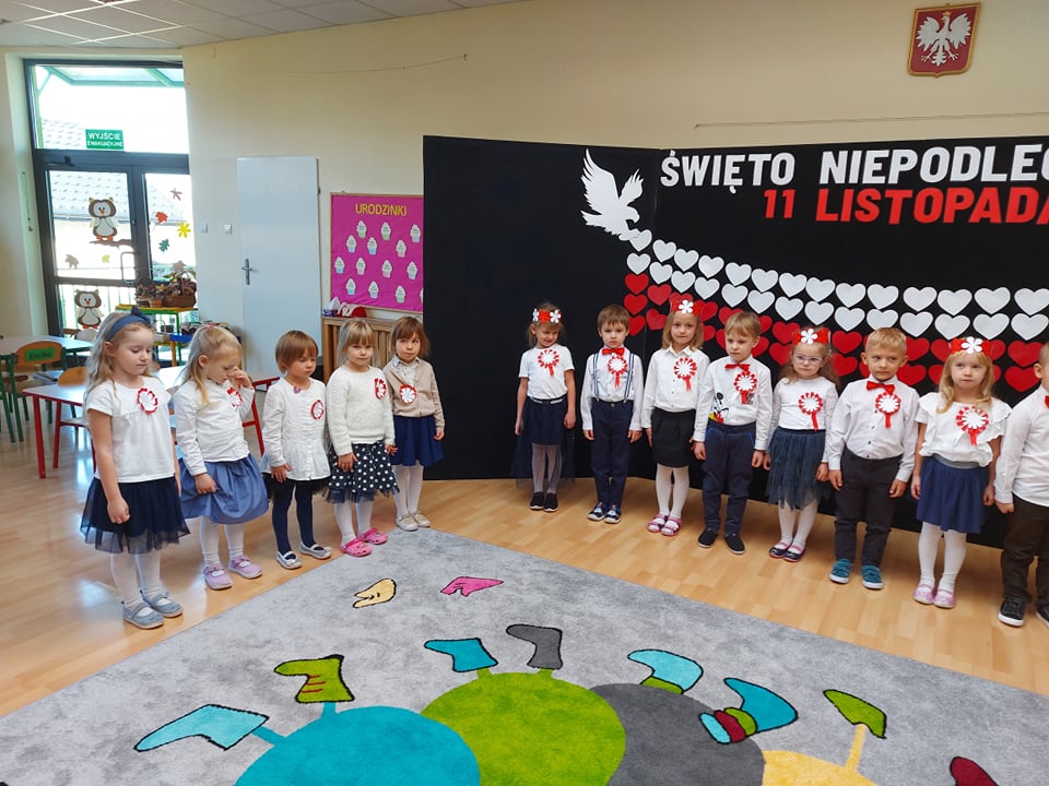 10.11.21. W przeddzień Narodowego Święta Niepodległości społeczność "Akwarelki" obchodziła 103 rocznicę tego historycznego wydarzenia. Najstarsza grupa "Muminki" zaprezentowała młodszym przedszkolakom program artystyczny, który był dla wszystkich cenną lekcją patriotyzmu i przywiązania do Ojczyzny. O tym, że jest to bardzo ważne dla nas Polaków święto, świadczyła specjalnie przygotowana dekoracja, a także piękne, galowe stroje przedszkolaków. Dzieci recytowały wiersze o symbolach narodowych i śpiewały o tym, jak piękny jest nasz niepodległy kraj. Następnie, zgodnie z założeniami ministerialnej akcji "Szkoła do hymnu", wszyscy uroczyście i z powagą o symbolicznej godzinie 11.11 odśpiewali "Mazurka Dąbrowskiego". Przedszkolaki, poprzez uczestnictwo w takich wydarzeniach, kształtują swoją tożsamość narodową oraz postawę patriotyczną i przywiązanie do tradycji.