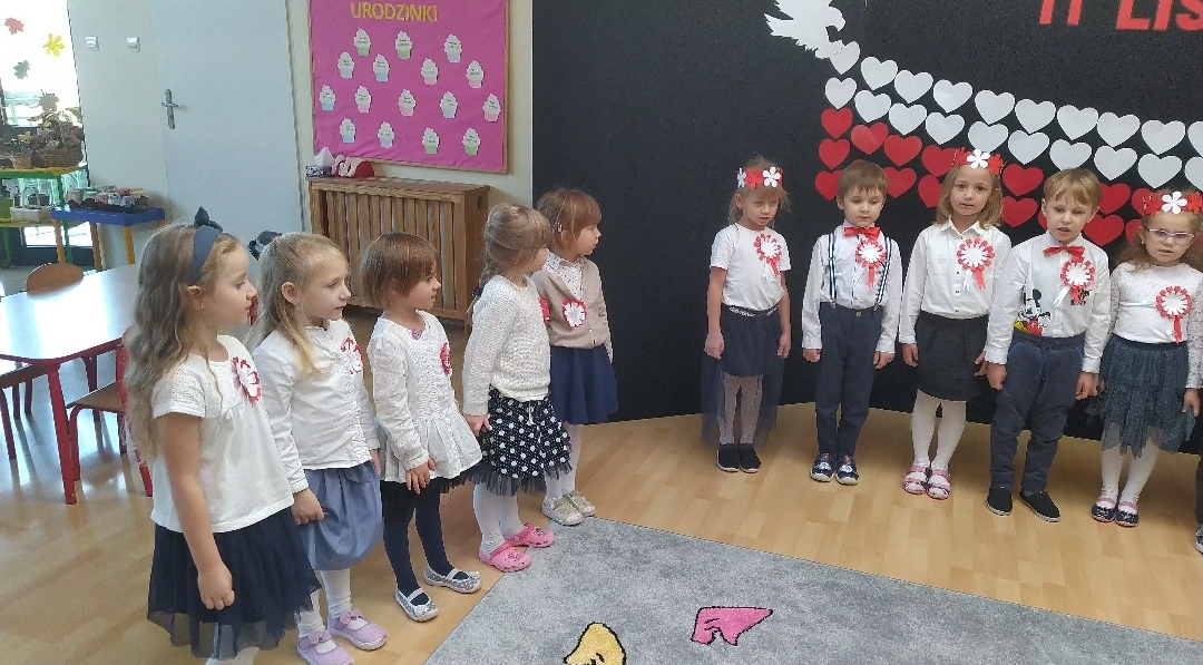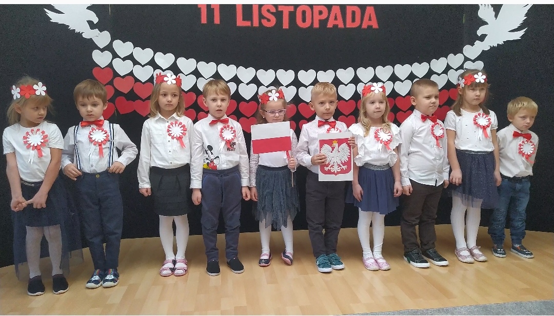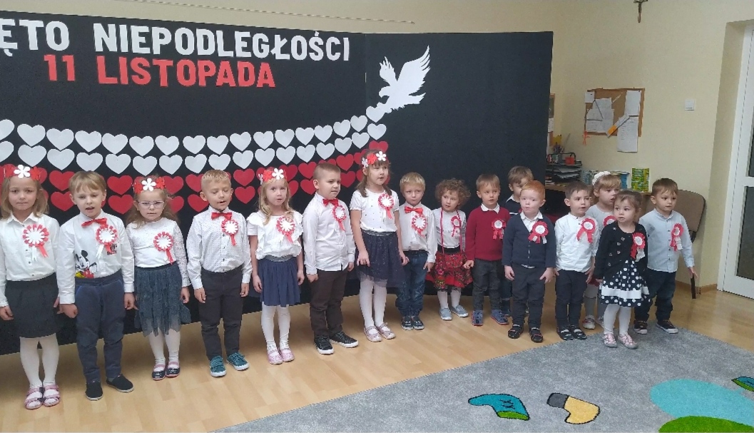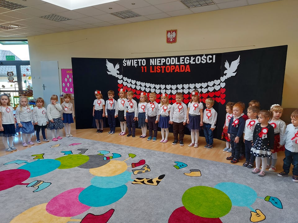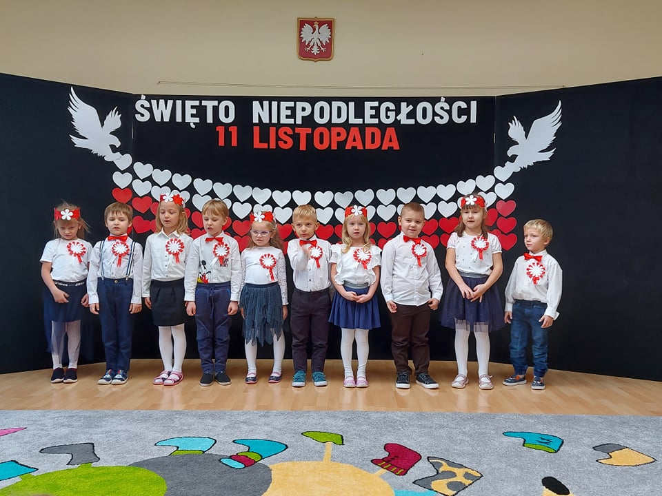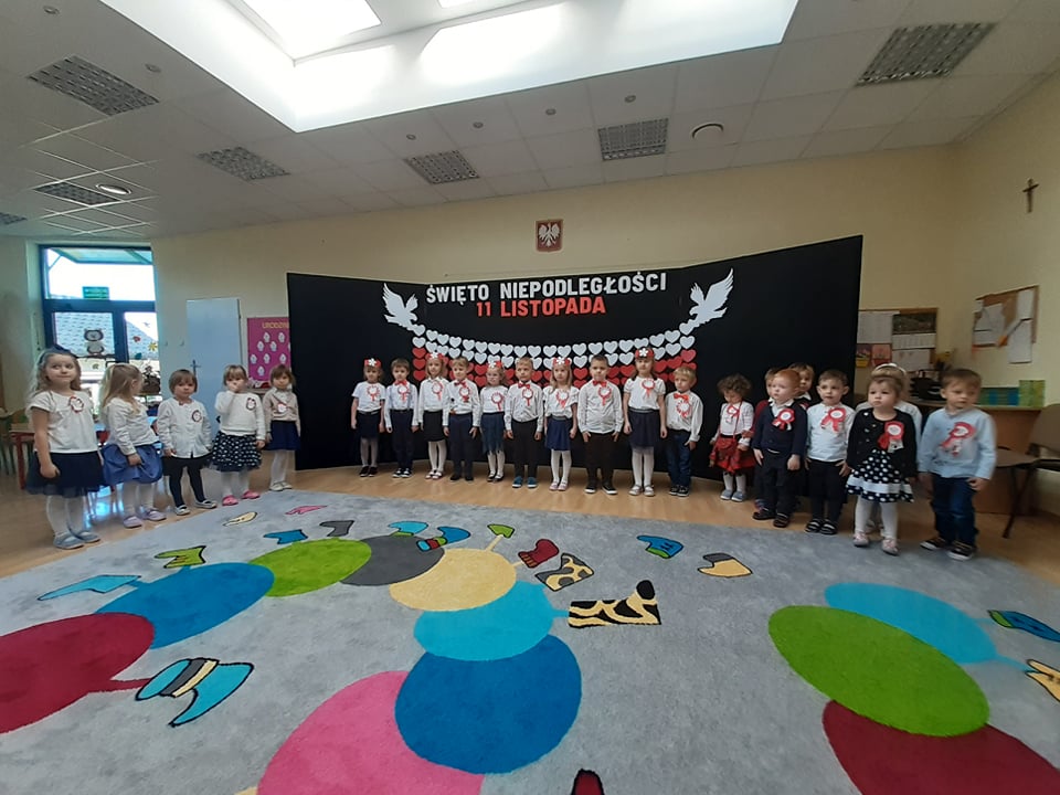 10.11.21. W przeddzień Narodowego Święta Niepodległości społeczność "Akwarelki" obchodziła 103 rocznicę tego historycznego wydarzenia. Najstarsza grupa "Muminki" zaprezentowała młodszym przedszkolakom program artystyczny, który był dla wszystkich cenną lekcją patriotyzmu i przywiązania do Ojczyzny. O tym, że jest to bardzo ważne dla nas Polaków święto, świadczyła specjalnie przygotowana dekoracja, a także piękne, galowe stroje przedszkolaków. Dzieci recytowały wiersze o symbolach narodowych i śpiewały o tym, jak piękny jest nasz niepodległy kraj. Następnie, zgodnie z założeniami ministerialnej akcji "Szkoła do hymnu", wszyscy uroczyście i z powagą o symbolicznej godzinie 11.11 odśpiewali "Mazurka Dąbrowskiego". Przedszkolaki, poprzez uczestnictwo w takich wydarzeniach, kształtują swoją tożsamość narodową oraz postawę patriotyczną i przywiązanie do tradycji.