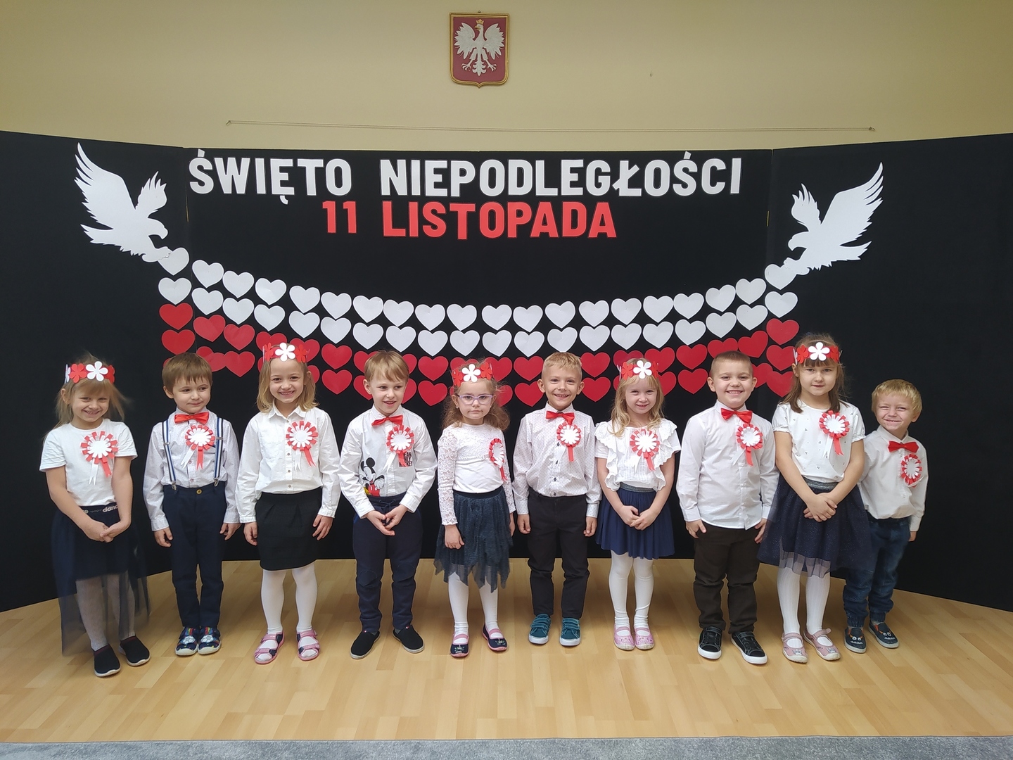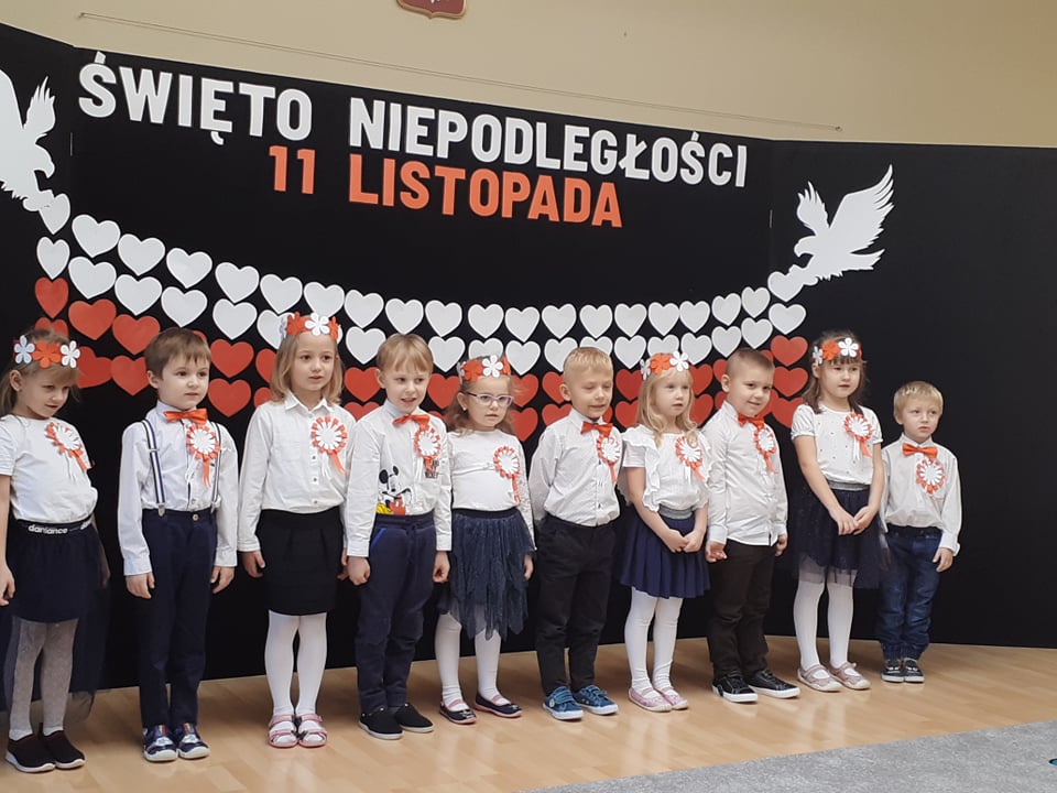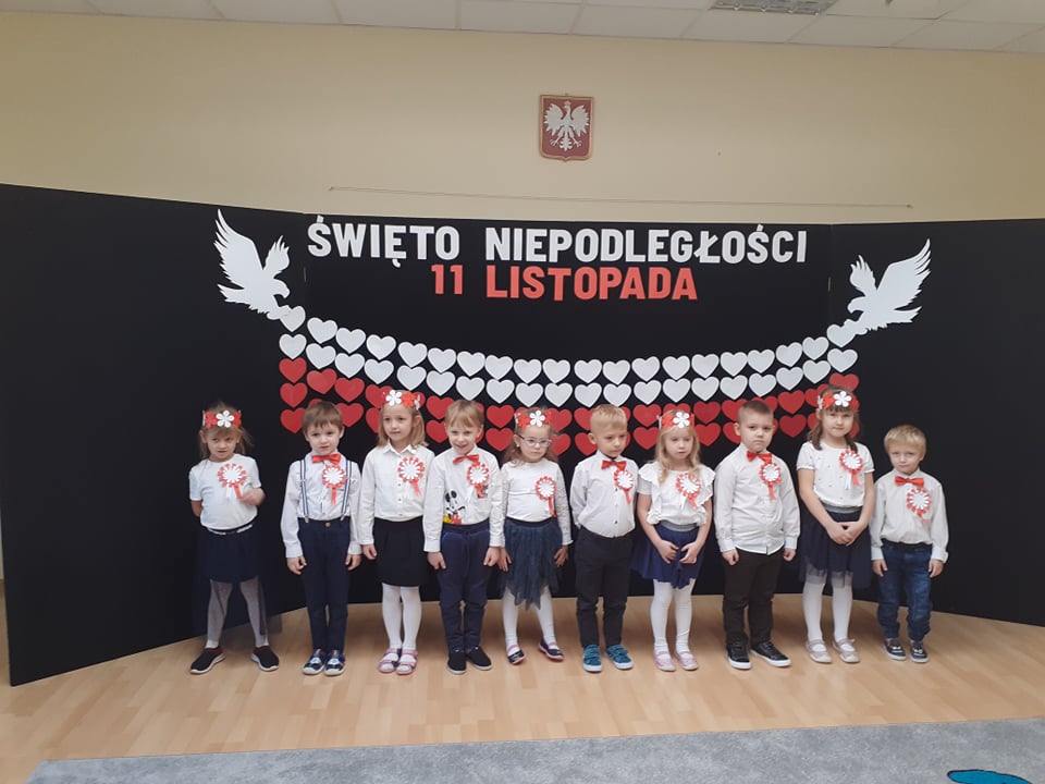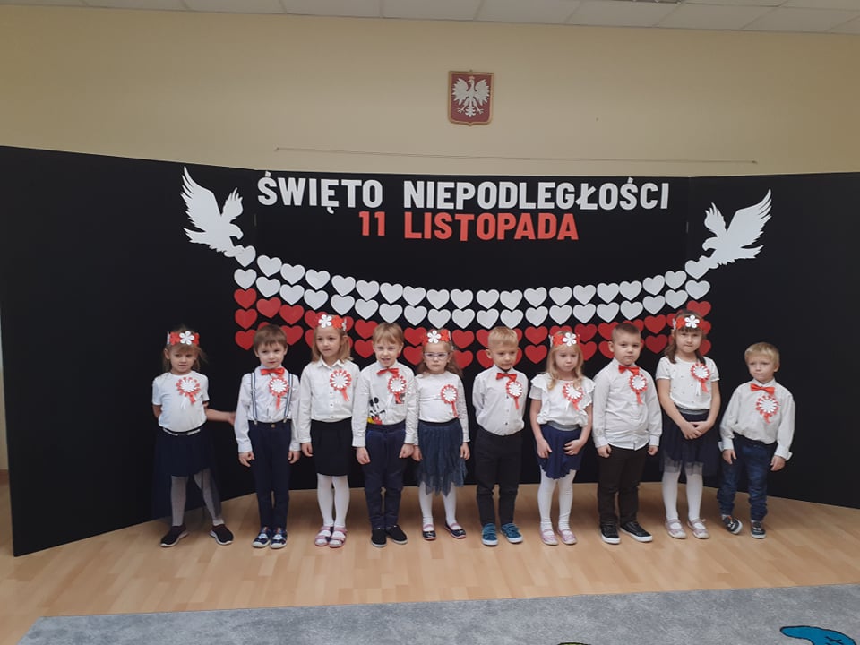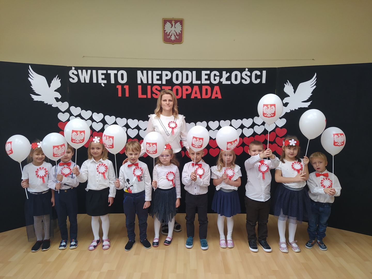 10.11.21. W przeddzień Narodowego Święta Niepodległości społeczność "Akwarelki" obchodziła 103 rocznicę tego historycznego wydarzenia. Najstarsza grupa "Muminki" zaprezentowała młodszym przedszkolakom program artystyczny, który był dla wszystkich cenną lekcją patriotyzmu i przywiązania do Ojczyzny. O tym, że jest to bardzo ważne dla nas Polaków święto, świadczyła specjalnie przygotowana dekoracja, a także piękne, galowe stroje przedszkolaków. Dzieci recytowały wiersze o symbolach narodowych i śpiewały o tym, jak piękny jest nasz niepodległy kraj. Następnie, zgodnie z założeniami ministerialnej akcji "Szkoła do hymnu", wszyscy uroczyście i z powagą o symbolicznej godzinie 11.11 odśpiewali "Mazurka Dąbrowskiego". Przedszkolaki, poprzez uczestnictwo w takich wydarzeniach, kształtują swoją tożsamość narodową oraz postawę patriotyczną i przywiązanie do tradycji.