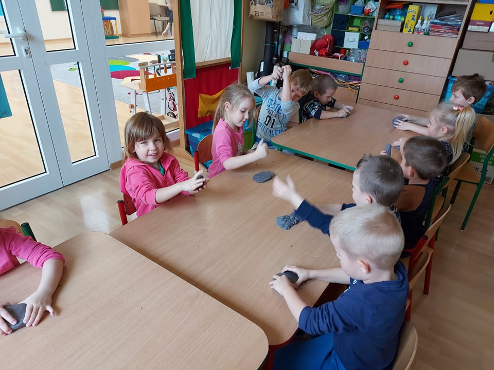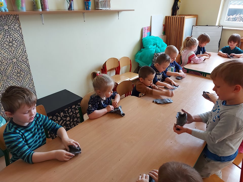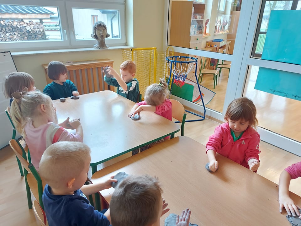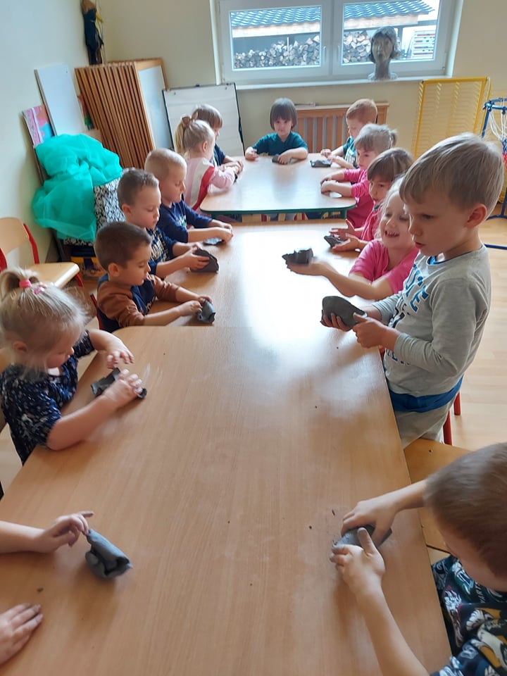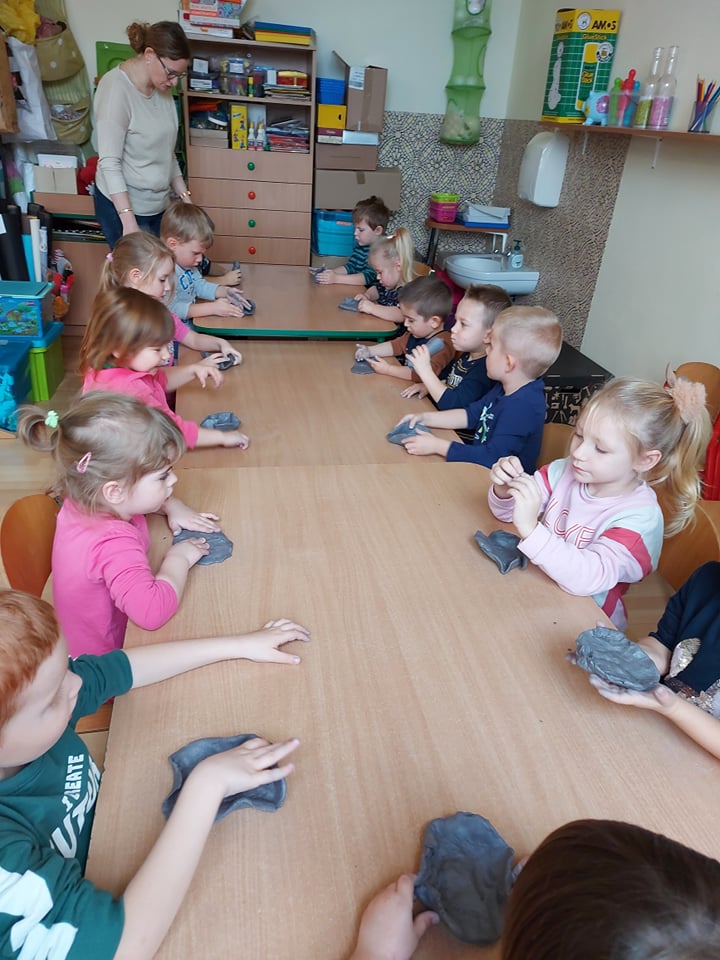 W tym tygodniu rozmawiamy o szeroko pojętej sztuce. Dziś poznaliśmy pracę rzeźbiarza. Byliśmy w pracowni rzeźbiarskiej (sali plastycznej) gdzie lepiliśmy miseczki z gliny samoutwardzalnej. Najbardziej dzieciom podobało się mocne rzucanie gliną o stół (po prostu walenie gliną), bo przecież każdy rzeźbiarz wie, że w glinie nie może być powietrza bo popęka (naprawdę).