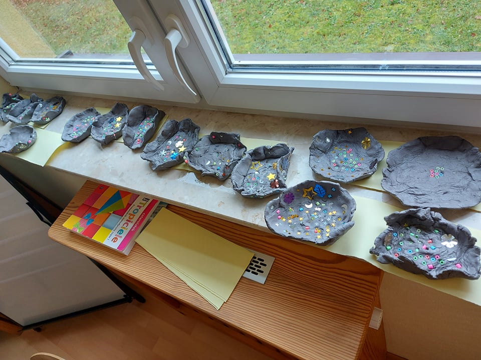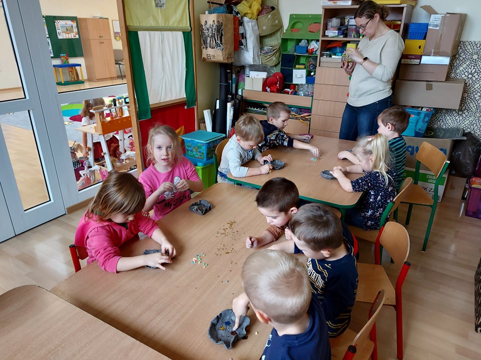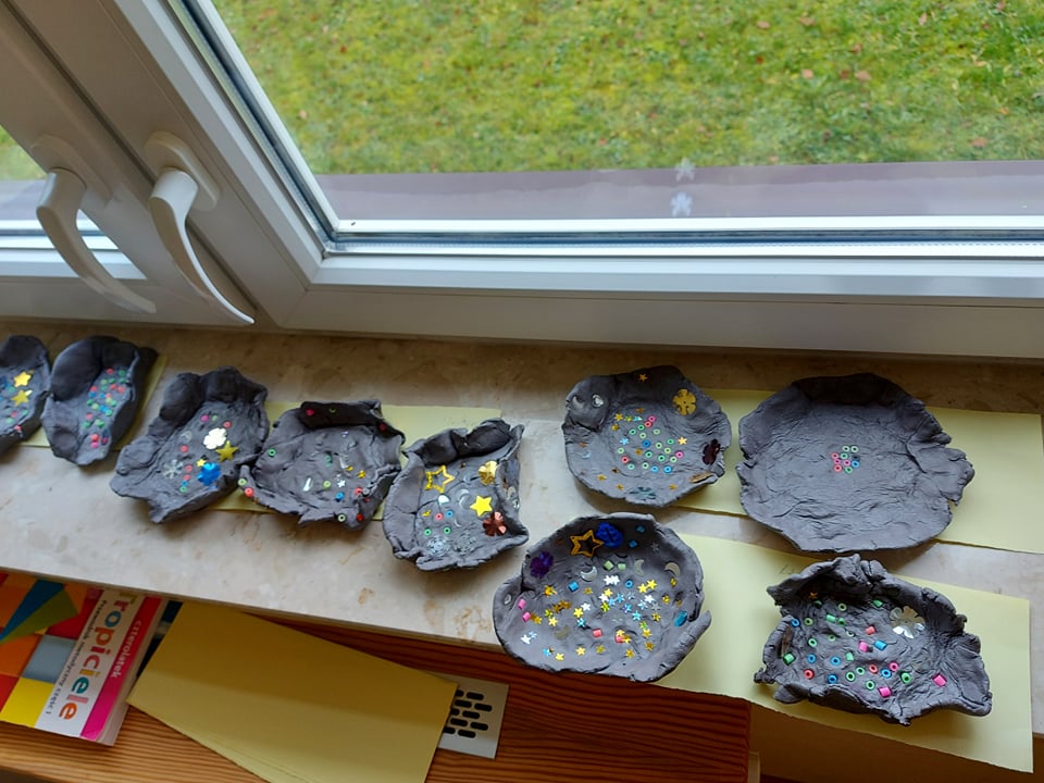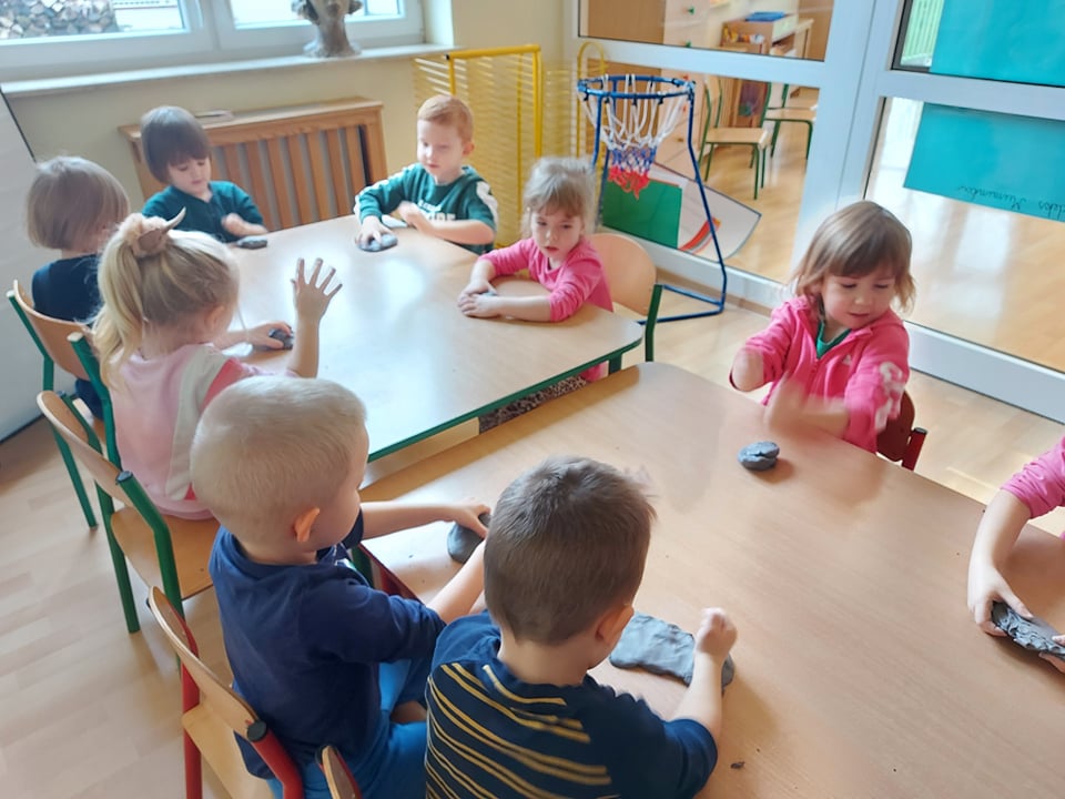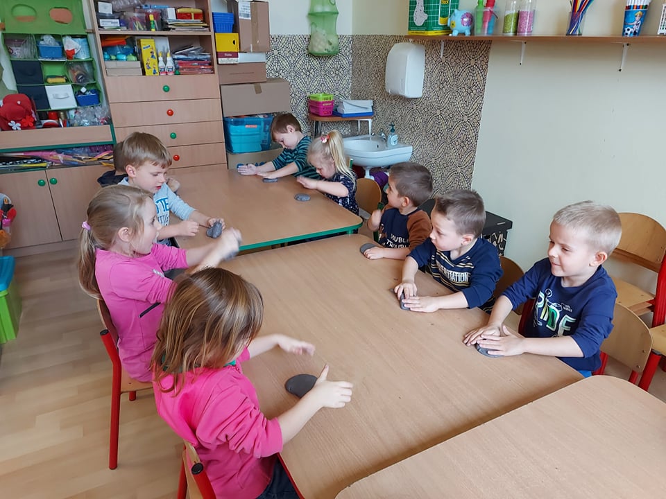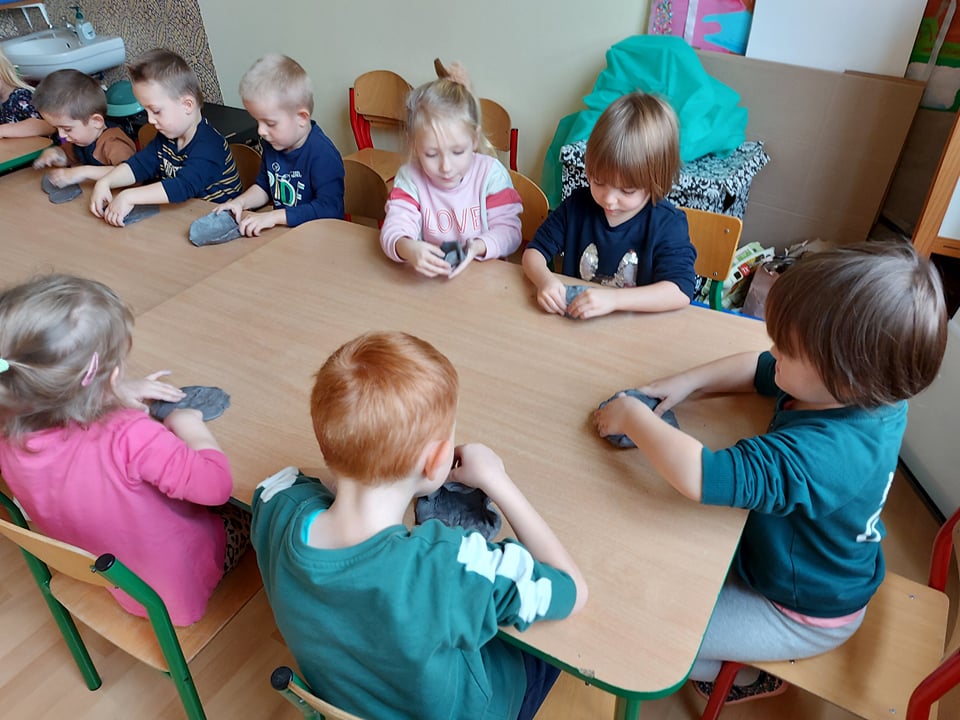 W tym tygodniu rozmawiamy o szeroko pojętej sztuce. Dziś poznaliśmy pracę rzeźbiarza. Byliśmy w pracowni rzeźbiarskiej (sali plastycznej) gdzie lepiliśmy miseczki z gliny samoutwardzalnej. Najbardziej dzieciom podobało się mocne rzucanie gliną o stół (po prostu walenie gliną), bo przecież każdy rzeźbiarz wie, że w glinie nie może być powietrza bo popęka (naprawdę).