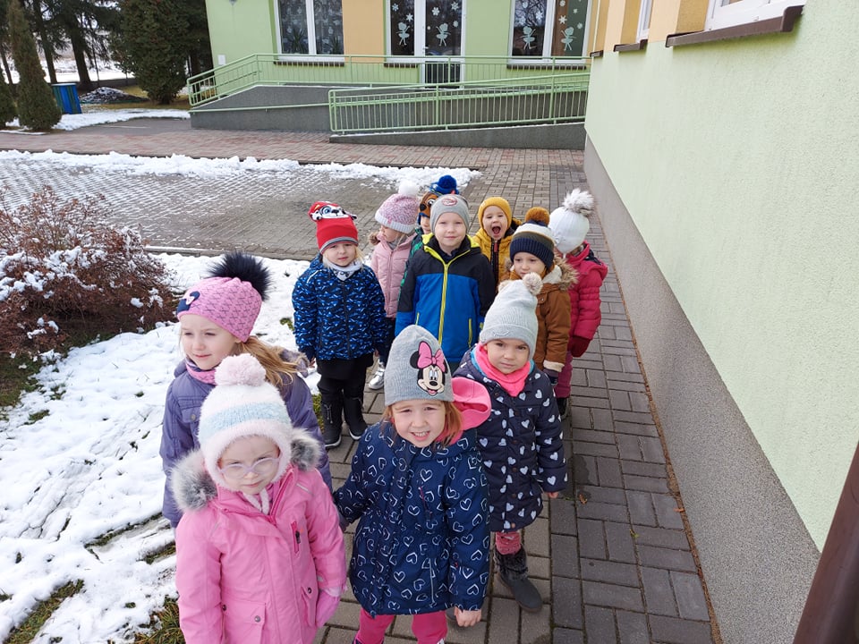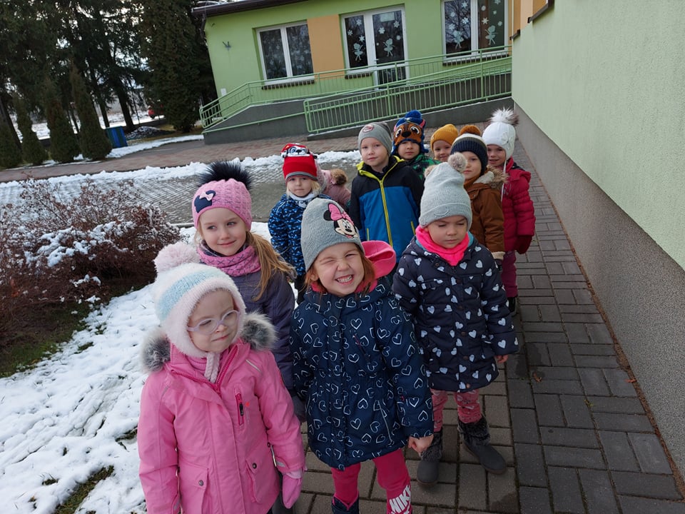 Dzieci z grupy "Gumisie" idą na plac zabaw.