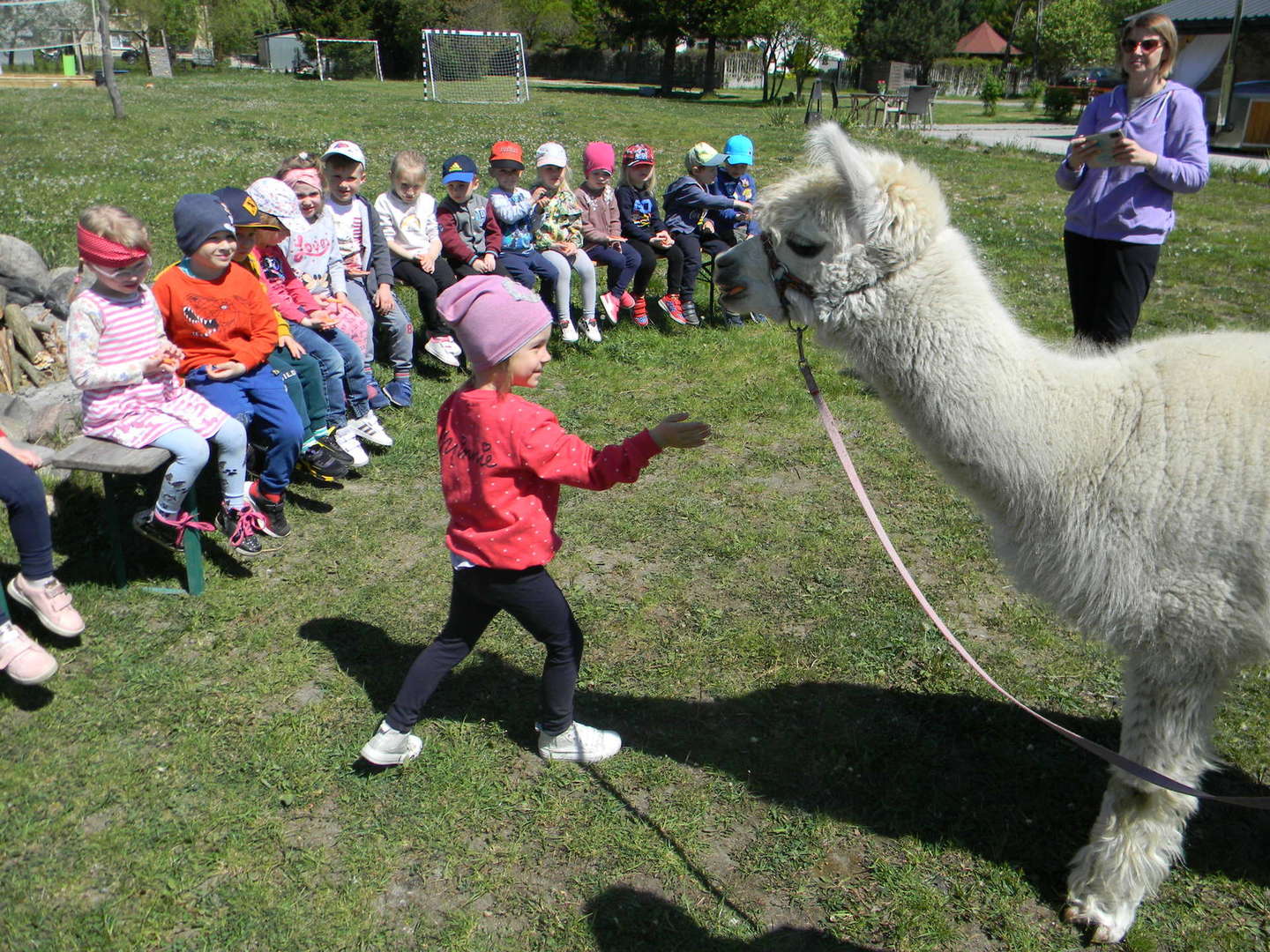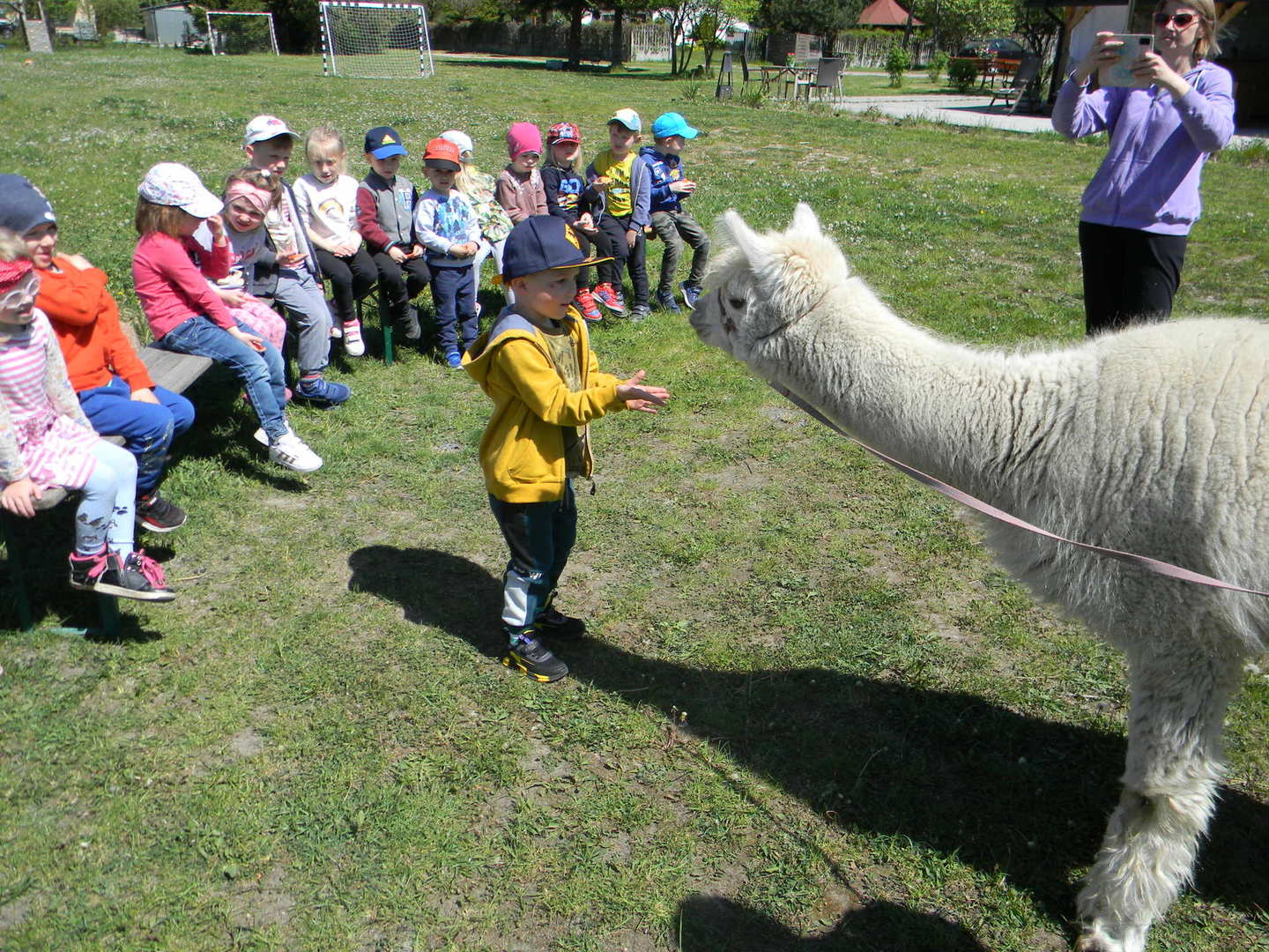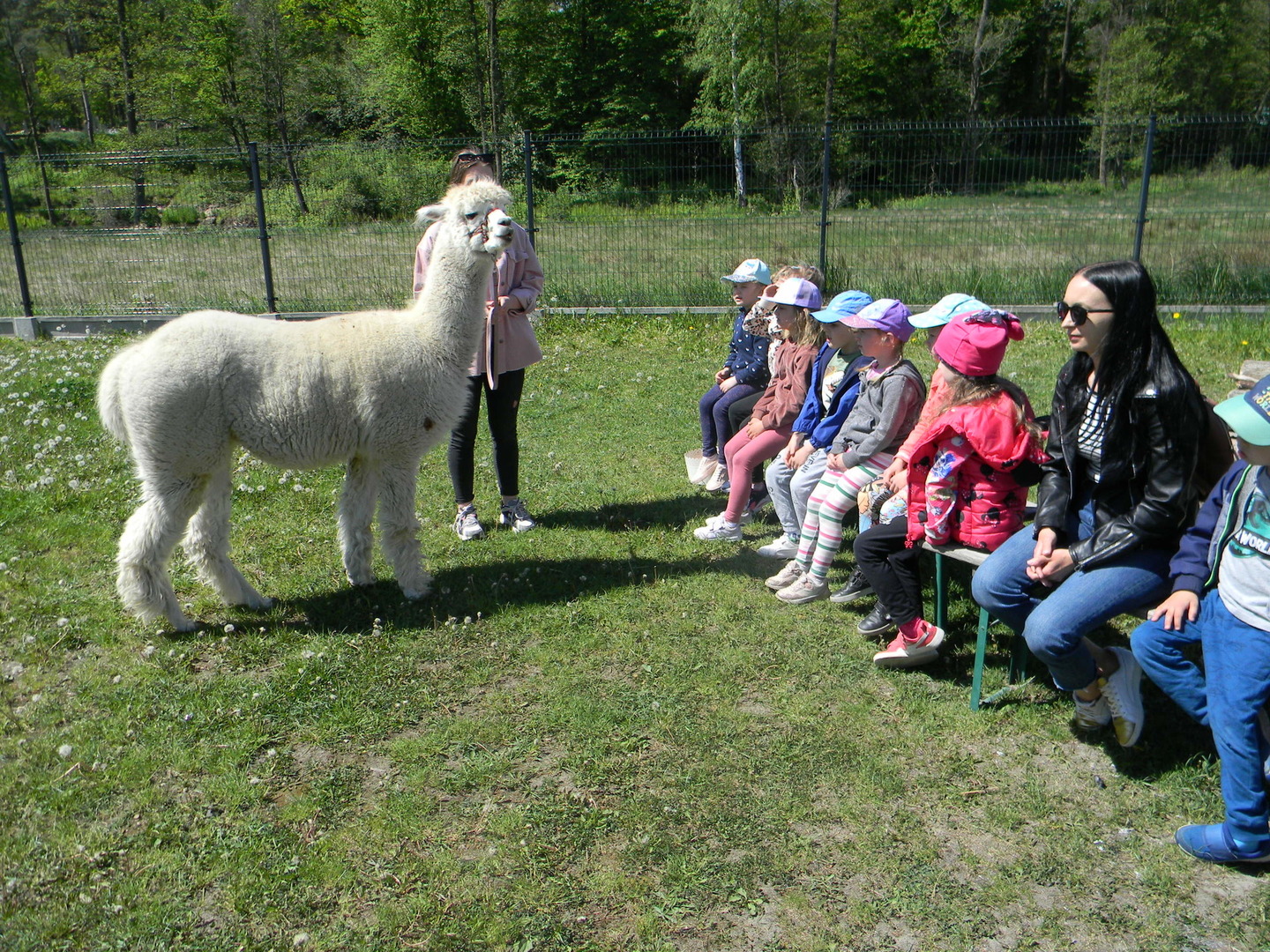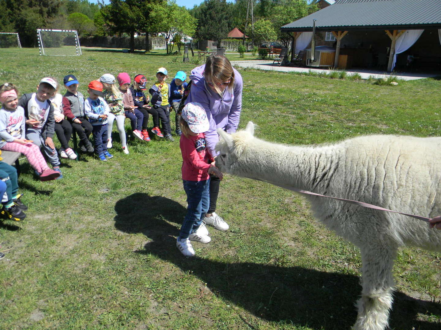 Dzieci słuchają ciekawostek na temat alpak.
