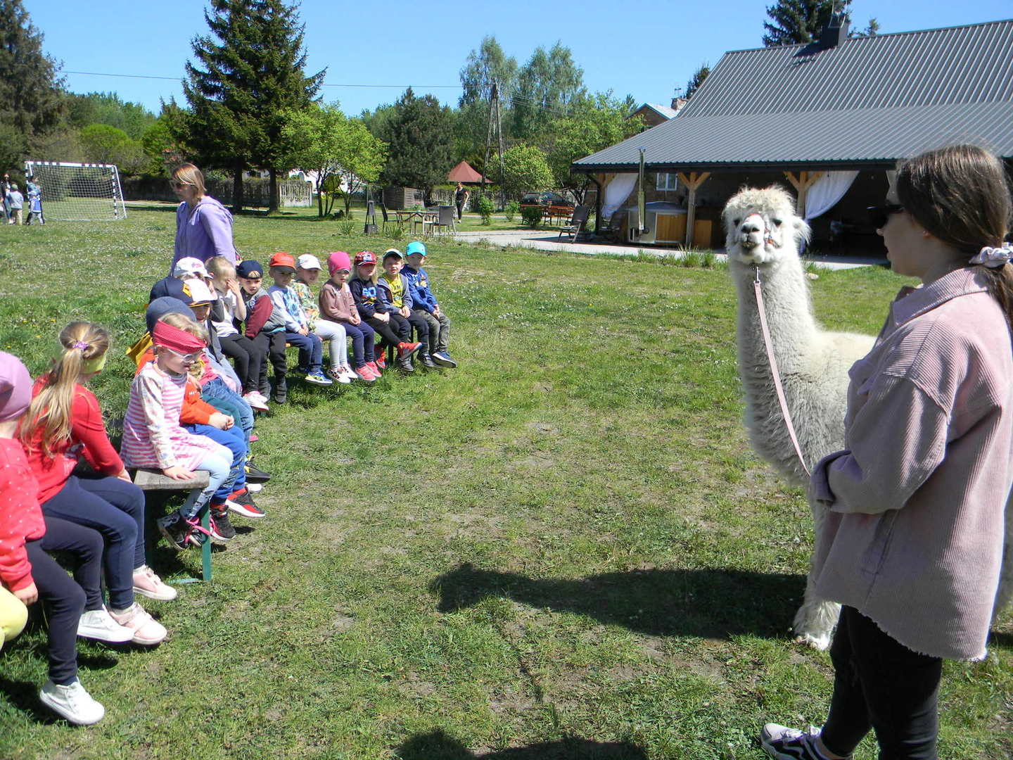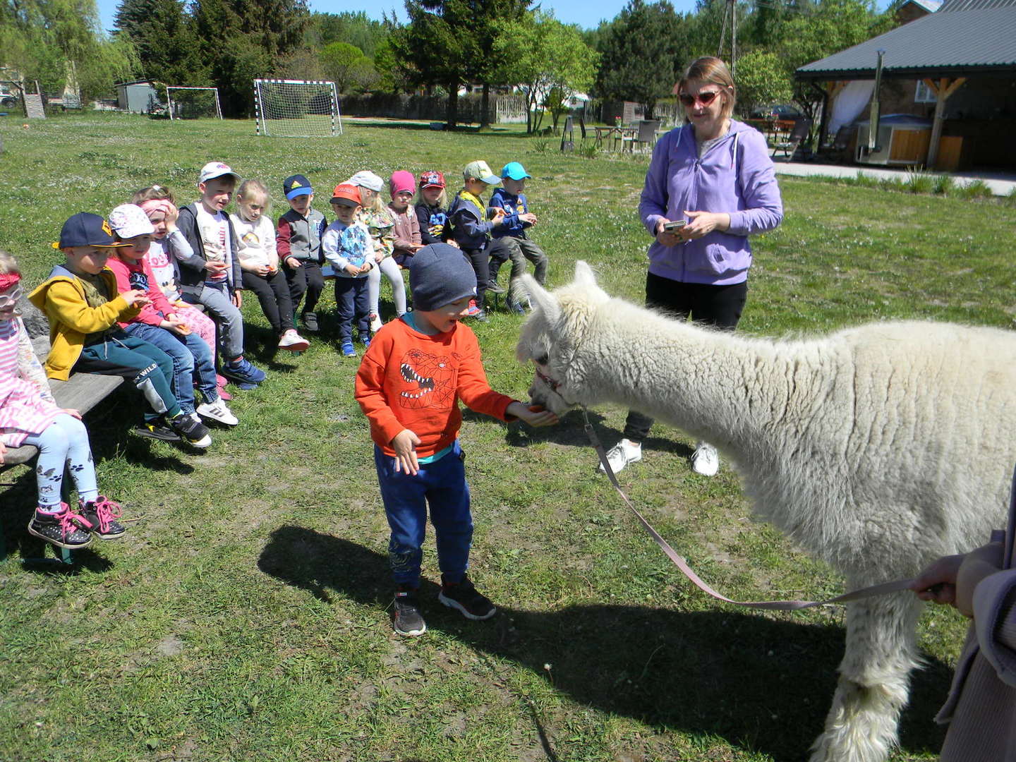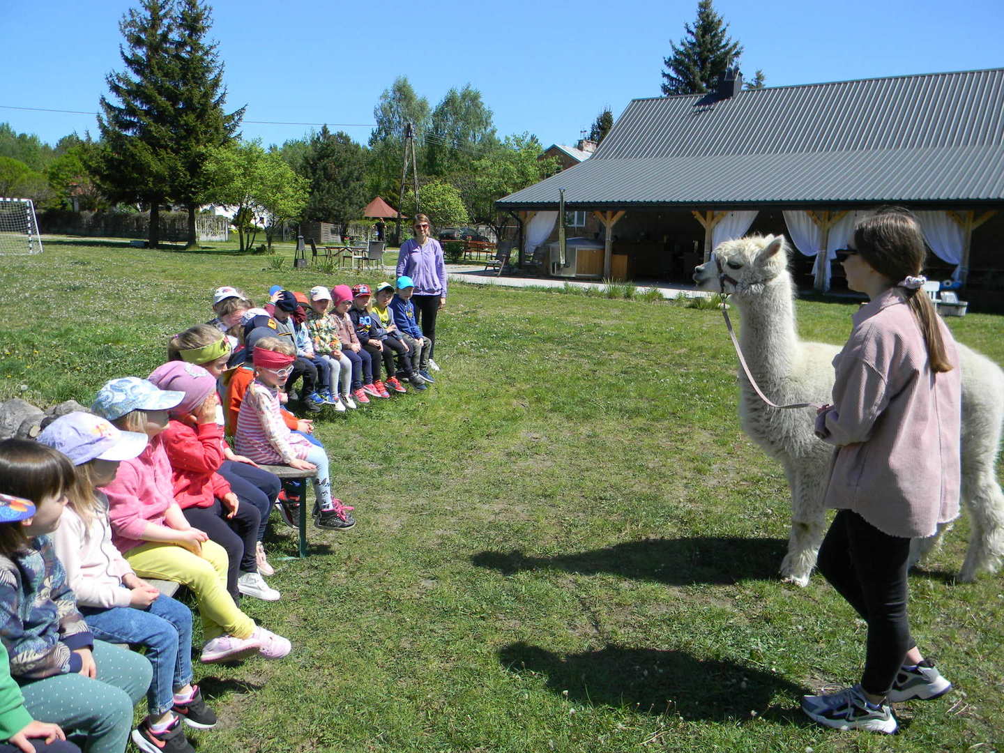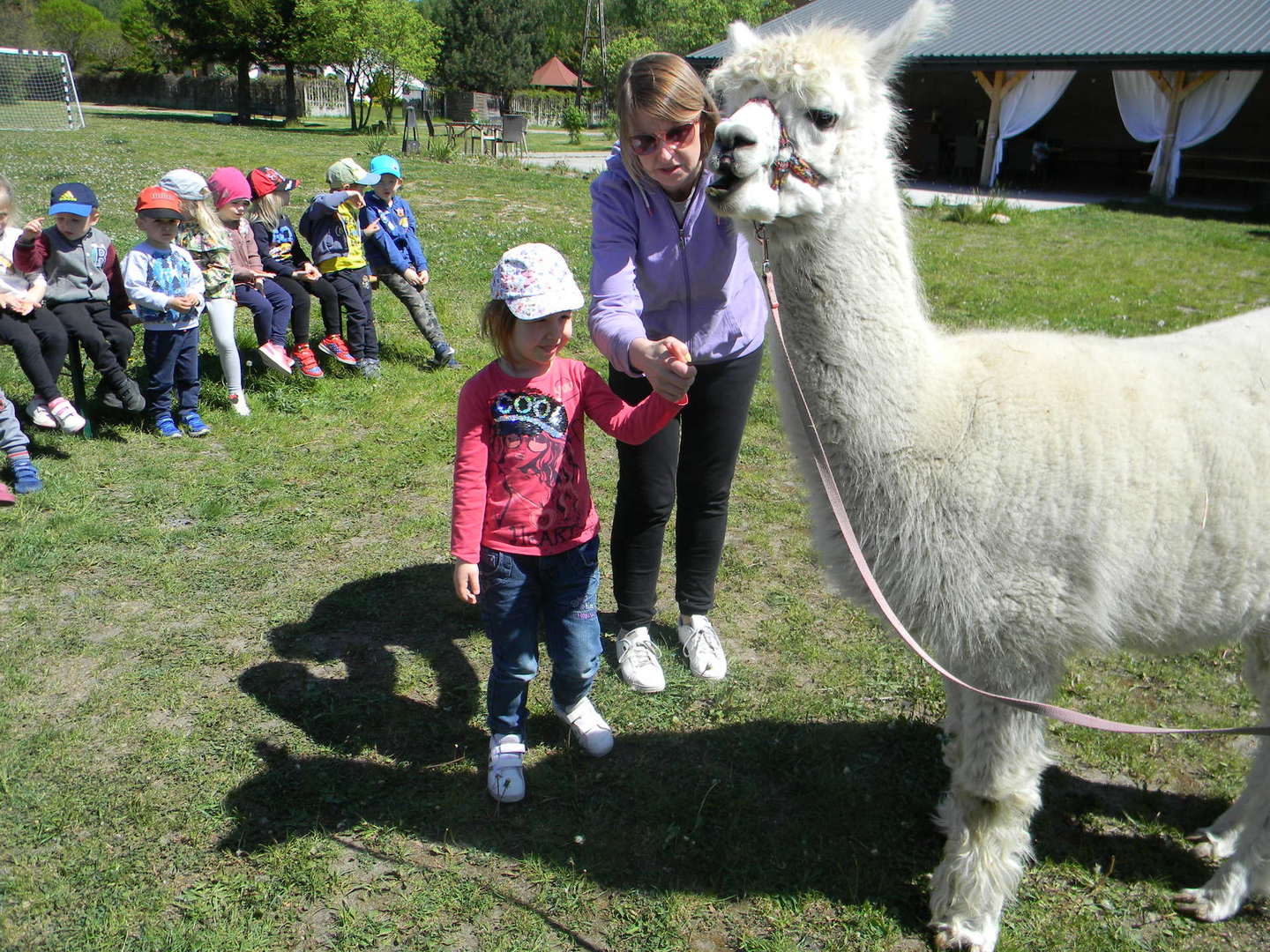 Dzieci słuchają ciekawostek na temat alpak.