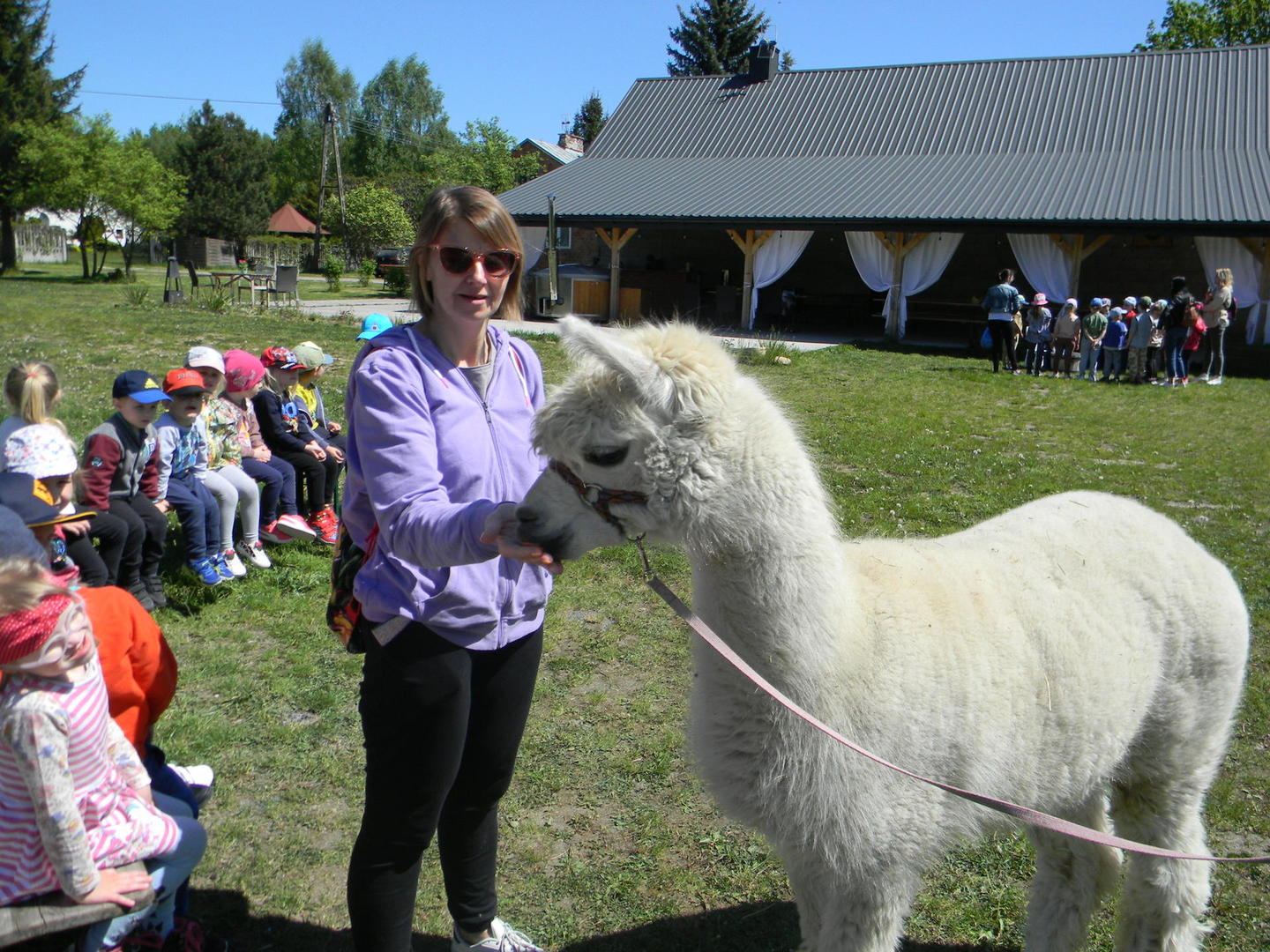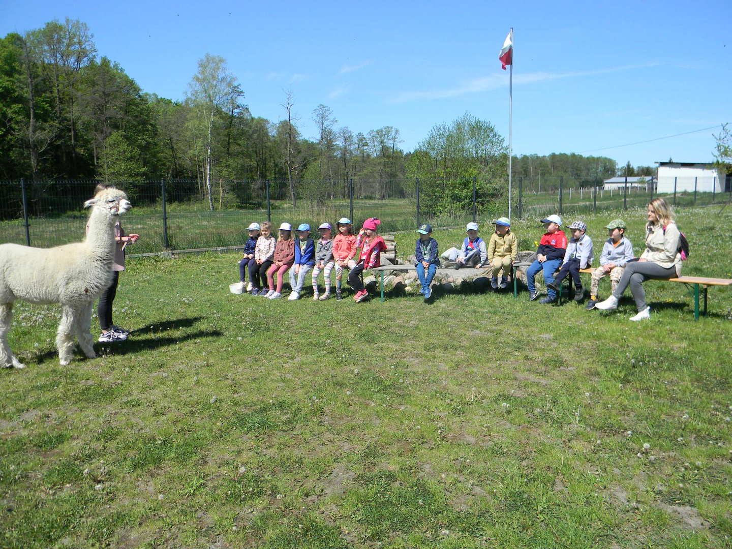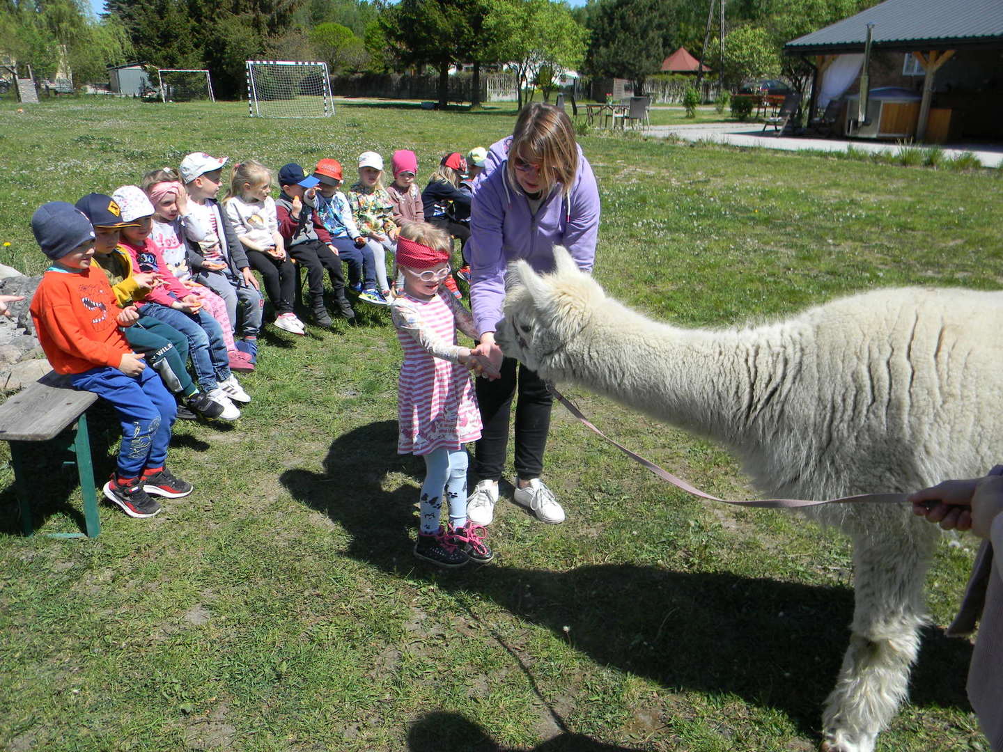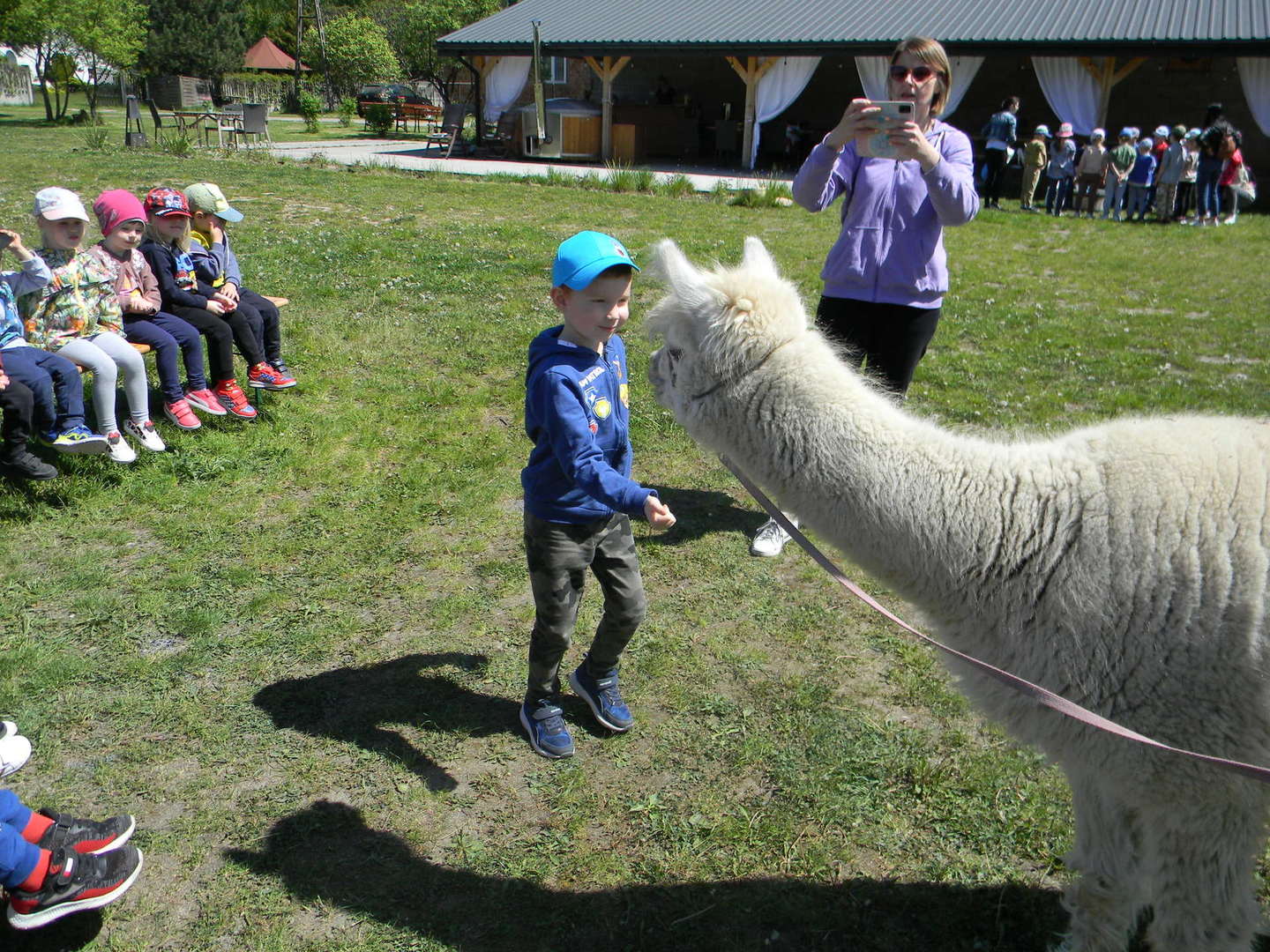 Dzieci słuchają ciekawostek na temat alpak.