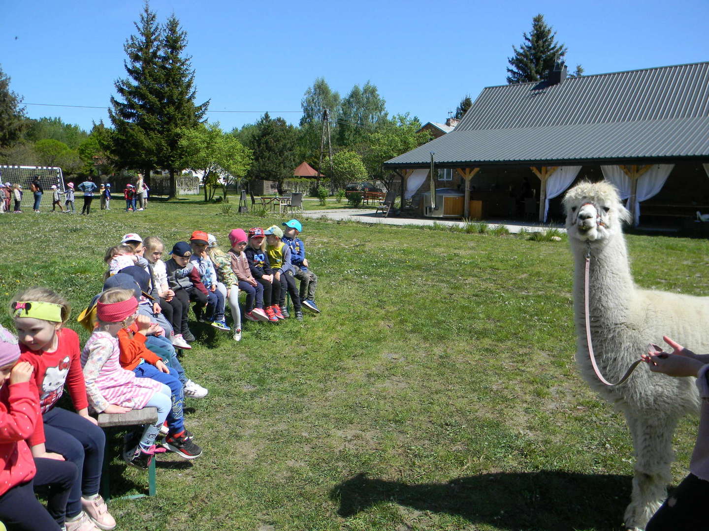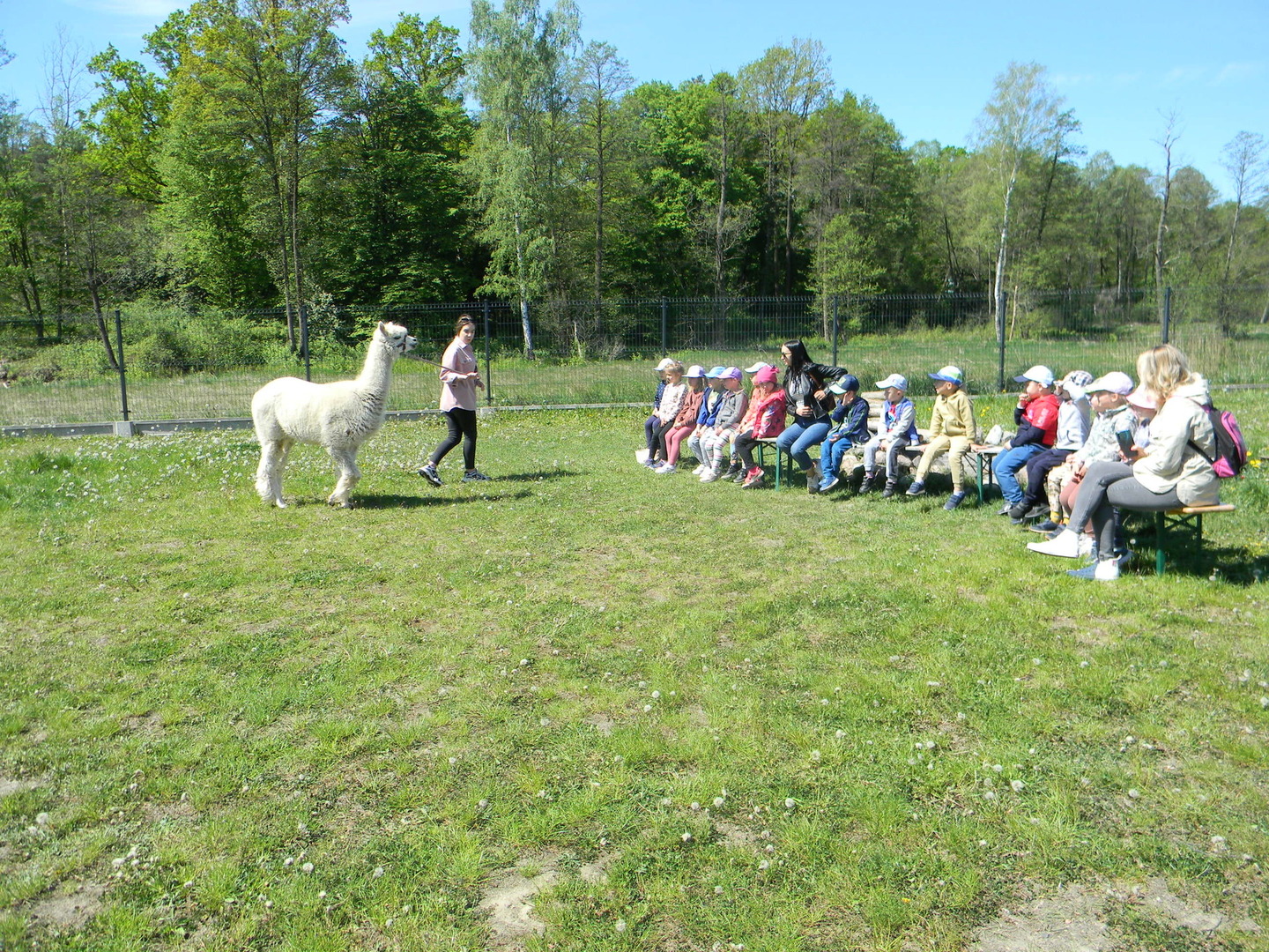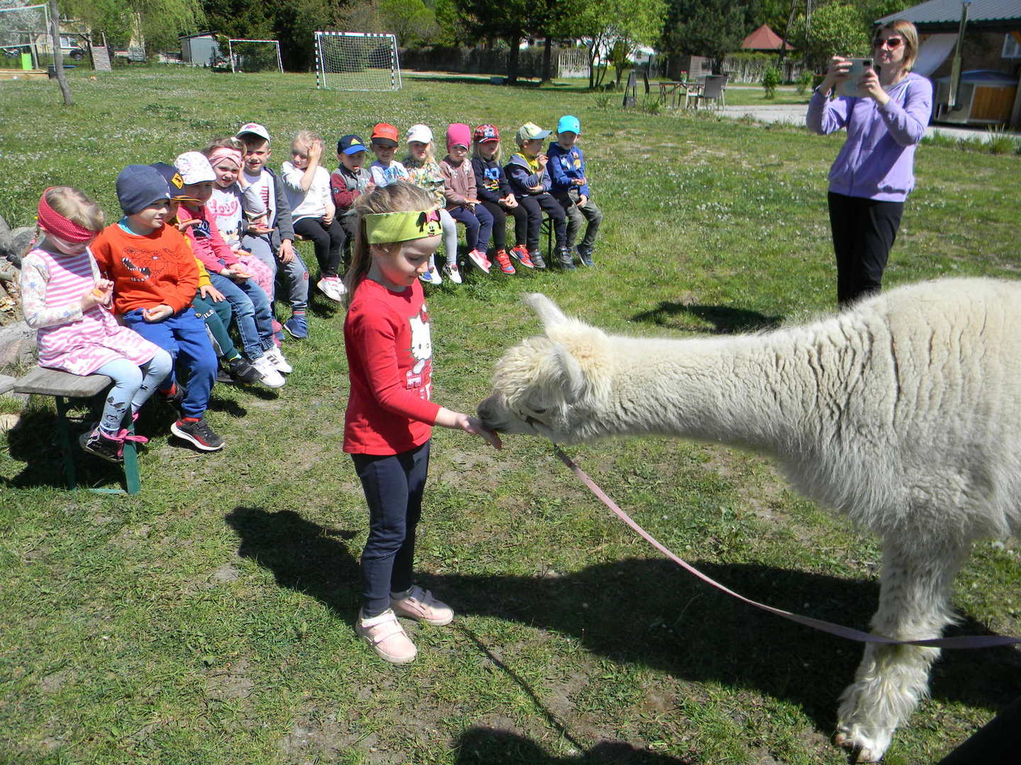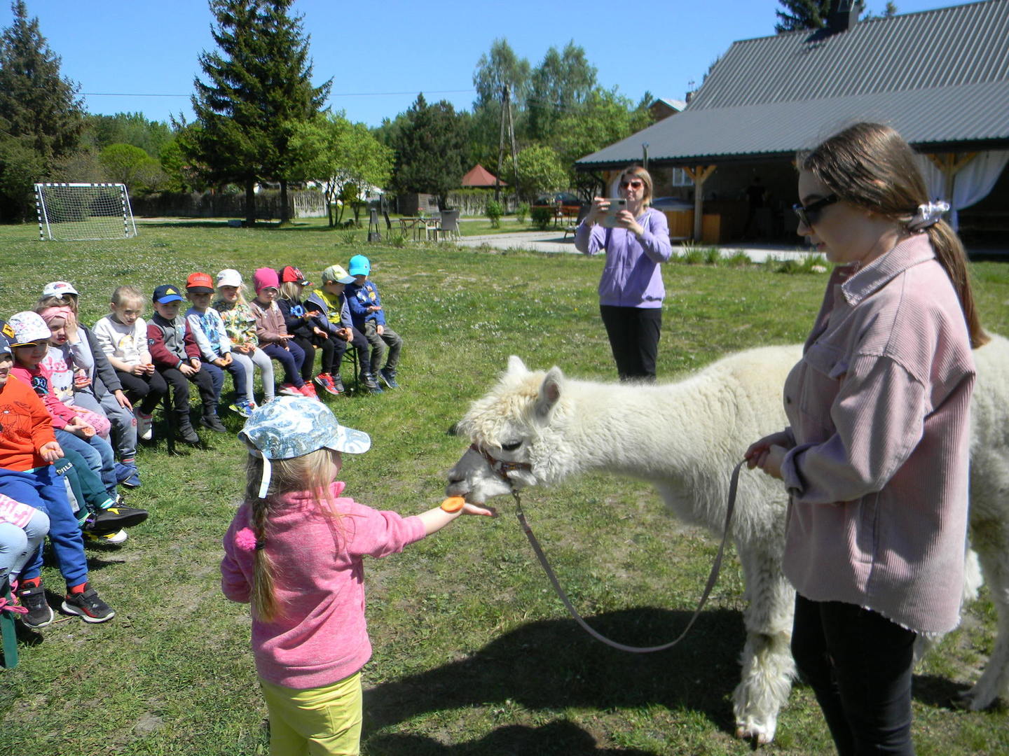 Dzieci słuchają ciekawostek na temat alpak.