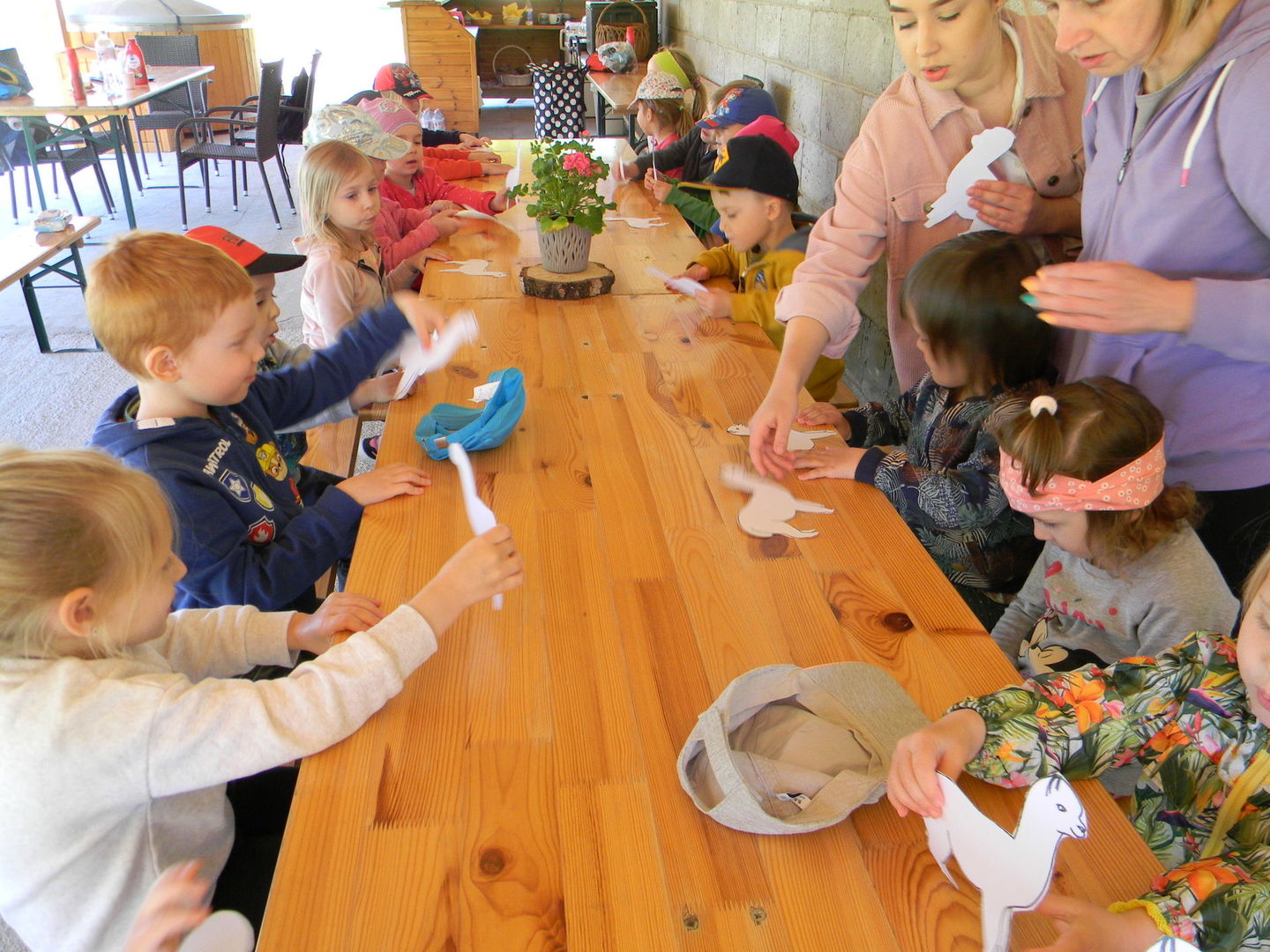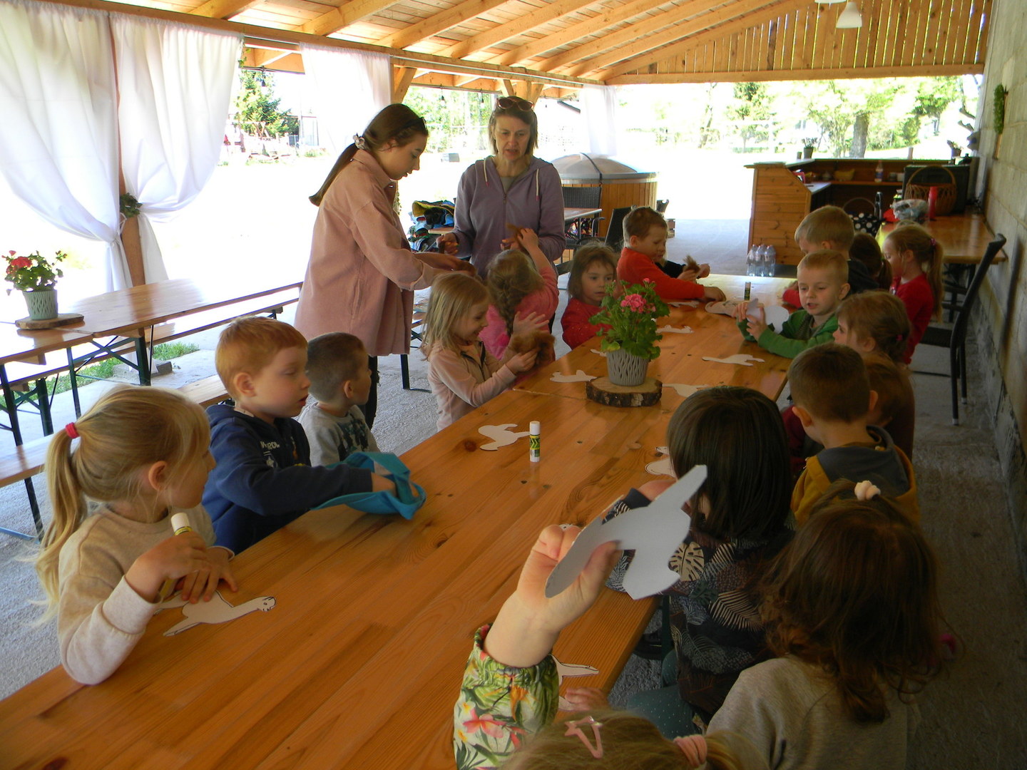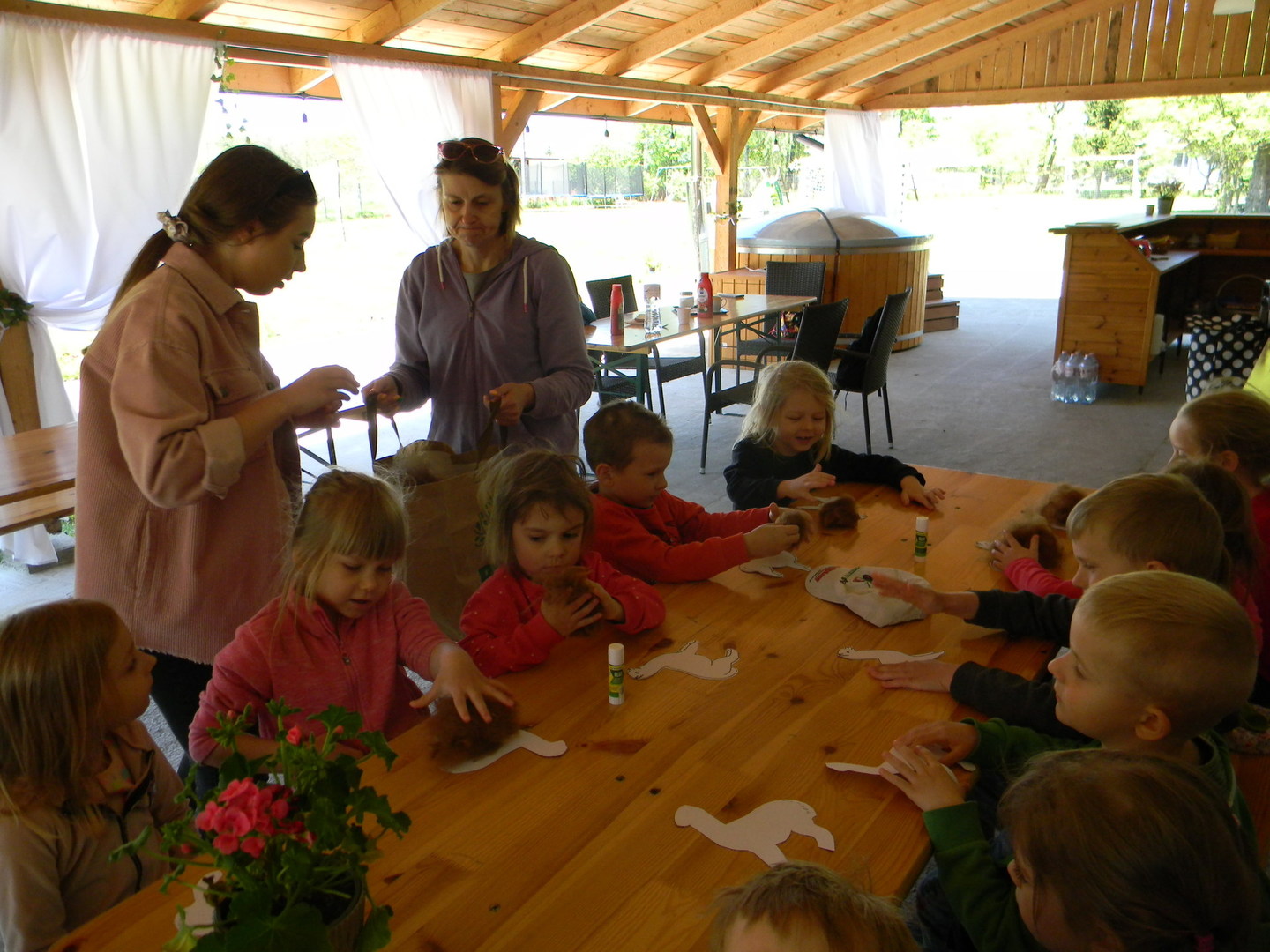 16 maja grupy "Gumisie" i "Muminki" wyjechały na wycieczkę do gospodarstwa agroturystycznego "Akacjowy zakątek" w Pustelniku. Dzieci uczestniczyły w wielu aktywnościach: alpakoterapia, przejażdżka wozem, pranie na tarze, dojenie krowy, strzelanie z łuku, odwiedziny w mini zoo, zajęcia plastyczne, ognisko z kiełbaskami, zabawy na placu zabaw. Pogoda nam sprzyjała, a ciekawe atrakcje wywołały uśmiechy na twarzach wszystkich dzieci.