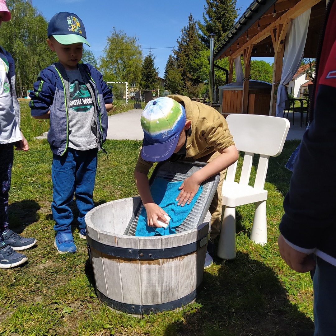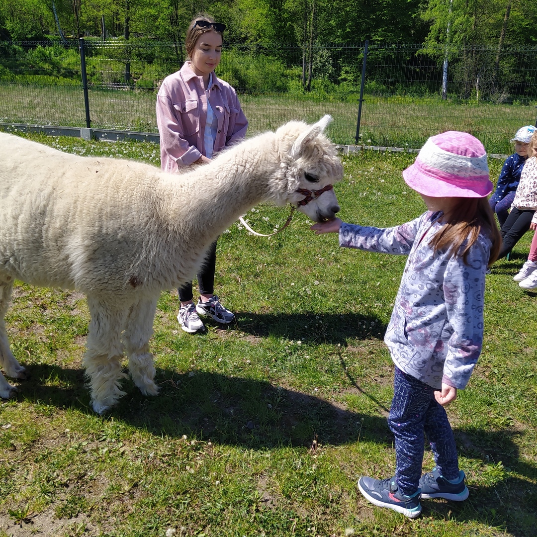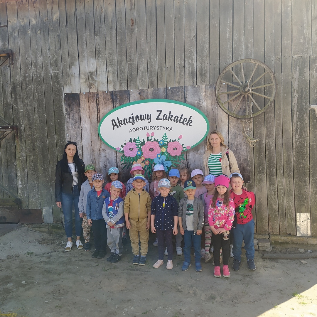 16 maja grupy "Gumisie" i "Muminki" wyjechały na wycieczkę do gospodarstwa agroturystycznego "Akacjowy zakątek" w Pustelniku. Dzieci uczestniczyły w wielu aktywnościach: alpakoterapia, przejażdżka wozem, pranie na tarze, dojenie krowy, strzelanie z łuku, odwiedziny w mini zoo, zajęcia plastyczne, ognisko z kiełbaskami, zabawy na placu zabaw. Pogoda nam sprzyjała, a ciekawe atrakcje wywołały uśmiechy na twarzach wszystkich dzieci.