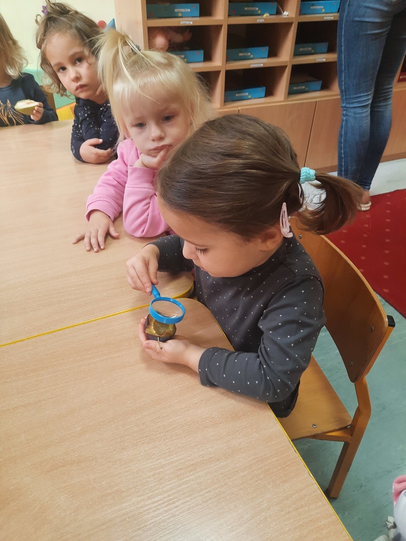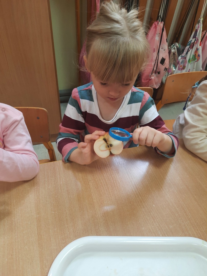 Dziewczynka ogląda owoc przez lupę